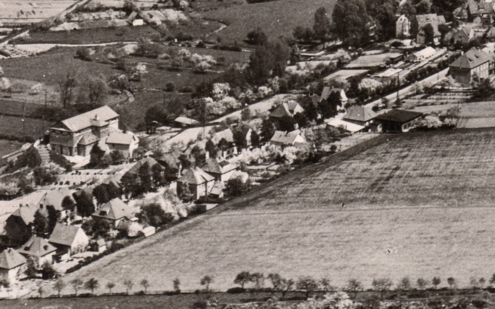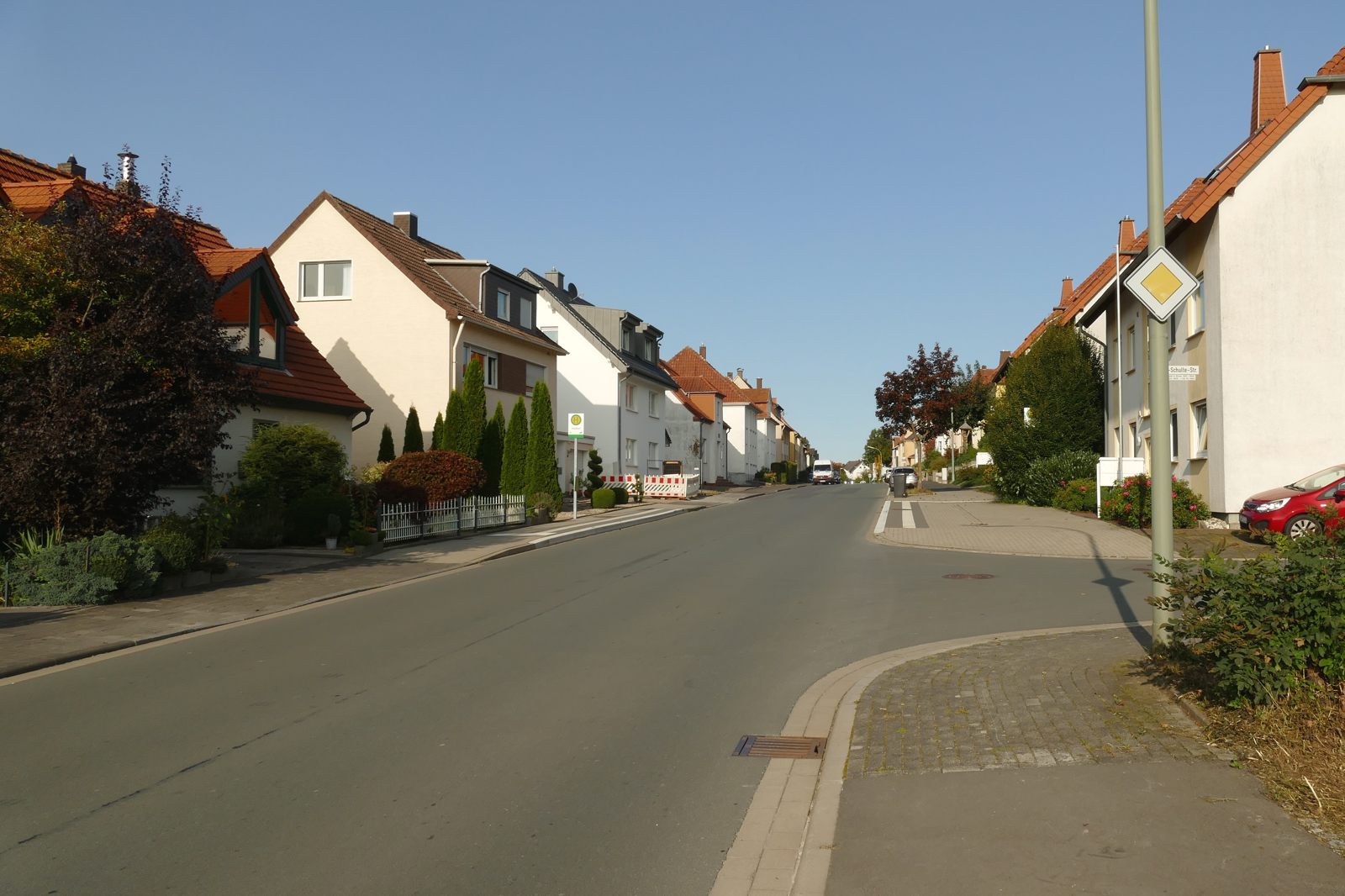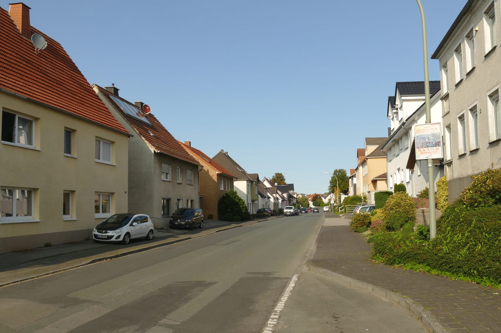 Späte 1960er Jahre, kurz bevor es dunkel wird. Am Nachmittag haben wir im Schnellgang die Hausaufgaben erledigt. Dann ab in den Wald; Kehlberg oder Klostergrund waren angesagt, immer mehrere Kinder oder Jugendliche zusammen. Später dann schnell etwas essen. Wenn der Brenkener Bäcker Hessling frisches Brot gebracht hatte (mittwochs und samstags jeweils 2 bis 3 1500g Brote), dann konnte ich schon ‘mal 4 bis 6 Schnitten vertilgen; mit Leberwurst oder Blutwurst aus der “eigenen Wursterei”. Käse war schon etwas exotischer, den mussten wir kaufen und der war nicht täglich verfügbar. Bananen z. B. waren auch selten auf dem Tisch. Äpfel und Birnen oder Pflaumen hatten wir ja selbst im Garten; in Holthaus Garten waren die leckersten Birnen am Baum. Entweder auf den Pfosten mit der spitzen Eisenstange klettern und sich sehr, sehr lang machen, oder sehr vorsichtig in den Baum einsteigen. Sich nur nicht erwischen lassen! So , jetzt aber zurück zum Anfang. Nach der späten Nachmittagsmahlzeit ging es noch einmal auf die Straße. Es wurde Fussball gespielt. Einer stand in unserer Garageneinfahrt, der andere auf der Gegenseite im Graben. Dort am Hang unter Nietmanns Haus (einen Bürgersteig gab es nur auf unserer Seite) waren zwei kleine “Torpfosten” (Steine o. ä.) im Gras gebaut worden. Die Plastikbälle wurden nun hin und her geprügelt. Verkehr störte nicht, die kamen deutlich weniger Autos als heute vorbei. Wenn wir die Pfosten nicht mehr sahen, war Schluss. Oder wir spielten noch länger direkt auf der Fahrbahn unter den Straßenlaternen. Niemanden hat dieses Spiel gestört.
