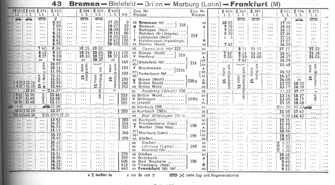 Damals führte der Heckeneilzug F – HB zwei Kurswagen auf der Main-Weser-Bahn mit sich, und zwar sowohl auf der Hin- wie auch der Rückfahrt. Der nordwärts fahrende Eilzug, der mit einer Lok der BR 141 bespannt war, führte zwei Kurswagen nach Kassel mit. Die Zugtrennung erfolgte in Marburg auf Gleis 8. Der Eilzug hatte bei der Ankunft in Marburg insgesamt acht Wagen (einschl. Gepäckwagen) dabei. Nach der Trennung fuhr der eigentliche Heckeneilzug mit einer Lok der BR 216 und sechs Wagen in Richtung Korbach – Paderborn – Bremen über die Nebenbahn. Nachmittags um 15 Uhr war es genau umgekehrt: Der N aus Kassel mit zwei Kurswagen setzte sich in Marburg vor den abgespannten Bremer Heckeneilzug und fuhr nach Frankfurt mit insgesamt acht Wagen weiter!