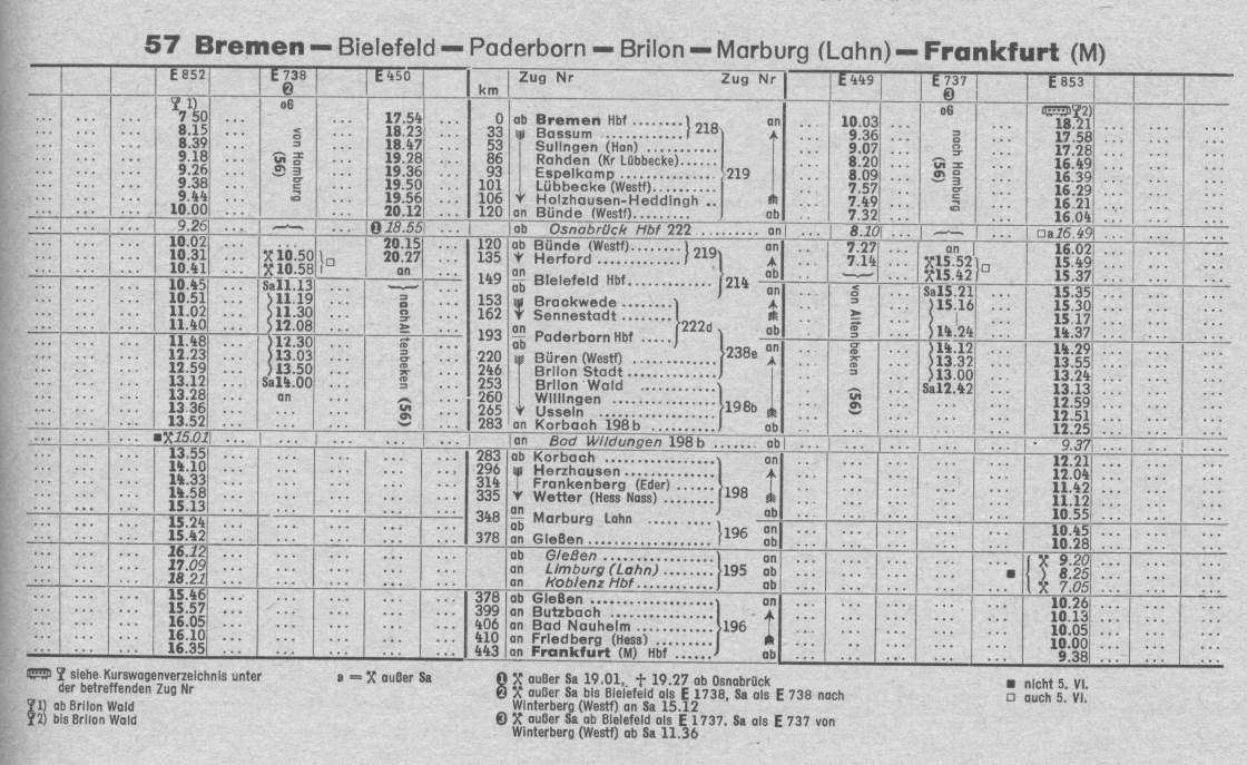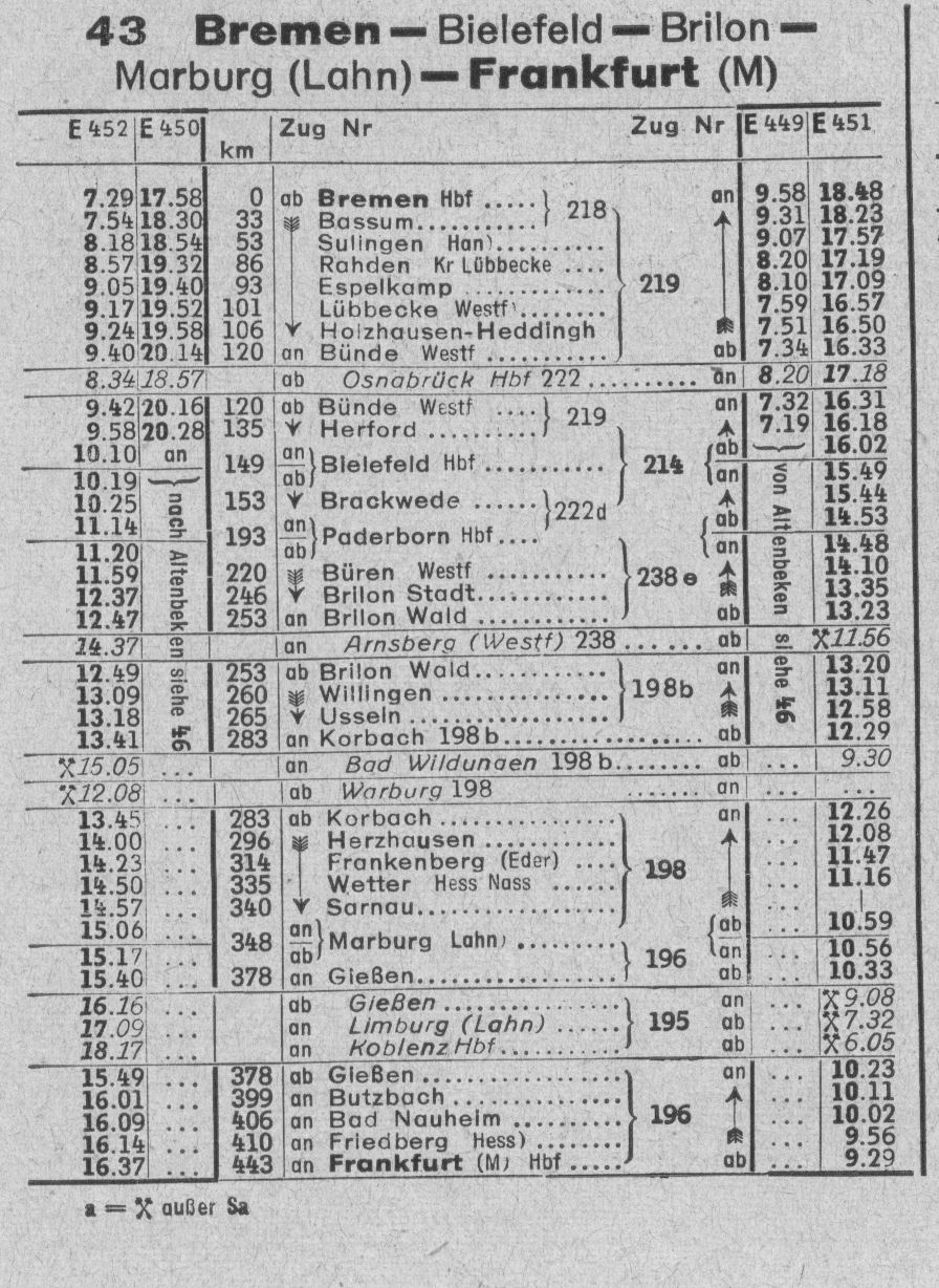 Der Heckeneilzug Frankfurt-Bremen wurde zu unterschiedlichen Zeiten mit unterschiedlichen Loks gefahren. Im Jahre 1958 habe ich diesen Lokplan gefunden: