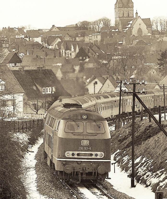 Sommer 1965. Ich bin 11 Jahre alt. Schulschluss, es ist kurz vor Mittag. Um 11.59 Uhr soll der Eilzug Bremen-Frankfurt in Büren einlaufen. Ich habe noch ein paar Minuten, dann kann ich ihn wunderbar sehen, wie er 350m von uns entfernt auf der Heide am VEW-Umspannwerk vorbeifährt. Unser Küchenfenster liegt im oberen Stock, die Aussicht ist prima. Ja, das Pfeifen der V100 ertönt am Bahnüberweg Menkenberg, da rollt er an mir vorbei. 6 lange Eilzugwagen schleppt die Diesellok hoch ins Sauerland. Eine kleine Weltreise. Um 7.29 Uhr ist der E452 in Bremen Hbf gestartet, um 16.37 Uhr wird er in Frankfurt Hbf einlaufen. Da kannst du gewissermaßen die Uhr nach stellen. Mehr als neun Stunden in den Wagen aushalten müssen? Nein, du darfst über neun Stunden in diesem tollen “Bummelzug” über 443km mitfahren. Du wirst sogar bedient. Es kommt jemand mit einem Rollwagen durch die Gänge und verkauft dir Kaffee, Tee, Wasser, Limonade oder Süßigkeiten. Mit ca. 60km/h fährt der Zug von Bremen über Bassum, Sulingen, Rahden, Espelkamp, Lübbecke, Heddinghausen, Bünde, Herford, Bielefeld, Brackwede, Paderborn, Büren, Brilon, Willingen, Usseln, Korbach, Herzhausen, Frankenberg, Wetter, Sarnau, Marburg, Gießen, Butzbach, Bad Nauheim, Friedberg nach Frankfurt. Bedingt durch die vielen kurzen Aufenthalte und die zumindest früheren Lokwechsel sinkt die Reisegeschwindigkeit auf 48km/h an diesem Dienstag im Jahre 1965. Der Gegenzug benötigt sogar sieben Minuten länger; er startet um 9.29 Uhr in Frankfurt und läuft 18.48 Uhr in Bremen ein. Um 14.10 Uhr wird er hier in Büren Halt machen. D. h., ich sehe den Zug um 14.08 Uhr auf der Heide vorbeirauschen! Hinter der Diesellok laufen heute ein Postwagen, ein Gepäckwagen und vier silberne Eilzugwagen. Wie gern würde ich dort sitzen und mitfahren. Nur, zeit meines Lebens war ich nie Fahrgast in meinem schönen Heckeneilzug. So habe ich ihn auf meiner Anlage nachgestellt; ‘mal läuft er mit ‘ner V100, ‘mal mit ‘ner 50er Dampflok in Büren ein. Mal ehrlich, wenn die Lokpfeife der Roco-Lok ertönt, bilde ich mir jetzt noch ein: genauso schmetterte eine 50er vor dem Heckeneilzug und speziell vor Güterzügen in den 1960er Jahren den Ton heraus. In der Dämmerung oder im Dunkeln an Wintertagen konnte einem kleinen Knirps Angst und Bange werden, wenn die Lok neben dir vorbeidonnerte und die Lokpfeife dich erschauern ließ.