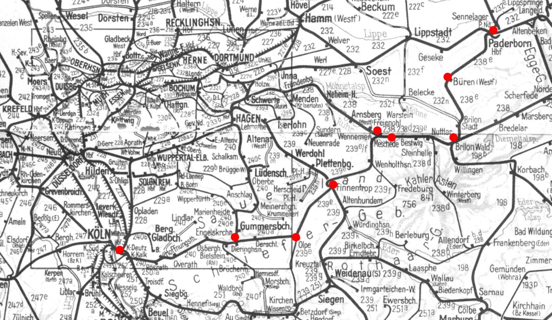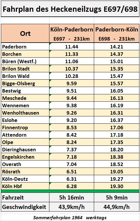 Von Mai 1963 bis Mai 1965 fuhr zwischen den beiden Bischofsstädten Paderborn und Köln ein Eilzugpaar, der E697/698, über die Almetalbahn. Die Züge waren mit Diesellokomotiven der Baureihe V100.10 bespannt und i. d. R. mit drei Eilzugwagen vom Typ “Silberling” unterwegs. Wegen der Bischofsstädte als Start- und Zielort sprach man auch vom “Kardinalsexpress”. Der Zuglauf führte durch das Sauerland (siehe Karte) und wurde wegen fehlender Nachfrage nach zwei Jahren wieder eingestellt. Fahrpläne lagen mir leider nur unvollständig vor. Dank des Teams von der Miniaturwelt Eslohe (Kaspar!) ist der Sommerfahrplan nun vollständig. Heute sind Teile der alten Strecke stillgelegt oder als Radweg ausgebaut. Eine Radtour auf dem Sauerland Radring Nordschleife lässt die alte Streckenführung tw. erkennen bzw. erahnen. Einzelne historische Wandtafeln geben interessante Hinweise zur ehemaligen Bahn dort.