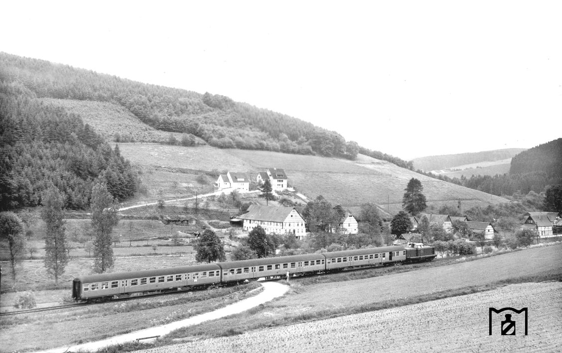 Das erste Eilzugpaar von Bremen nach Frankfurt und umgekehrt startete mit dem Sommerfahrplan im Mai 1949. Es trug den Namen E151/E152. Für unsere Region von Brilon bis Paderborn war es ein Fortschritt, konnte man doch nun direkt zu den Eisenbahnknotenpunkten im Norden und Süden gelangen. Anfangs wurden auf dem Nordabschnitt Bremen bis Paderborn fast ausschließlich Loks der Baureihe 38 eingesetzt, zwischendurch angelöst durch die BR23, später ersetzt durch die BR03. Im bergigen Mittelabschnitt der 443km langen Strecke wurden die Dampoflokomotiven der BR50 verwendet. Auf dem Südabschnitt Marburg – Frankfurt (Main) gab es wieder diverse Baureihen, die als Zuglok dienten: BR23, BR39, BR01. Ab 1953 lief das Eilzugpaar unter der Nummer E4151/452, die zum Ende noch einmal geändert wurden (E852/E853 und E1762/E1763 ab 1969/1970). Nach dem Aus der Dampflokomotiven als Zuglok für den Heckeneilzug im Jahre 1965 wurden Dieselloks der BR V100.20 mit einem 1350PS Motor eingesetzt. An Wochenenden und Feiertagen hatte der Zug ein höheres Gewicht. In diesen Fällen fuhr die DB mit V100.20 in Doppeltraktion, um die Fahrzeiten einhalten zu können. Später erstzte man die V100.20 durch die 1900PS starke BR216. Nun konnte auch die Doppeltraktion entfallen.