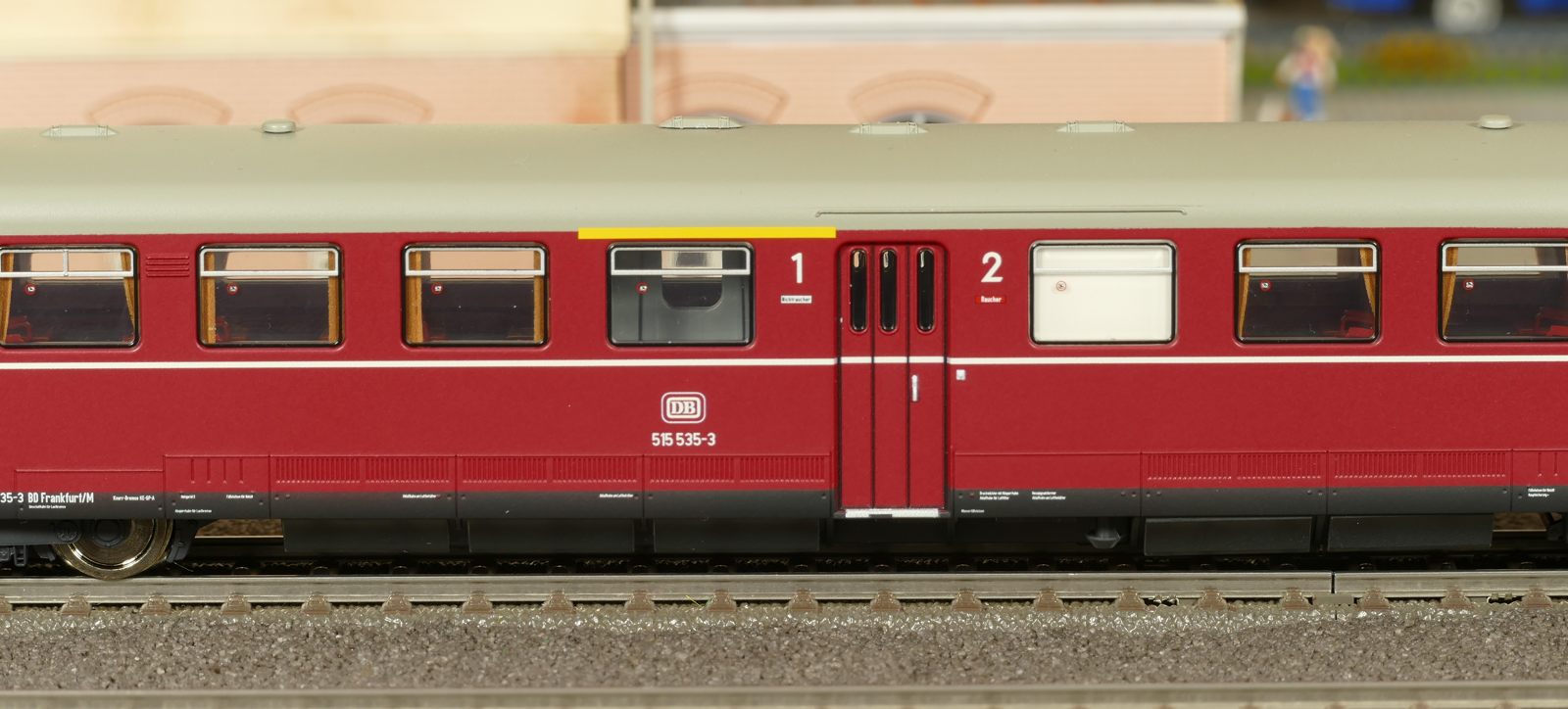 Akkutriebwagen Baureihe 515 mit Steuerwagen Baureihe 815 der Deutschen Bundesbahn in roter Lackierung.