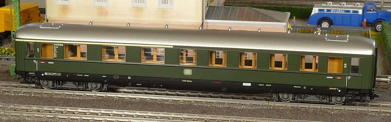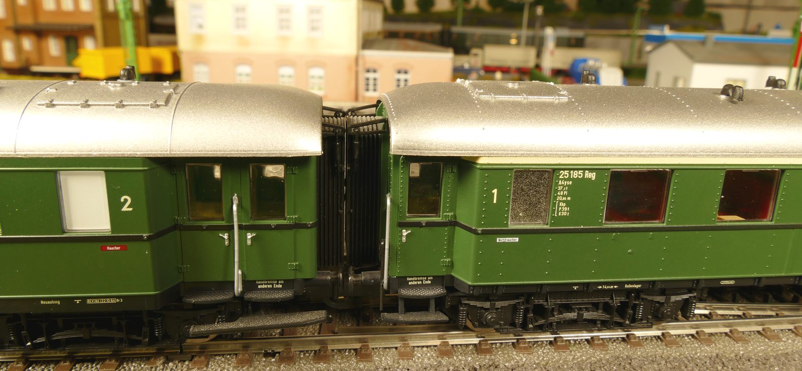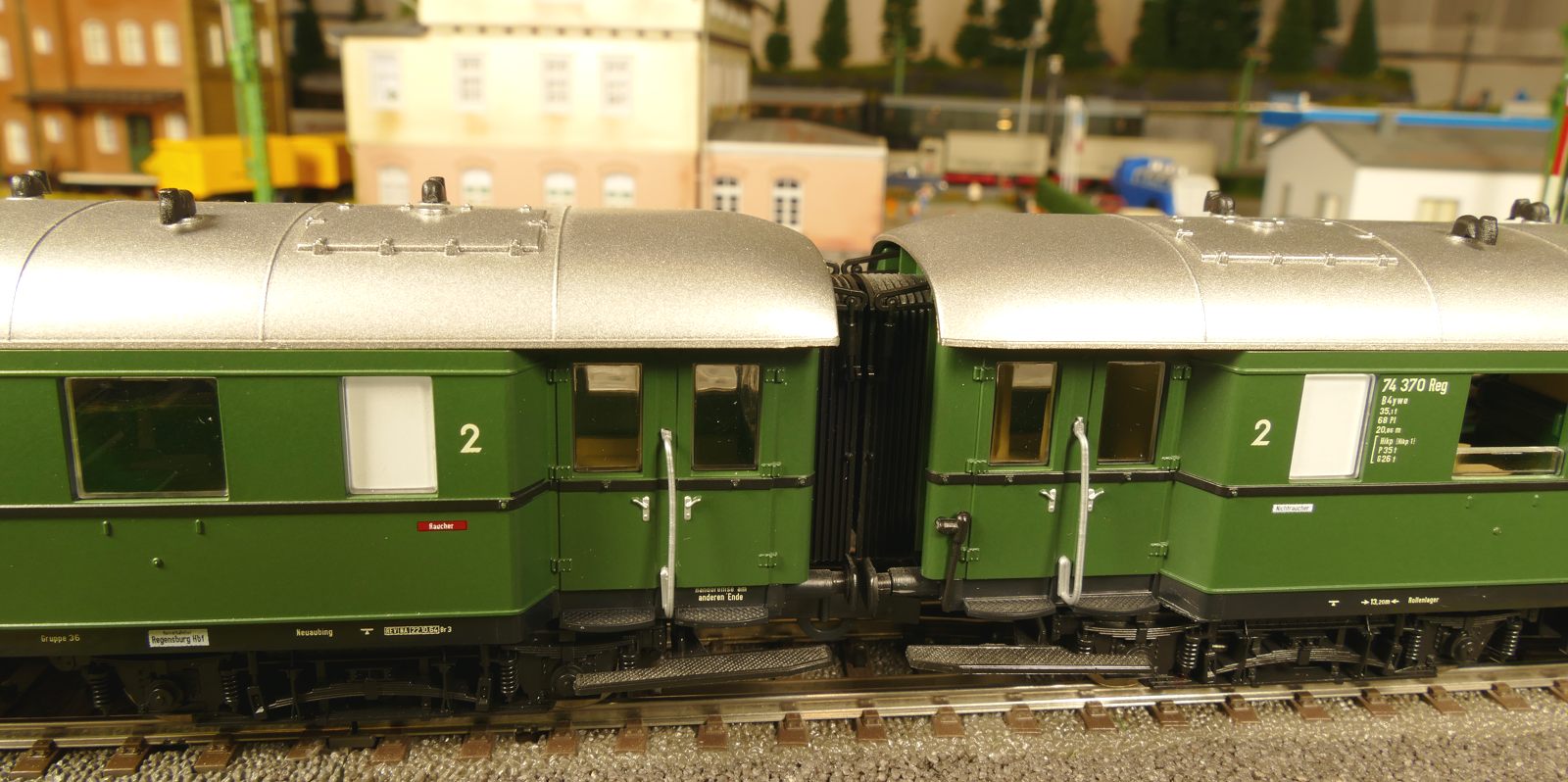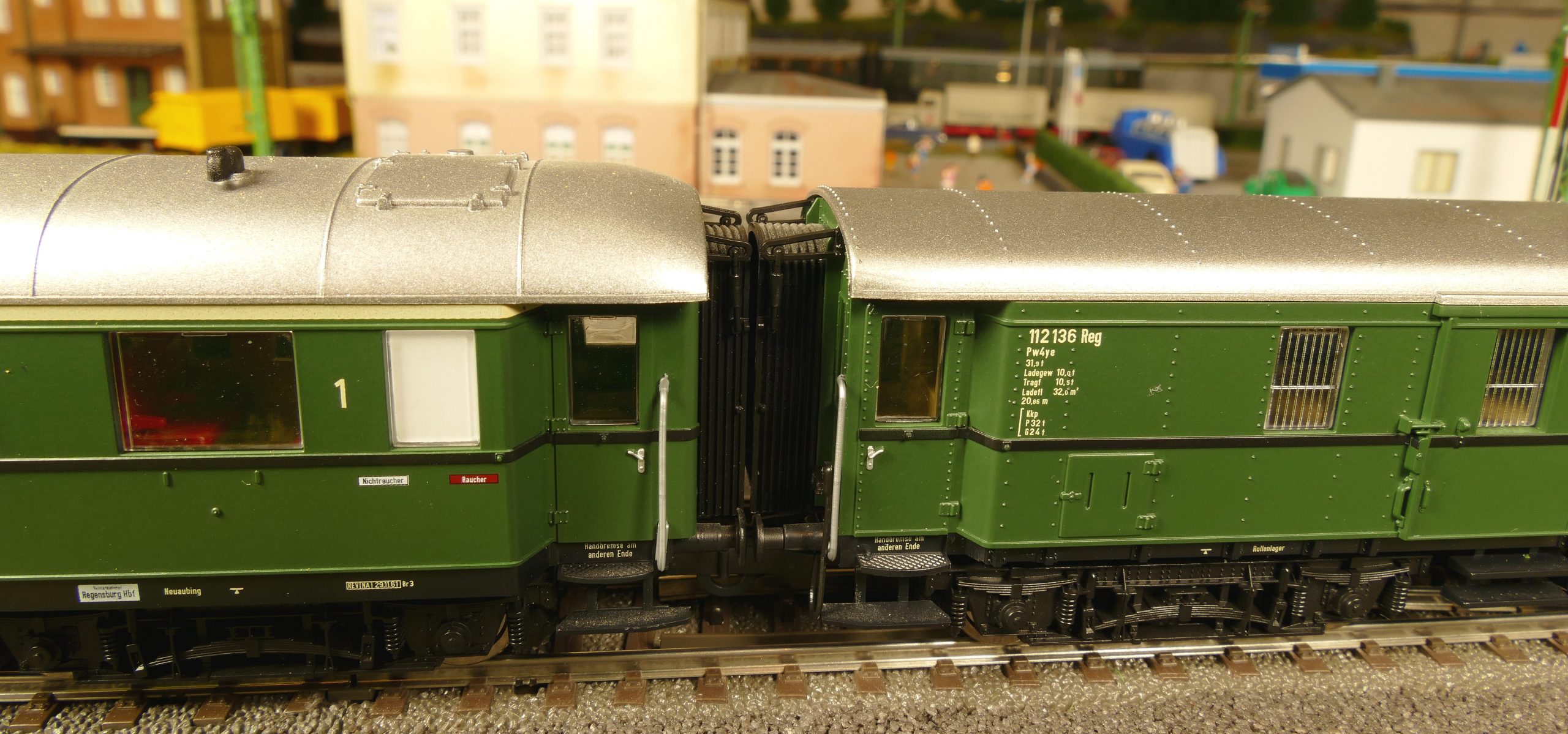 Ich zeige hier einen insgesamt 6-teiligen Roco-Eilzug: Gepäckwagen 44549, zwei 1. Klasse-Wagen 44548, einen 1./2. Klasse-Wagen 44547 und zwei 2. Klasse-Wagen 44546. Alle Wagen sind komplett zugerüstet und mit Roco-Kurzkupplungen ausgestattet. Ausnahme: der Gepäckwagen besitzt vorn die Märklin-Kurzkupplkung, damit der Zug mit allen Loks kompatibel ist.