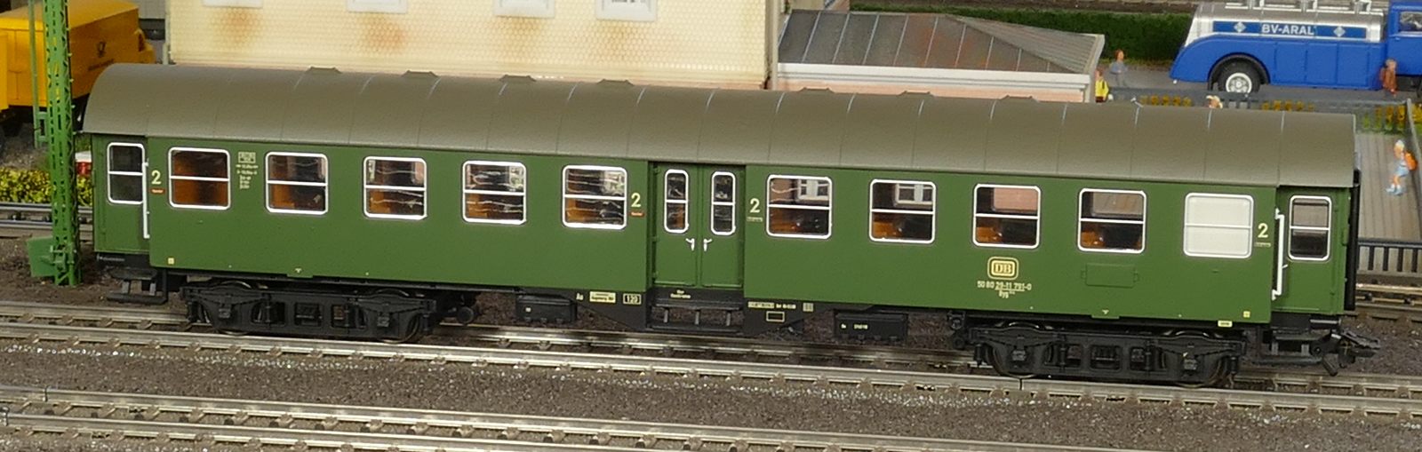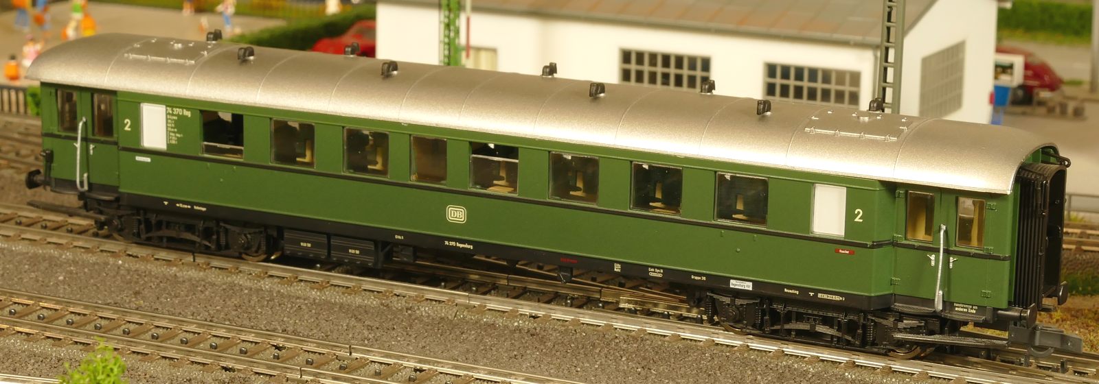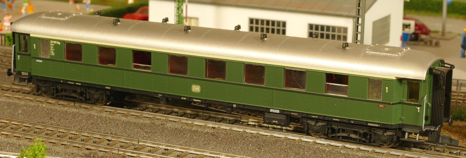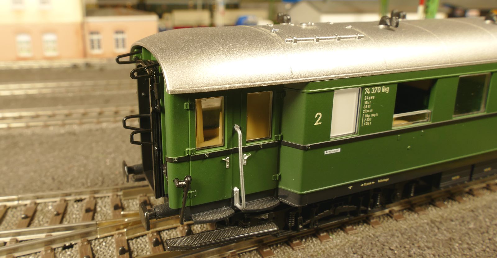 Ich zeige hier einen insgesamt 6-teiligen Roco-Eilzug: Gepäckwagen 44549, zwei 1. Klasse-Wagen 44548, einen 1./2. Klasse-Wagen 44547 und zwei 2. Klasse-Wagen 44546. Alle Wagen sind komplett zugerüstet und mit Roco-Kurzkupplungen ausgestattet. Ausnahme: der Gepäckwagen besitzt vorn die Märklin-Kurzkupplkung, damit der Zug mit allen Loks kompatibel ist.