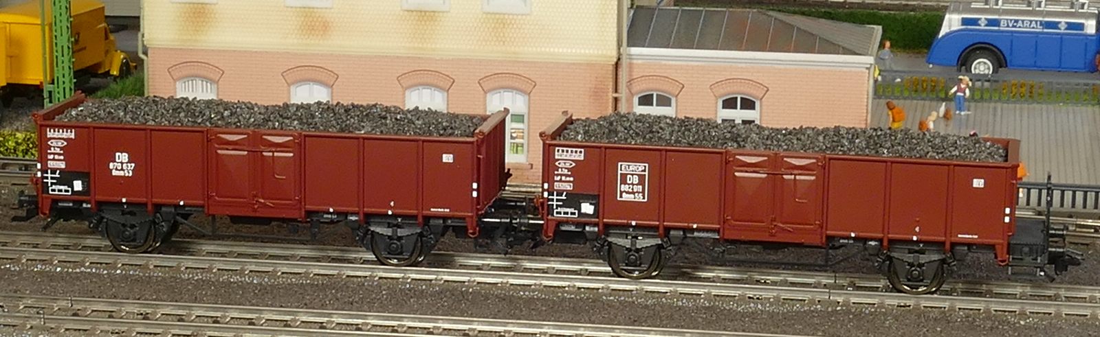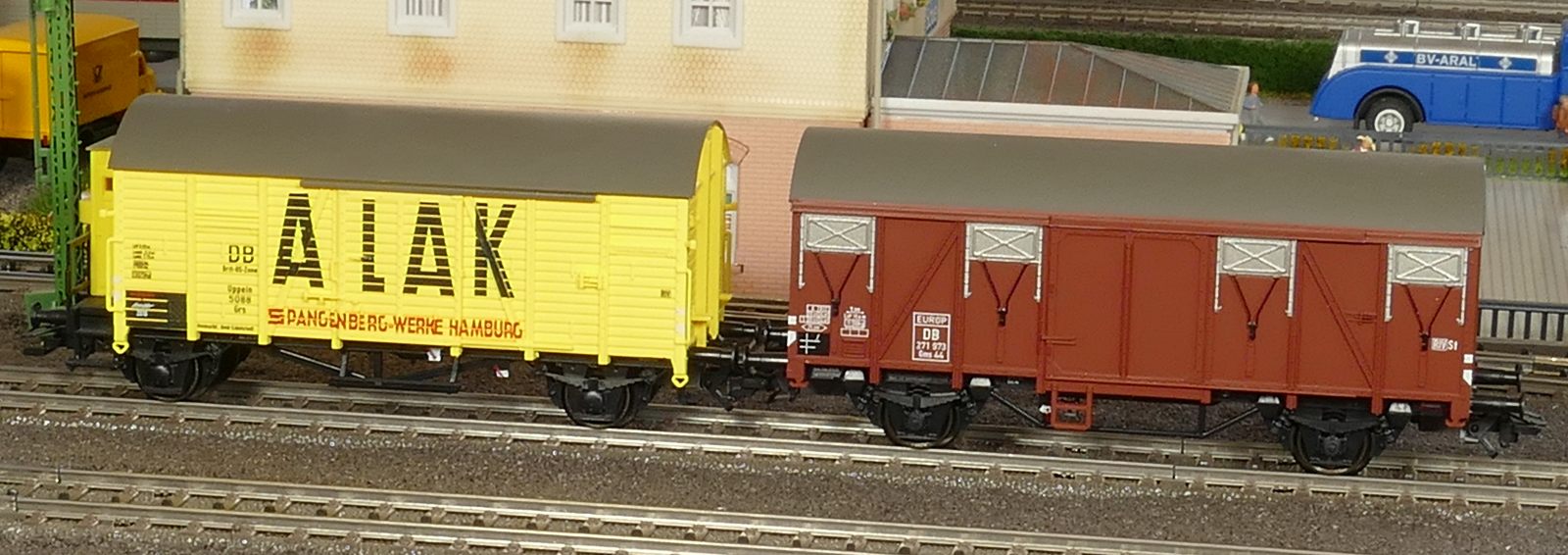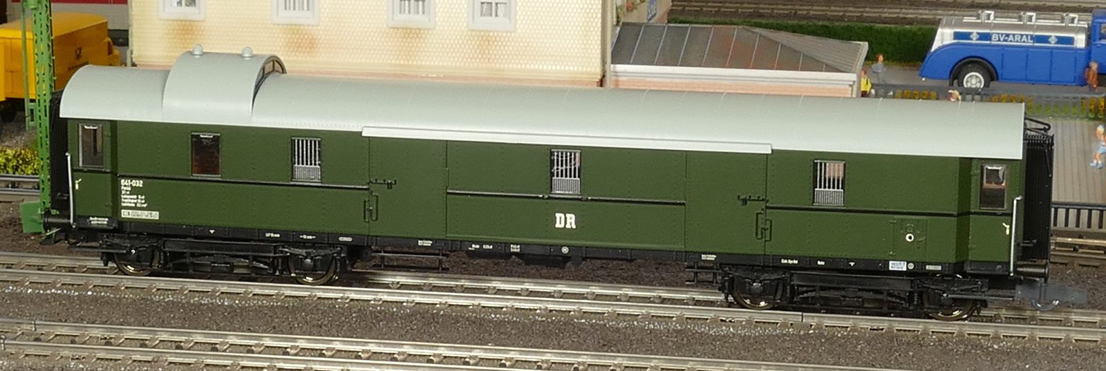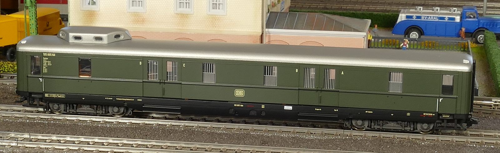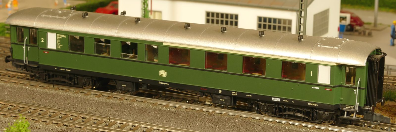 Ich zeige hier einen insgesamt 6-teiligen Roco-Eilzug: Gepäckwagen 44549, zwei 1. Klasse-Wagen 44548, einen 1./2. Klasse-Wagen 44547 und zwei 2. Klasse-Wagen 44546. Alle Wagen sind komplett zugerüstet und mit Roco-Kurzkupplungen ausgestattet. Ausnahme: der Gepäckwagen besitzt vorn die Märklin-Kurzkupplkung, damit der Zug mit allen Loks kompatibel ist.