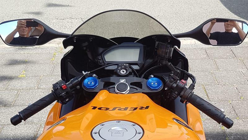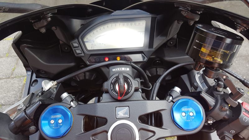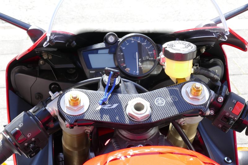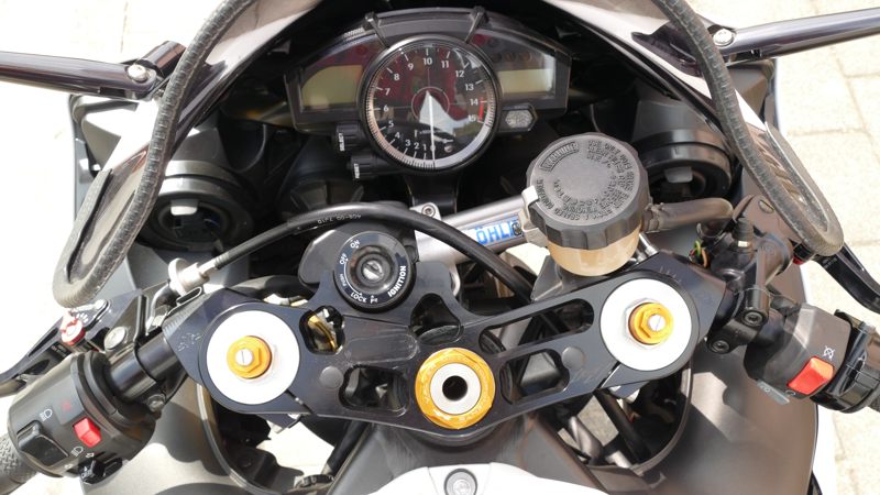 2. Der ABM Multi-Clip-Lenker musste weichen. Er war zu hoch, zu breit (79cm!) und quetschte beim Rechtsanschlag Kabel und Leitungen ein. Beim Linksanschlag berührte mein Handschuh den rechten Spiegel. Ich habe schöne schwarze Gilles-Stummel mit Gilles-Lenkergewichten verbaut. Ein ziemlicher Kraftakt inkl. Entfernung der Gabelbrücke (! 36er Nuss!). Gas- und Kupplungszüg mussten umgelegt werden. Der Gasgriff drehte zunächst nicht in Nullstellung zurück!!! Ich hatte sozusagen einen Tempomat an der R1, aber einen nicht ungefährlichen… Auch die Befestigung des Bremsflüssigkeitsbehälters musste verändert werden.