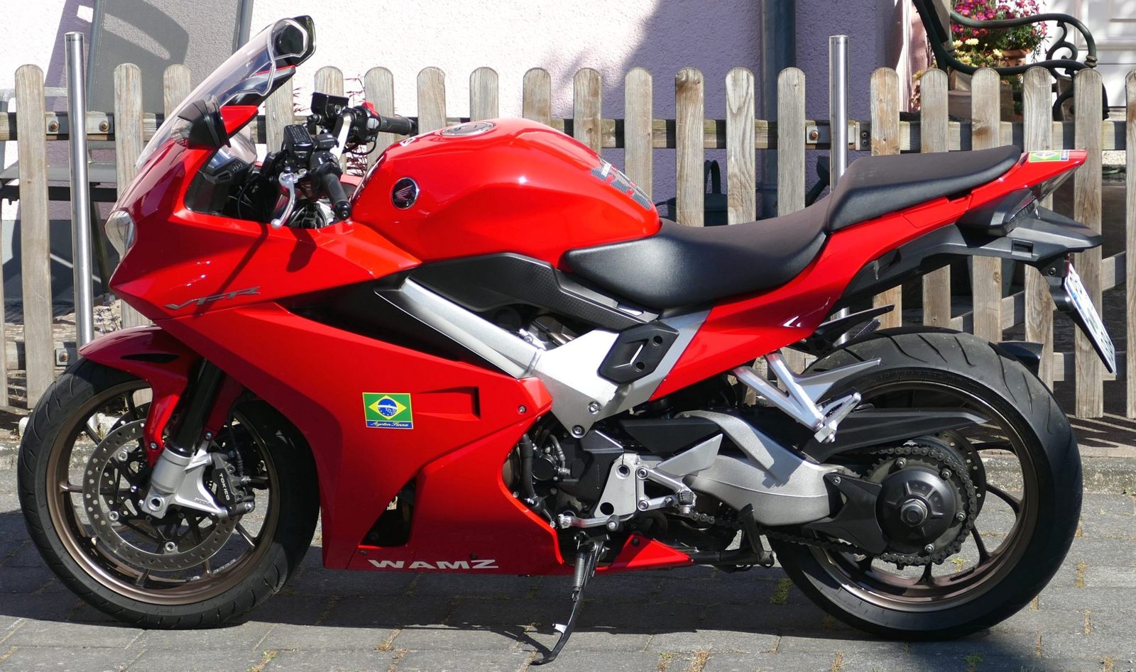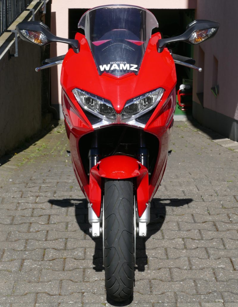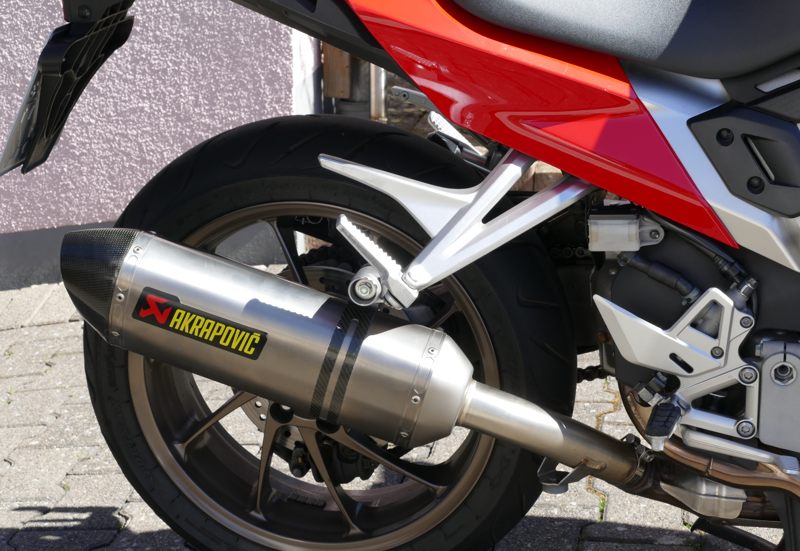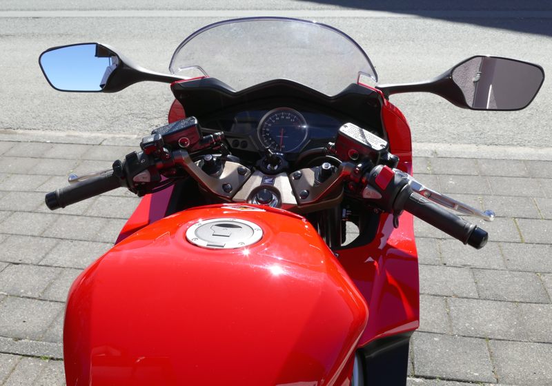 Desweiteren habe ich meine Sammlung um einen legenderen Tourensportler erweitert: Honda VFR 800 F. Die Maschine besitzt den wunderbaren (na ja; kann man auch anders sehen) V4-Honda-Motor mit Einspritzung und Ventilsteuerung VTEC. Bis etwa 6.500 rpm arbeiten nur 2 Ventile pro Zylinder – das spart Benzin; bei höherer Drehzahl werden alle 4 Ventile pro Zylinder “freigeschaltet”, die Post geht nun richtig ab mit entsprechender Sounduntermalung. Das ganze gekleidet in eine Akrapovic-Anlage vermittelt schon etwas Gänsehaut. Bei meiner RC79 ist dieser “Ventilsprung” immer noch merklich spürbar, die Beschleunigungsleistung legt merklich zu. Honda hat das System ab 2014 neuerlich verfeinert. Hmm, war das noch spürbarer? Diese Tourensportmaschine kann locker 400km mit ener Tankfüllung zurücklegen, wenn man sich etwas starke Zurückhaltung beim Fahren auferlegt. Nebenbei hat sie auch serienmäßig Heizgriffe. Aber Big-Bike-Verwöhnte vermissen einfach ein stärkeres Drehmoment.