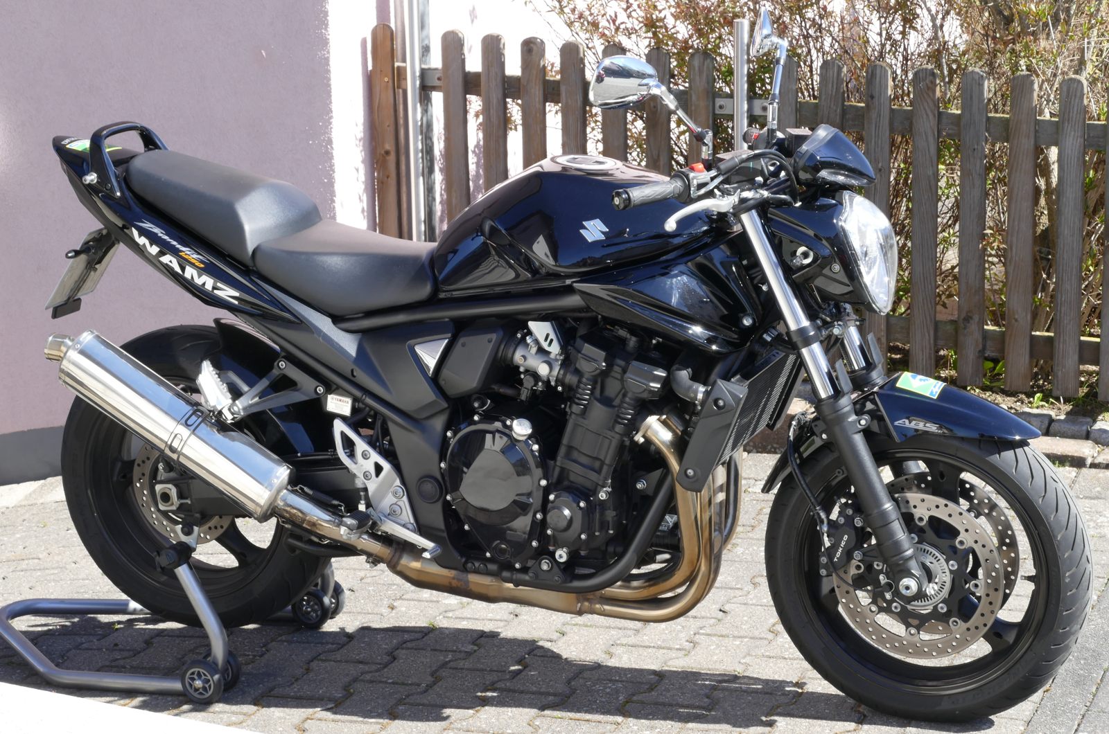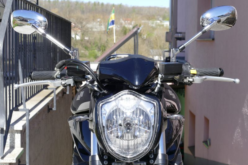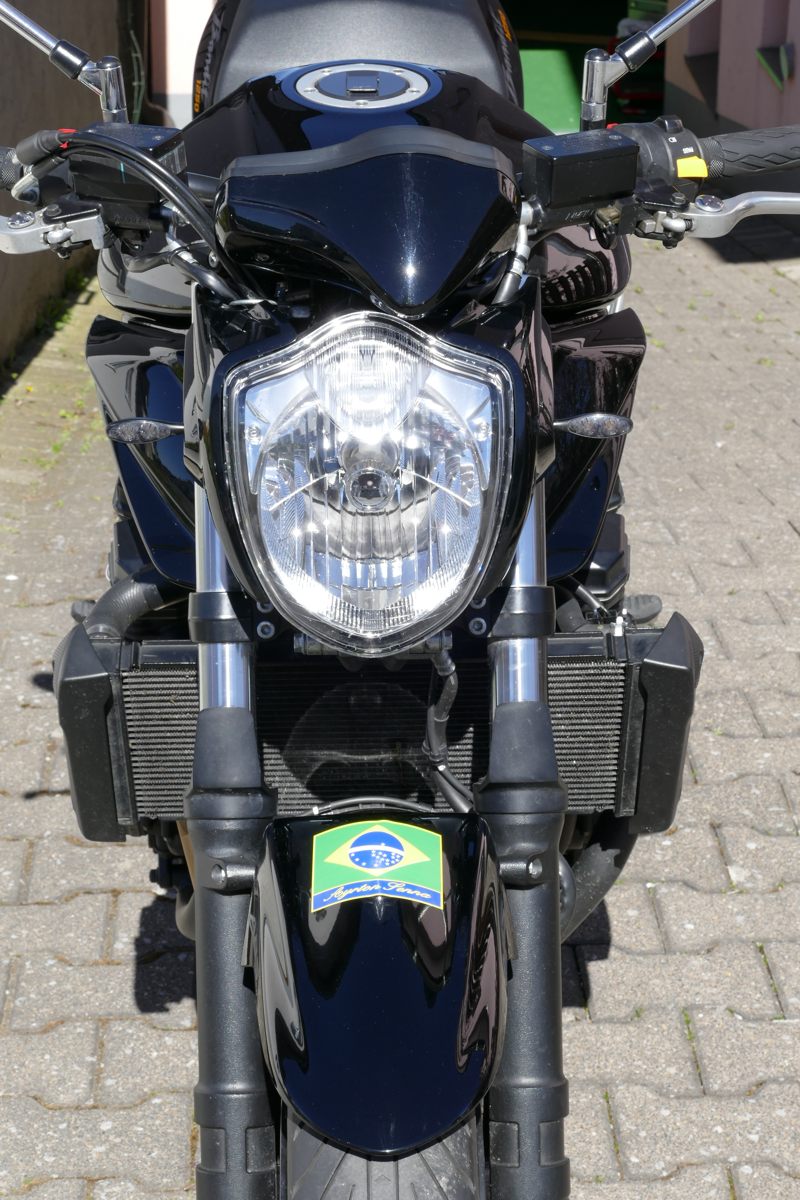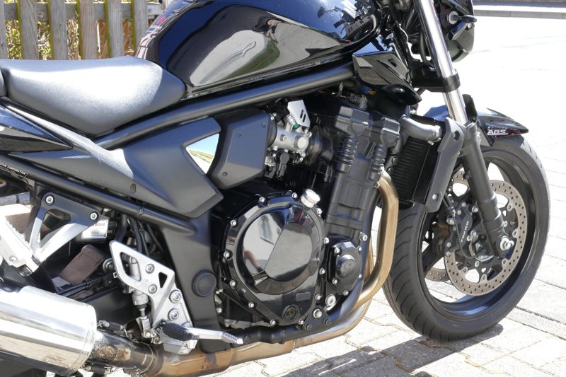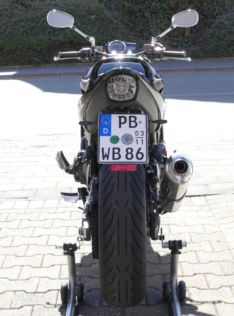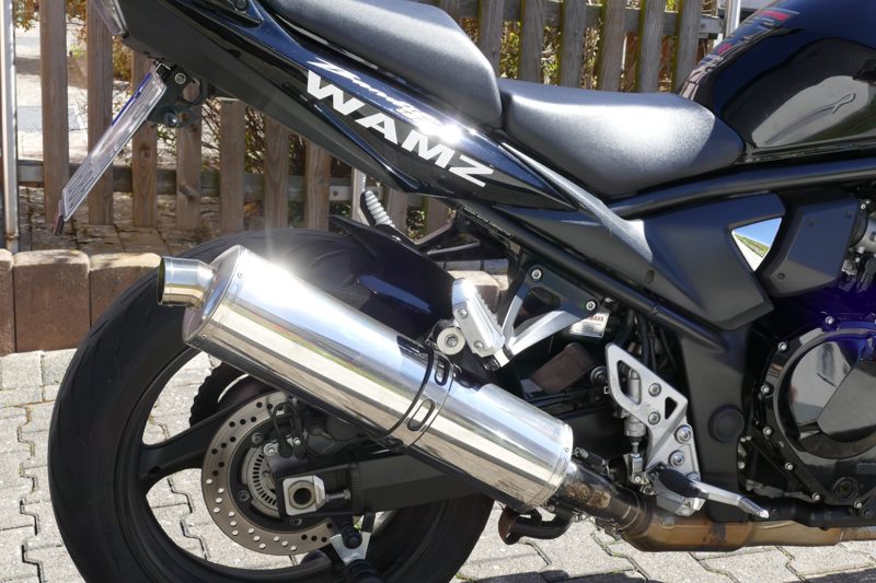Der Winter ist beinahe vorbei, die Maschine wird geholt. Es ist eine Suzuki Bandit GSF 1250 A, also das seltene Naked-Bike-Modell ohne Verkleidung. Dafür in schwarz mit schwarzem Motor und schwarzen Felgen sowie einem BOS-Carbon-Endtopf. Natürlich in Bestzustand. Ich baue mir noch einen speziellen LSL-Lenker an. Dazu ein paar ganz besondere Leckerlis, um in der Tiersprache zu sprechen…