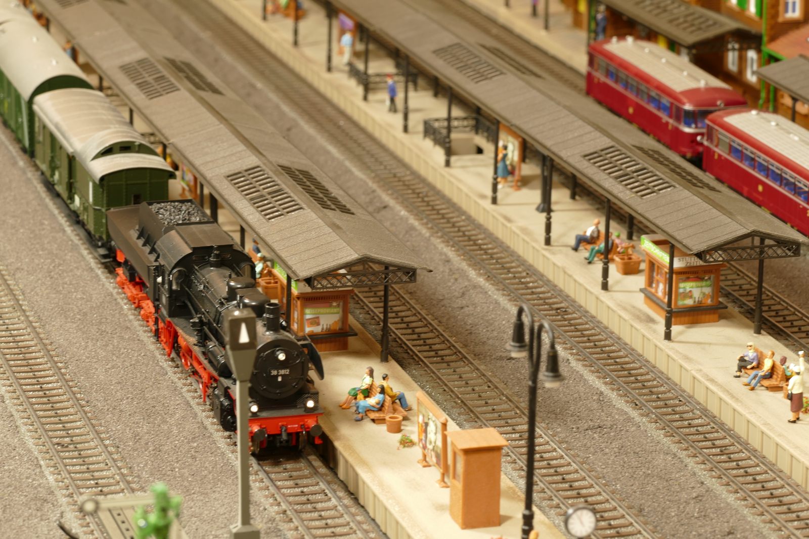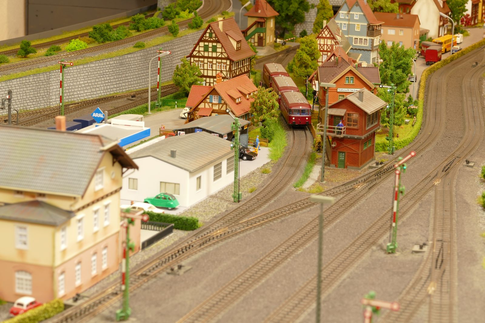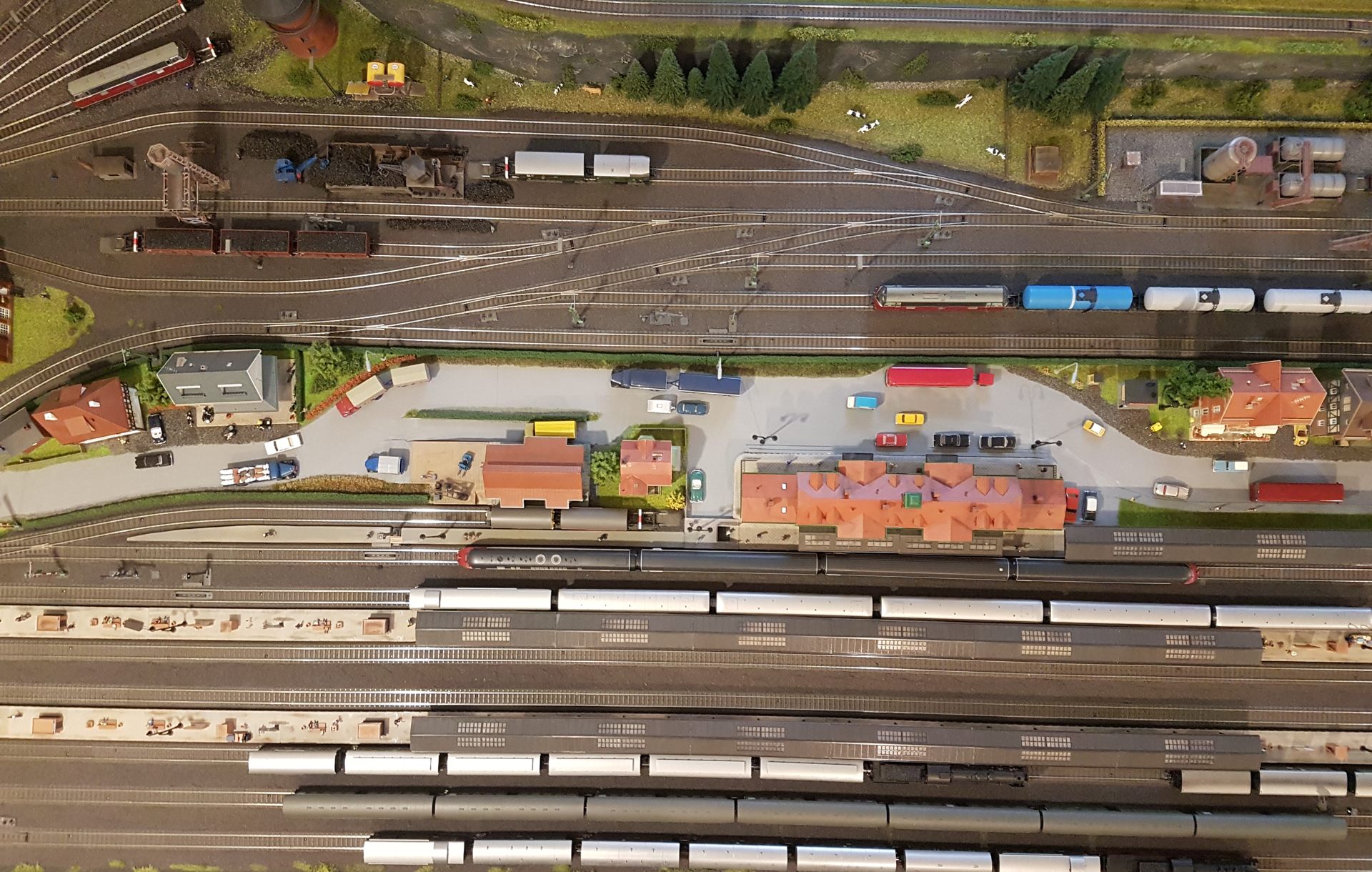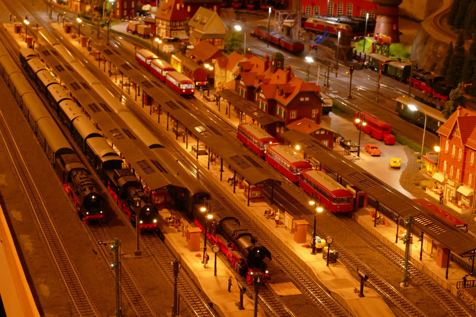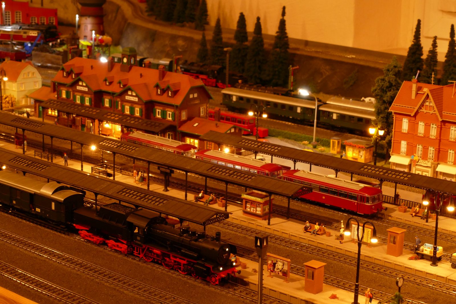 Die Weichenanlagen gestatten es, die Nebenstrecke auch mit einer dritten Einfahrt zu befahren (im Bild links unten). Innerhalb einer Strecke von ca.3m kann man von Gleis 1 bzw. von Gleis 8 auf die Hauptbahn, und hier sogar auf das Gegengleis gelangen. Das eröffnet alle Spielmöglichkeiten und entspricht auch der Realität bei der DB. Inklusive einer Rangierfahrt kann man von Gleis 1 auf Gleis 8 und umgekehrt gelangen. Desweiteren erreicht man vom Hauptbahnhof direkt den Güterbahnhof (1 Gleis) oder das Betriebswerk (1 Gleis). Von den 8 Gleisen ist eines (Gleis 1) als Stumpfgleis ausgeführt, an dem häufig die Schienenbusse einfahren. Die Gleise 7 und 8 sind weniger Haltegleise, eher Umfahrungsgleise für durchfahrende Züge. Die Bahnhofsanlagen (Weiche bis Weiche) erstrecken sich über eine Länge von 4,8m.