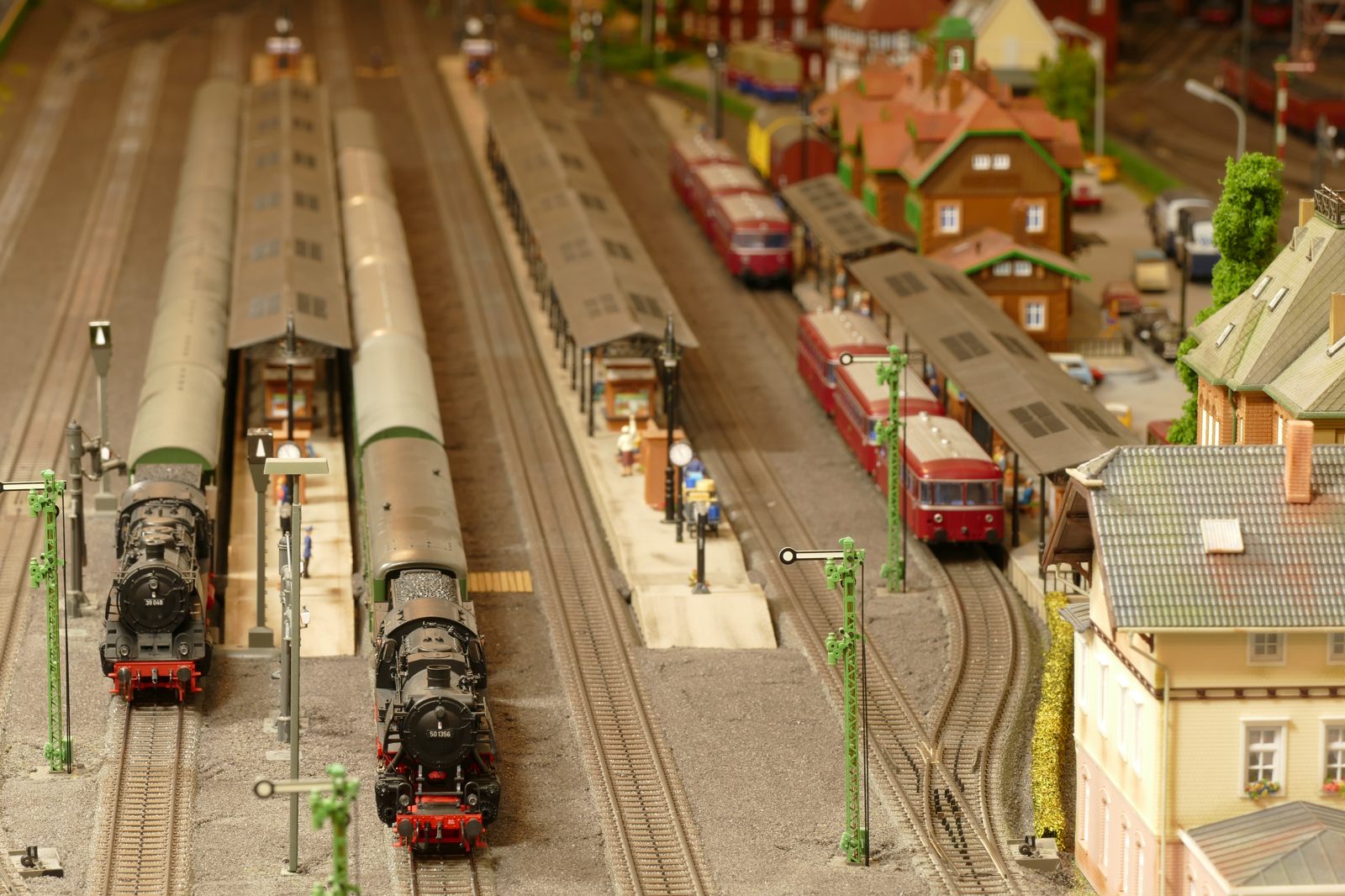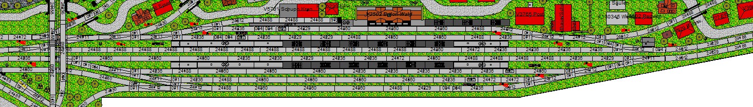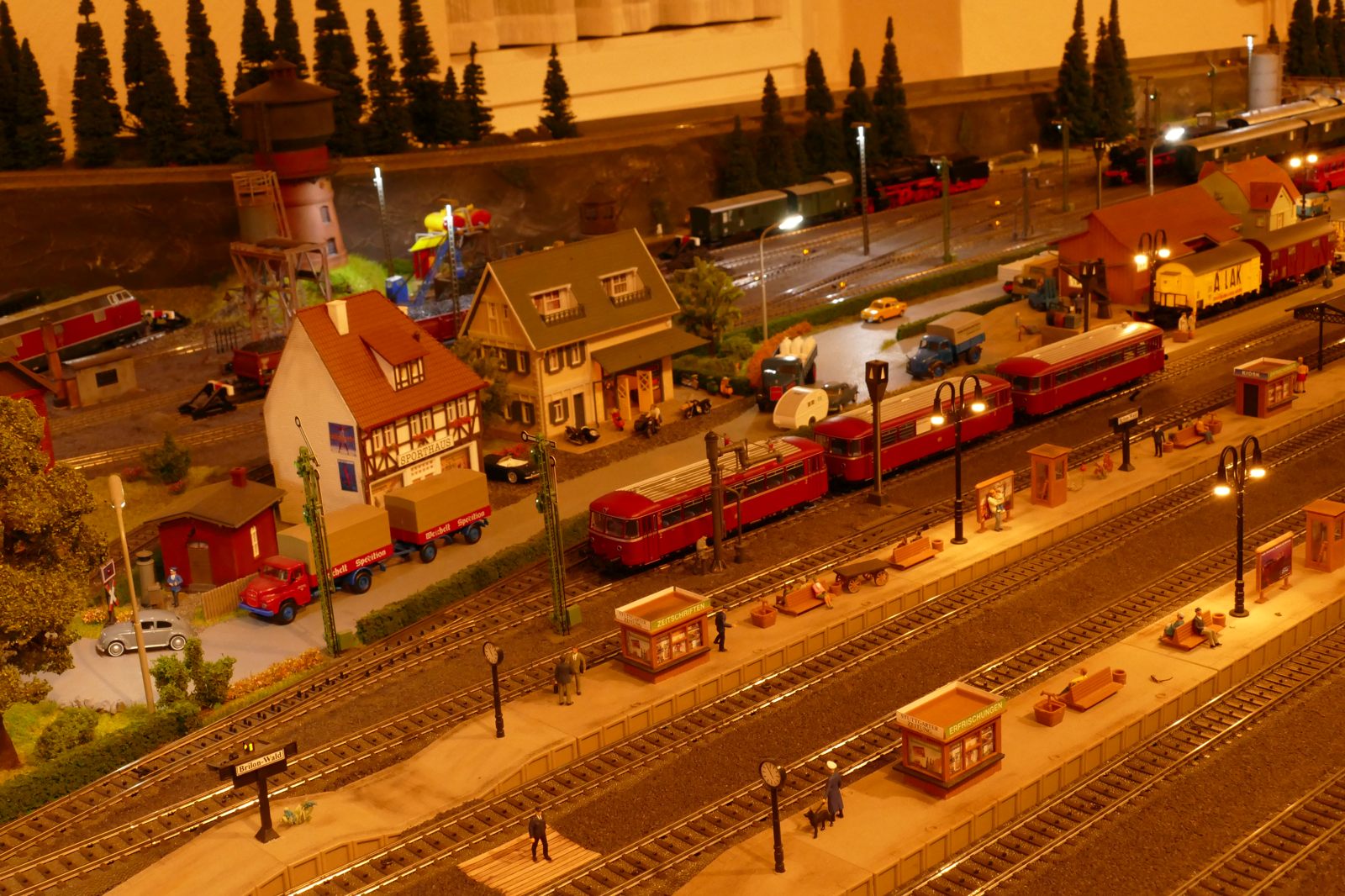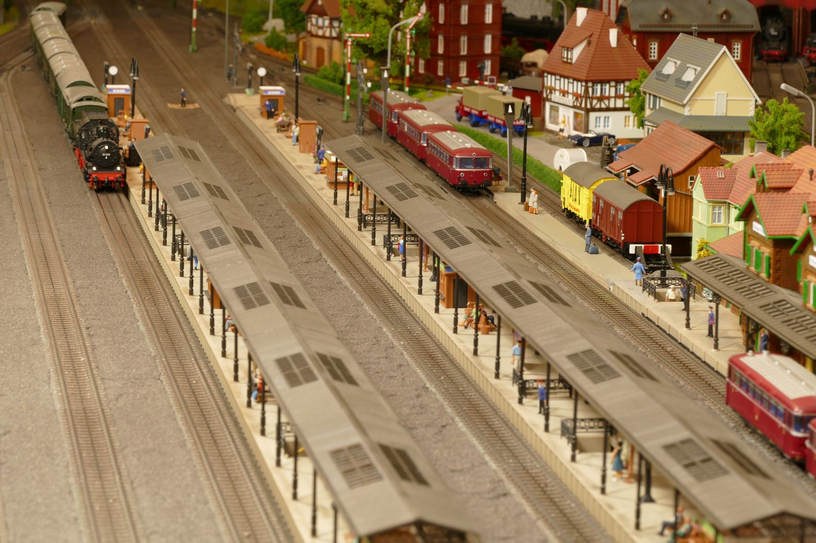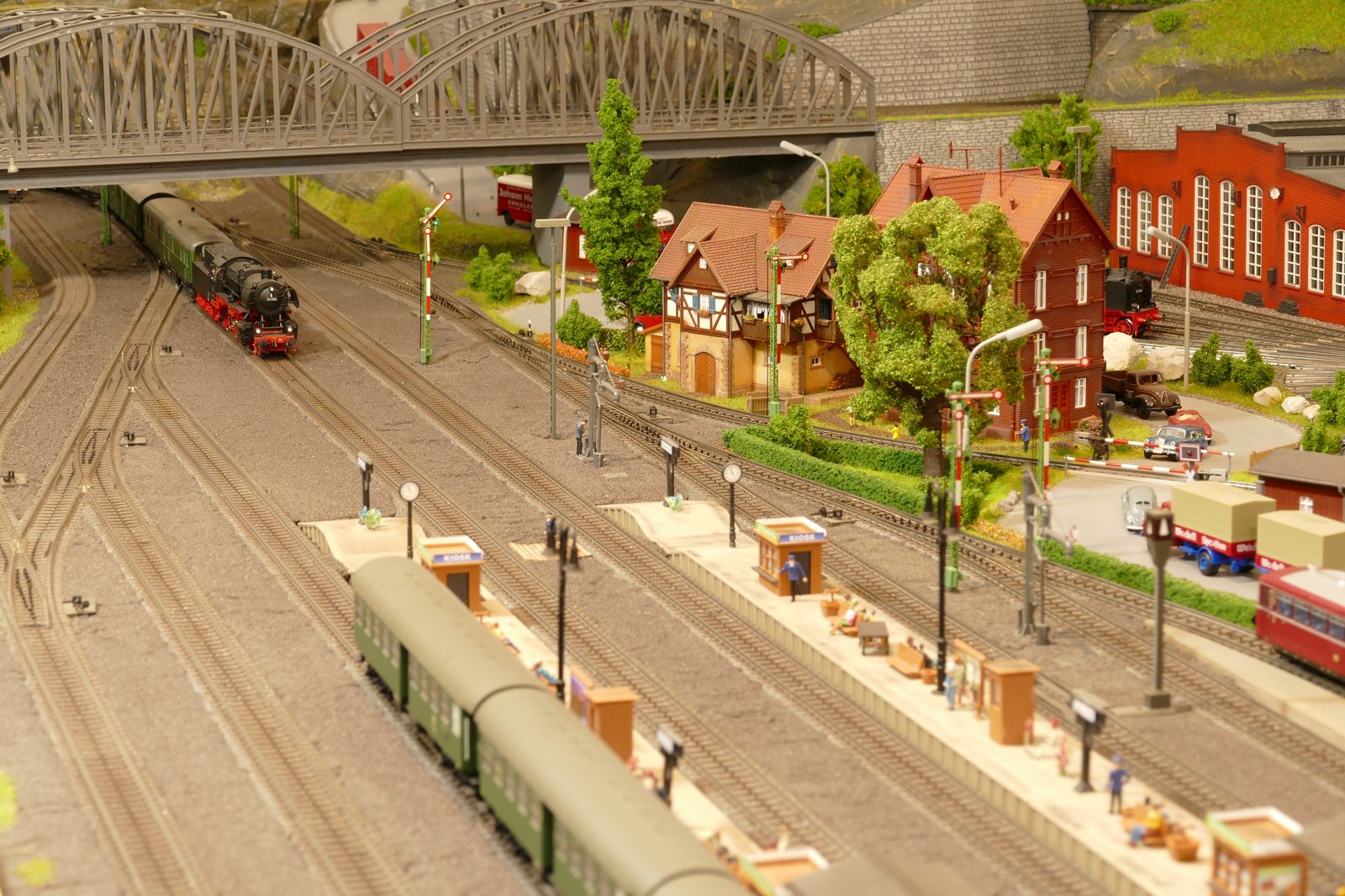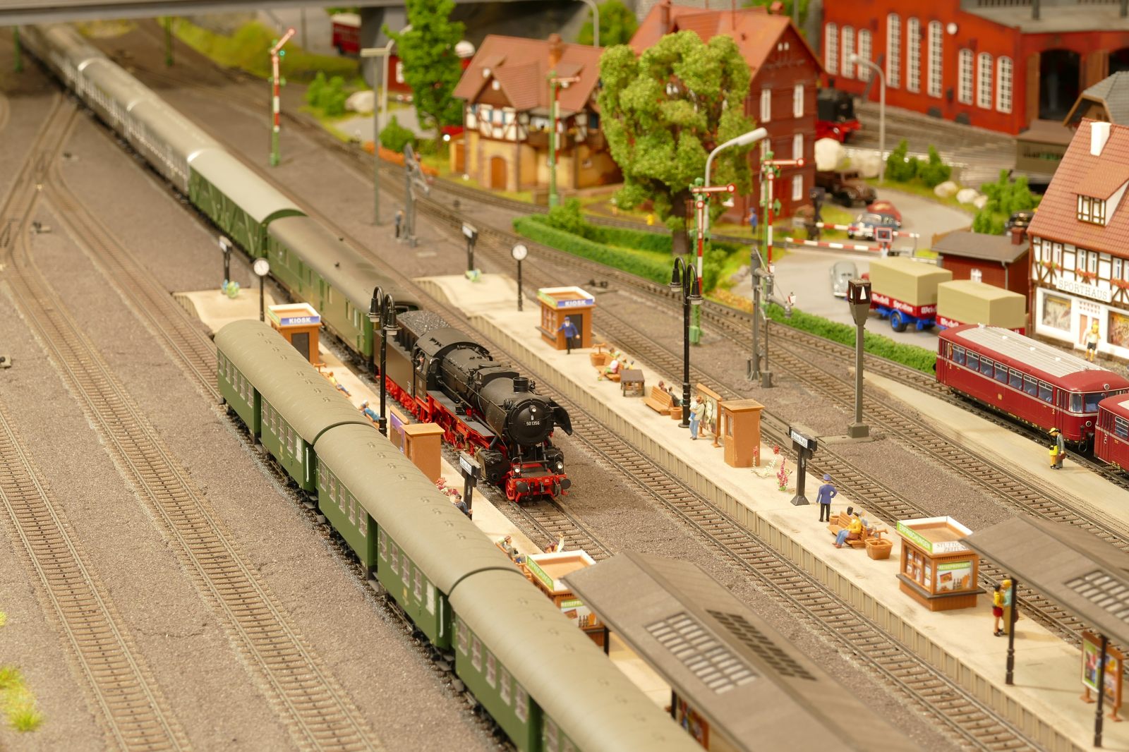 Die Weichenanlagen gestatten es, die Nebenstrecke auch mit einer dritten Einfahrt zu befahren (im Bild links unten). Innerhalb einer Strecke von ca.3m kann man von Gleis 1 bzw. von Gleis 8 auf die Hauptbahn, und hier sogar auf das Gegengleis gelangen. Das eröffnet alle Spielmöglichkeiten und entspricht auch der Realität bei der DB. Inklusive einer Rangierfahrt kann man von Gleis 1 auf Gleis 8 und umgekehrt gelangen. Desweiteren erreicht man vom Hauptbahnhof direkt den Güterbahnhof (1 Gleis) oder das Betriebswerk (1 Gleis). Von den 8 Gleisen ist eines (Gleis 1) als Stumpfgleis ausgeführt, an dem häufig die Schienenbusse einfahren. Die Gleise 7 und 8 sind weniger Haltegleise, eher Umfahrungsgleise für durchfahrende Züge. Die Bahnhofsanlagen (Weiche bis Weiche) erstrecken sich über eine Länge von 4,8m.