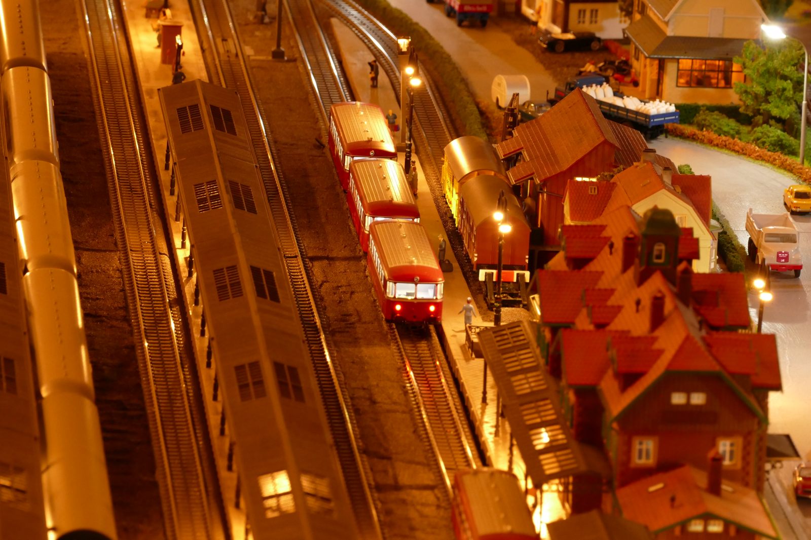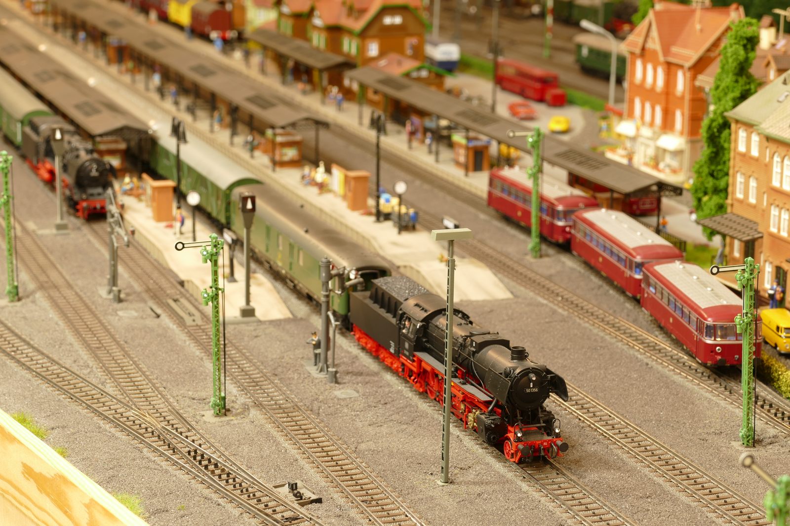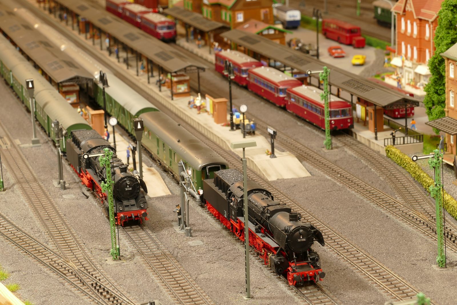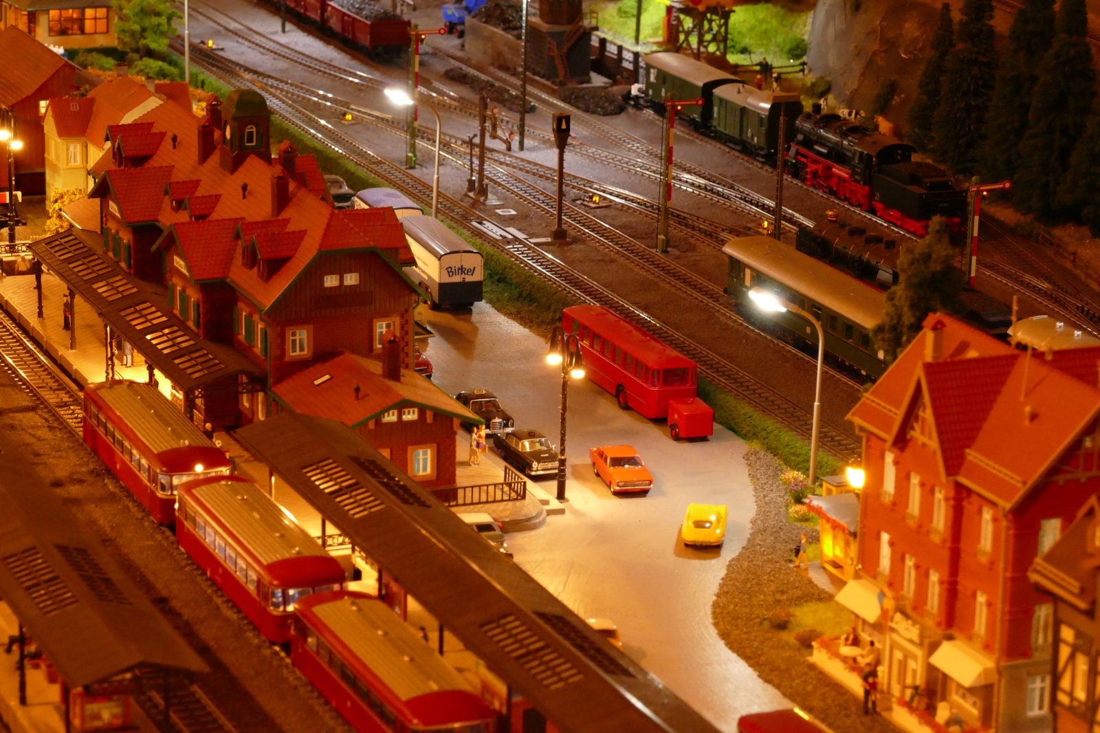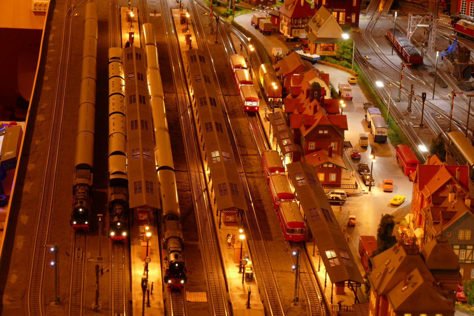 Die Weichenanlagen gestatten es, die Nebenstrecke auch mit einer dritten Einfahrt zu befahren (im Bild links unten). Innerhalb einer Strecke von ca.3m kann man von Gleis 1 bzw. von Gleis 8 auf die Hauptbahn, und hier sogar auf das Gegengleis gelangen. Das eröffnet alle Spielmöglichkeiten und entspricht auch der Realität bei der DB. Inklusive einer Rangierfahrt kann man von Gleis 1 auf Gleis 8 und umgekehrt gelangen. Desweiteren erreicht man vom Hauptbahnhof direkt den Güterbahnhof (1 Gleis) oder das Betriebswerk (1 Gleis). Von den 8 Gleisen ist eines (Gleis 1) als Stumpfgleis ausgeführt, an dem häufig die Schienenbusse einfahren. Die Gleise 7 und 8 sind weniger Haltegleise, eher Umfahrungsgleise für durchfahrende Züge. Die Bahnhofsanlagen (Weiche bis Weiche) erstrecken sich über eine Länge von 4,8m.