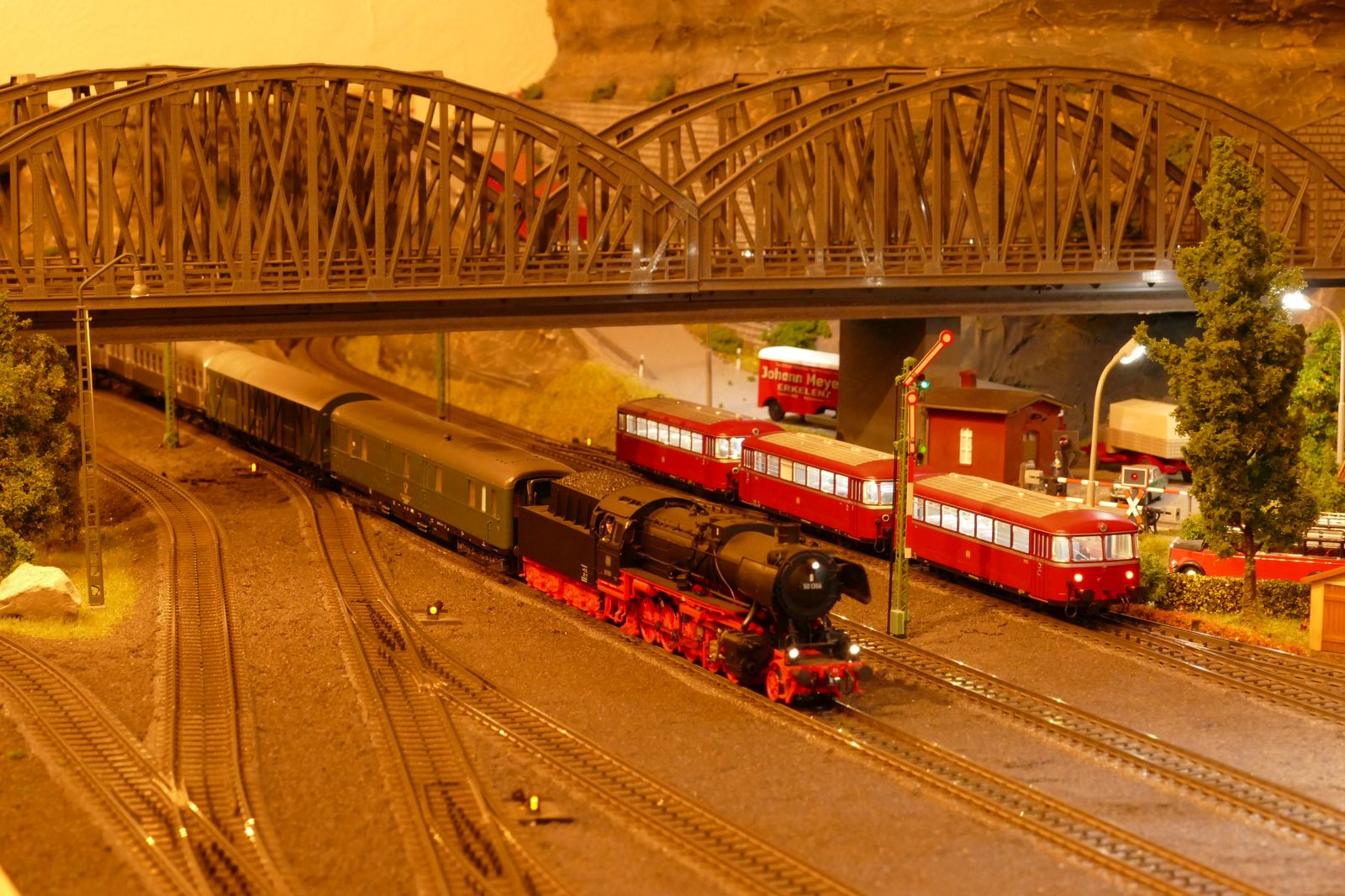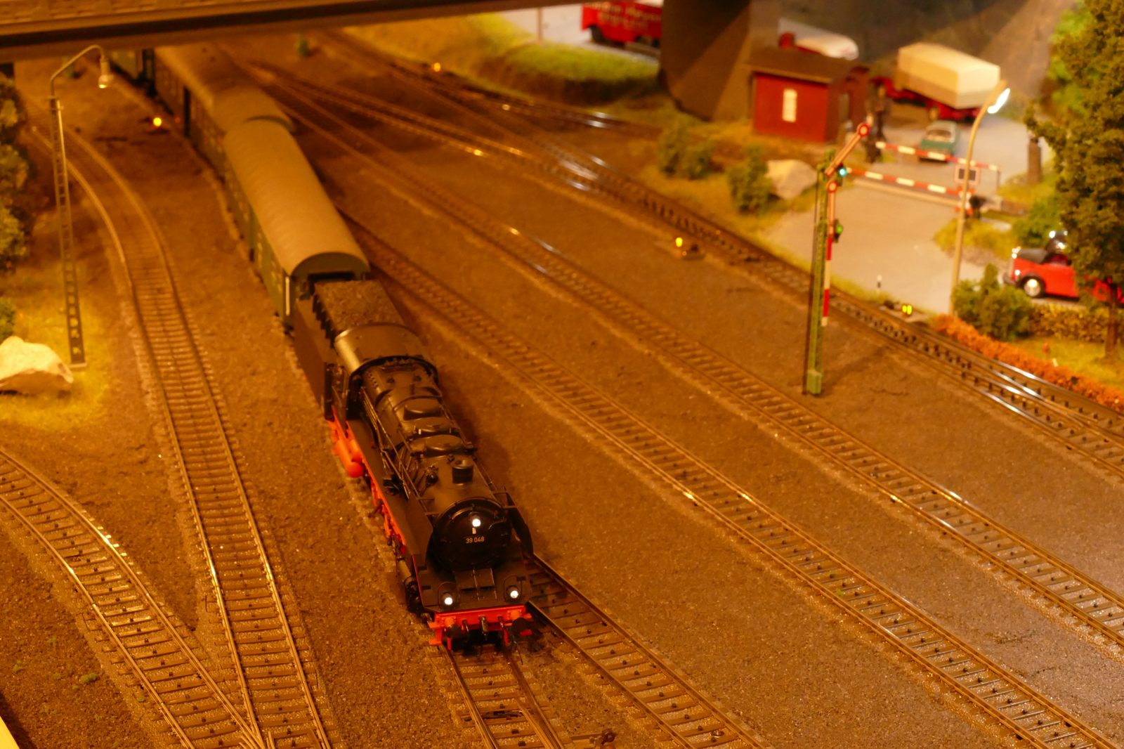 Mein Modellbahn-Brilon-Wald besitzt einen Bahnhof mit langen Bahnsteigen, an denen auch 9 oder 10 Wagenzüge Platz finden. Der Bahnhof ist so konzipiert, dass man auf der Hauptstrecke (ca. 35m Länge) von beiden Seiten (Ruhrtalbahn von Hagen/Meschede im Süden bzw von Kassel/Warburg im Norden, bei mir links) in ihn hineinfahren kann. Die Nebenstrecke ist analog konstruiert. In Südrichtung (nach rechts) fahren die Züge nach Korbach/Frankfurt, nordwärts (nach links) geht es nach Brilon/Büren und Paderborn bzw. Bremen. Im Bahnhof selbst sind noch keine Steigungen vorhanden. Gerade die Nebenstreckenausfahrten haben es dann – wie in der Realität – in sich. Beide Male geht es mit ca. 3% bergauf. Das heißt es, schon im Bahnhof den Dampfdruck hoch halten.