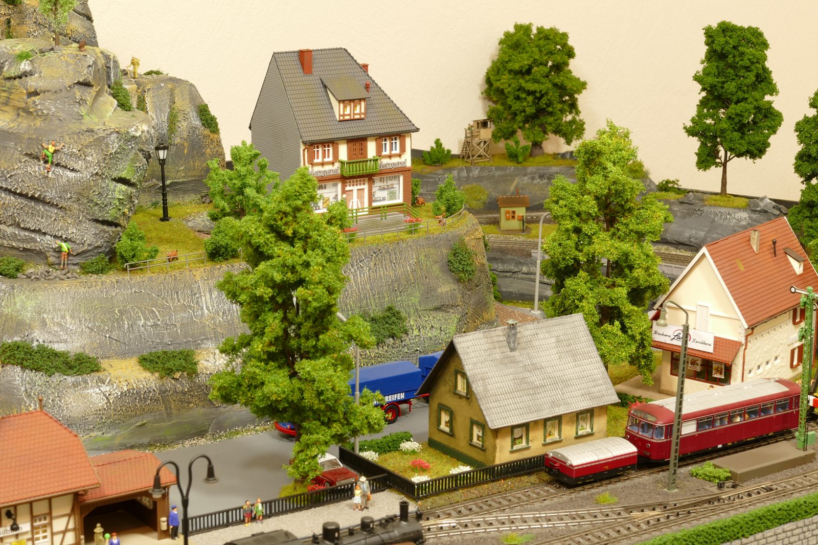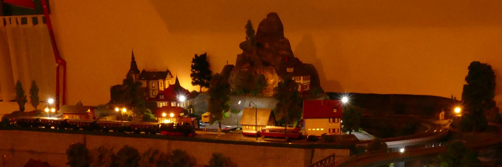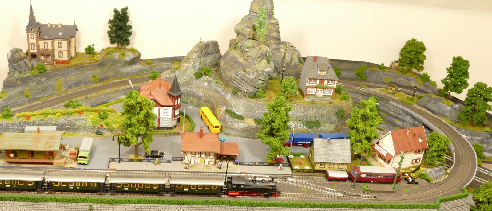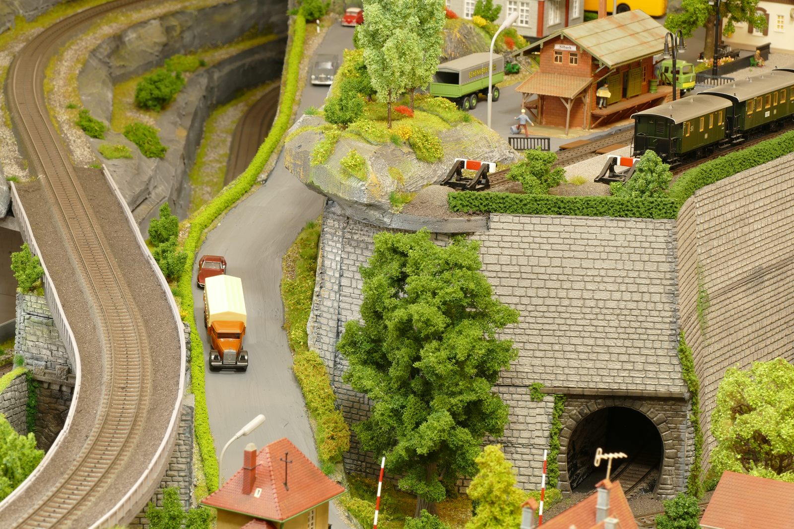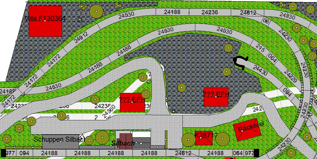 Der kleine Ort Silbach liegt erhöht auf meiner Anlage. Die Gebäude liegen ca. 20 bis 35cm über der Hauptebene. Interessant sind der Berg mit den Felsen, die bei Touristen und Bergsteigern beliebt sind. Davon profitieren auch die Dorfbäckerei mit angeschlossenem Cafe und die Metzgerei. Ein kleiner Kopfbahnhof unterstützt die Mobilität und Versorgung bzw. den Warenaustusch des Ortes im Sauerland.