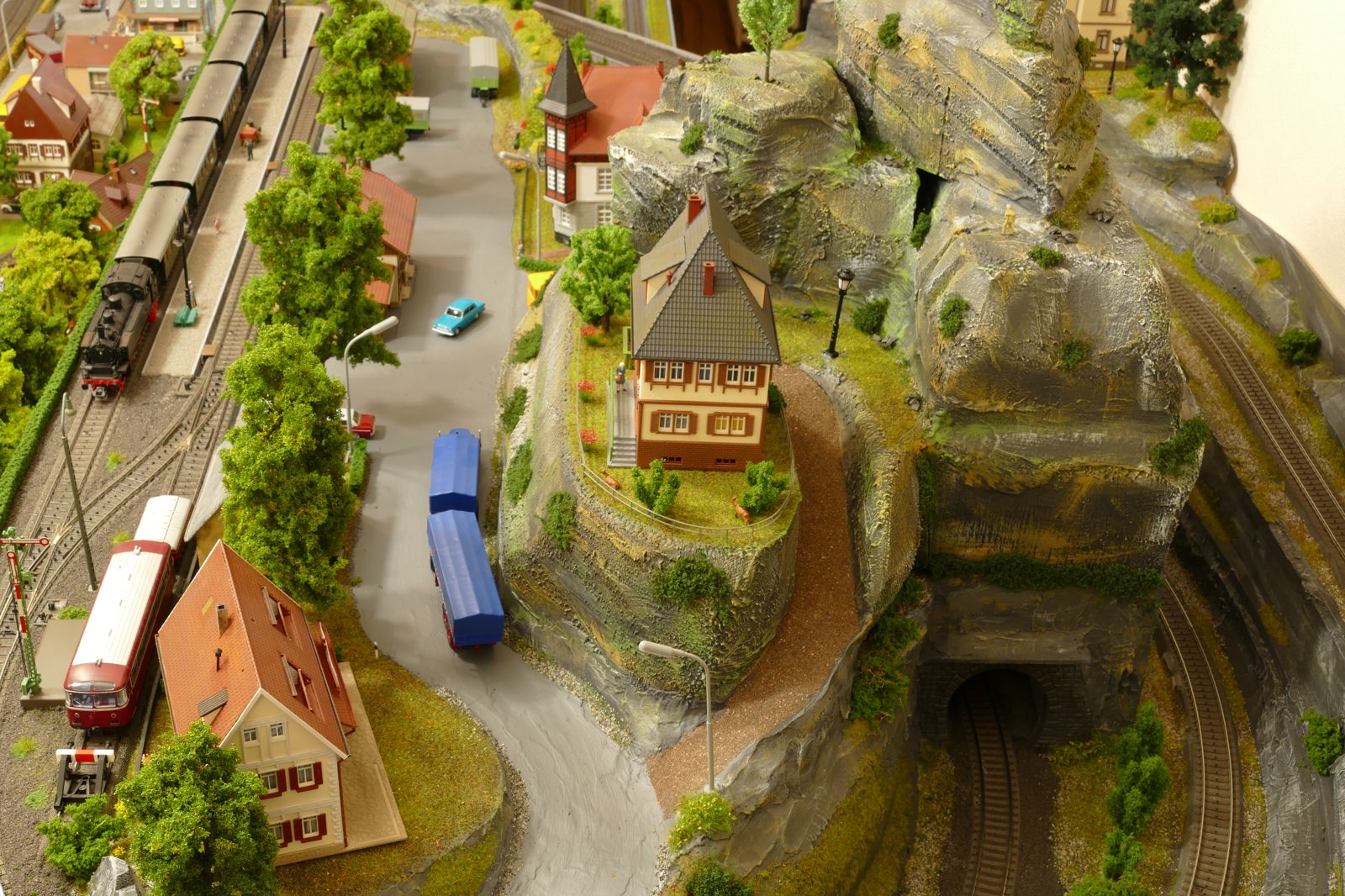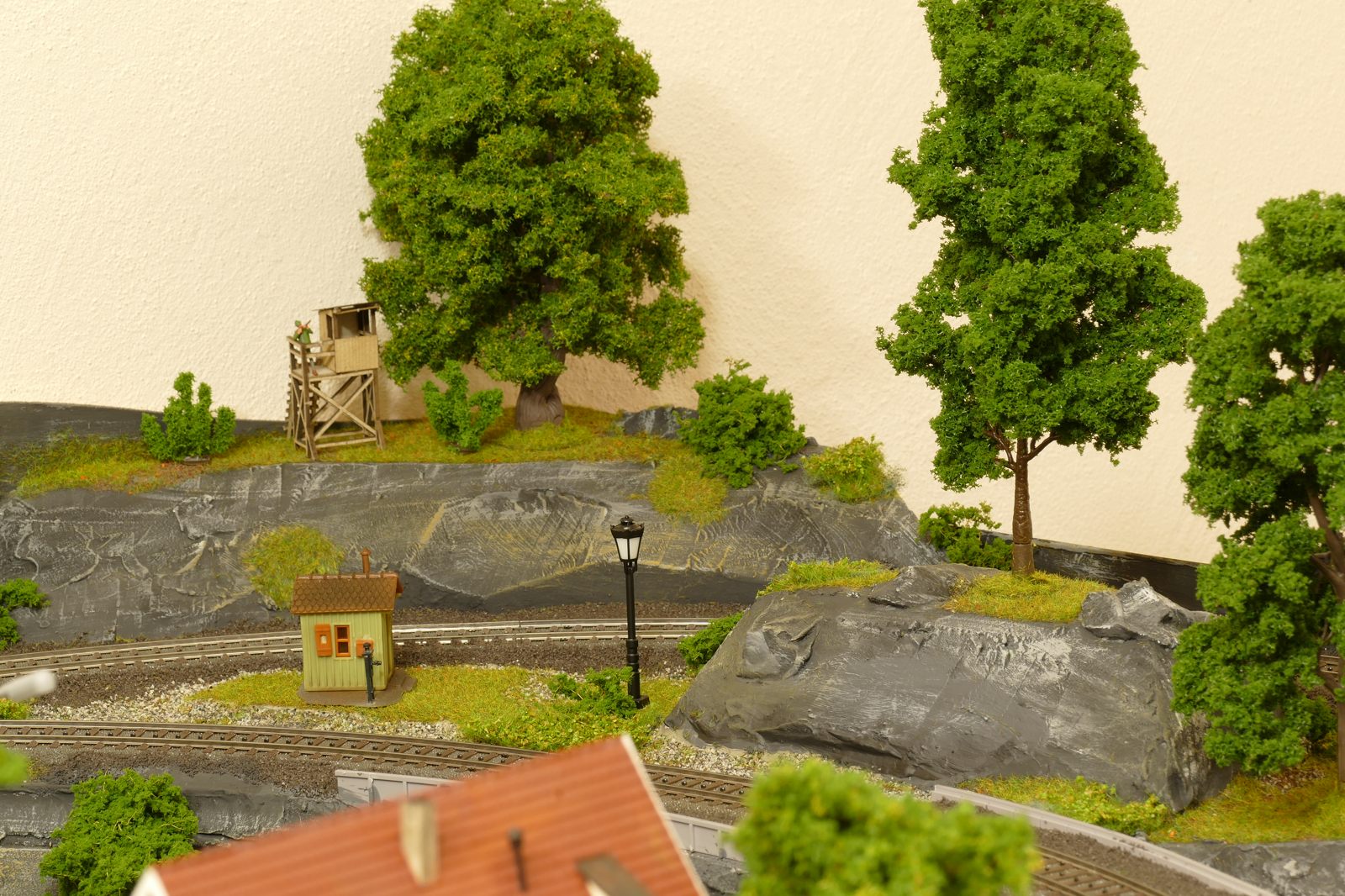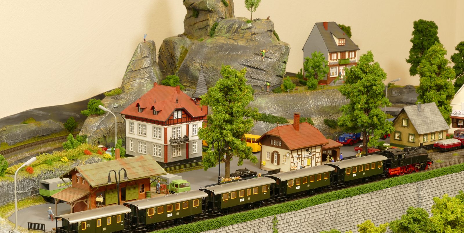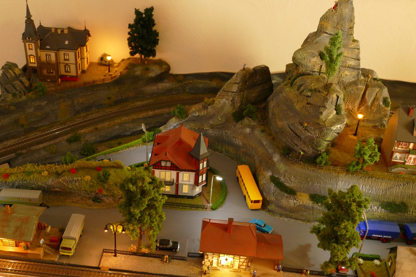 Der kleine Ort Silbach liegt erhöht auf meiner Anlage. Die Gebäude liegen ca. 20 bis 35cm über der Hauptebene. Interessant sind der Berg mit den Felsen, die bei Touristen und Bergsteigern beliebt sind. Davon profitieren auch die Dorfbäckerei mit angeschlossenem Cafe und die Metzgerei. Ein kleiner Kopfbahnhof unterstützt die Mobilität und Versorgung bzw. den Warenaustusch des Ortes im Sauerland.