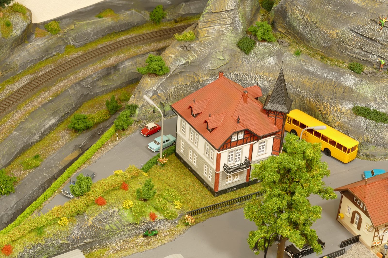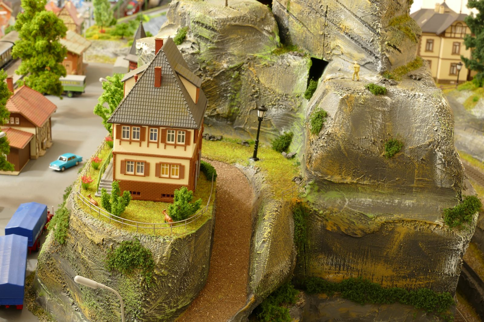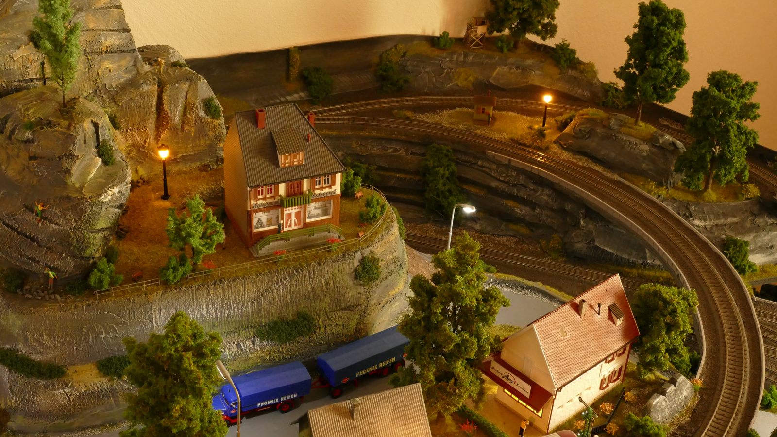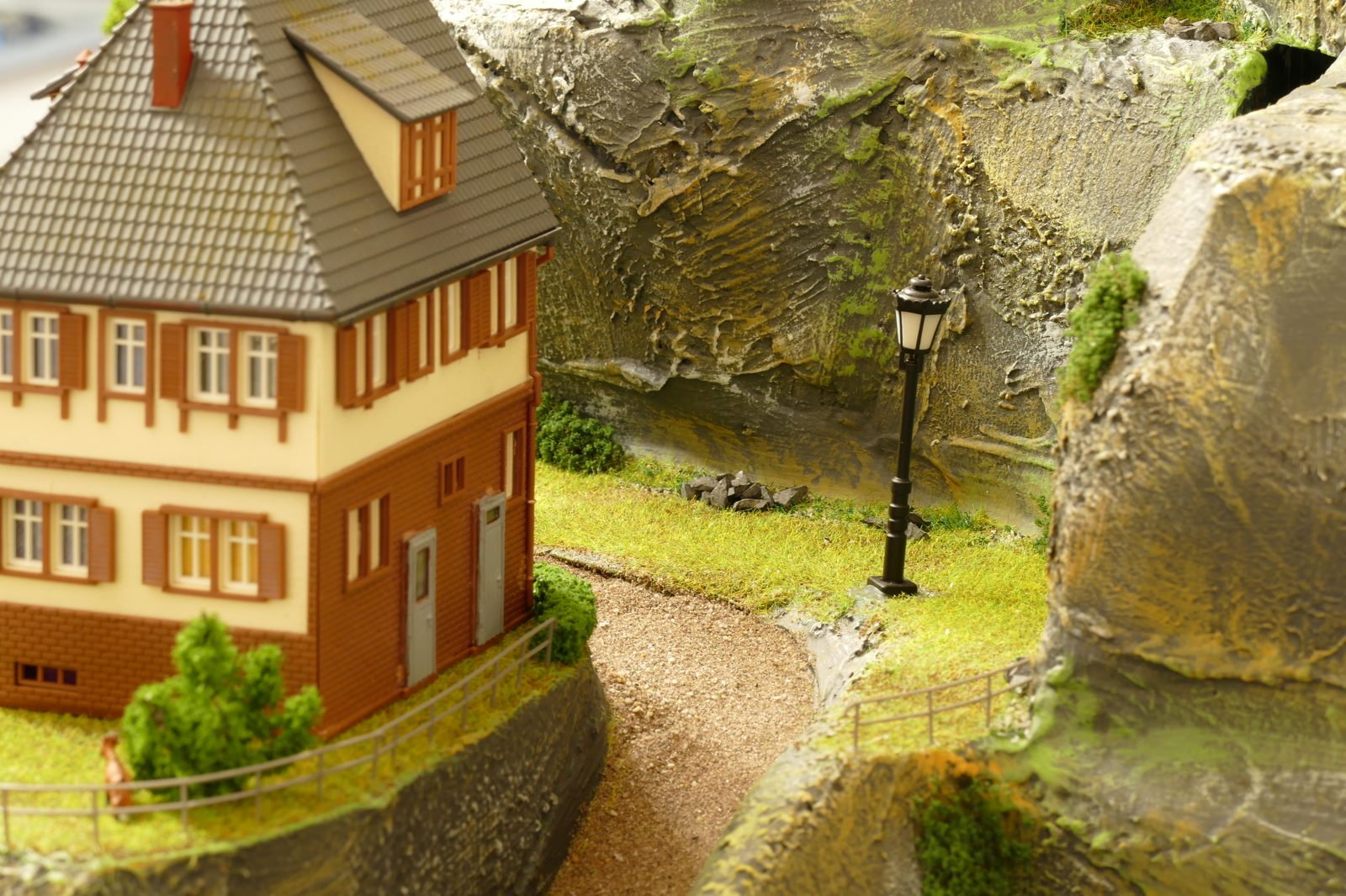 Der kleine Ort Silbach liegt erhöht auf meiner Anlage. Die Gebäude liegen ca. 20 bis 35cm über der Hauptebene. Interessant sind der Berg mit den Felsen, die bei Touristen und Bergsteigern beliebt sind. Davon profitieren auch die Dorfbäckerei mit angeschlossenem Cafe und die Metzgerei. Ein kleiner Kopfbahnhof unterstützt die Mobilität und Versorgung bzw. den Warenaustusch des Ortes im Sauerland.