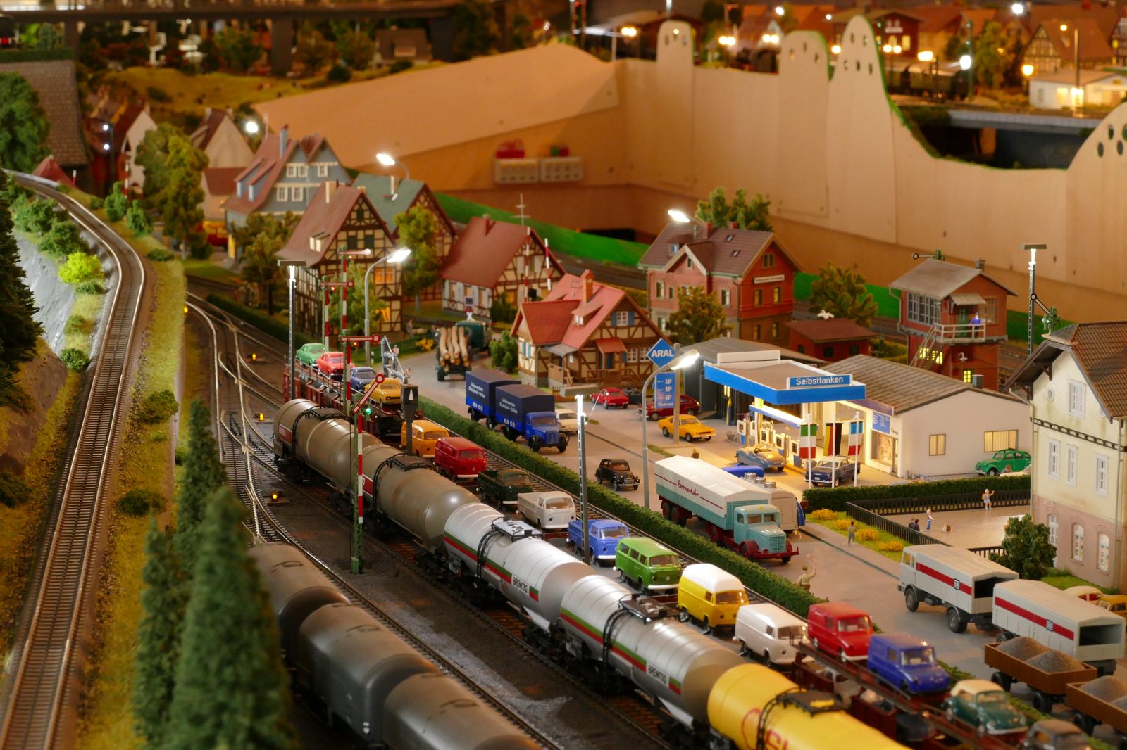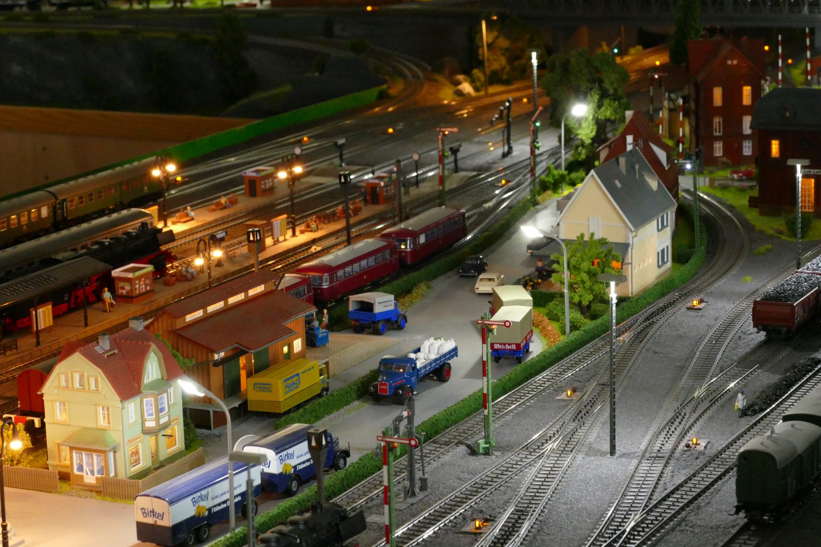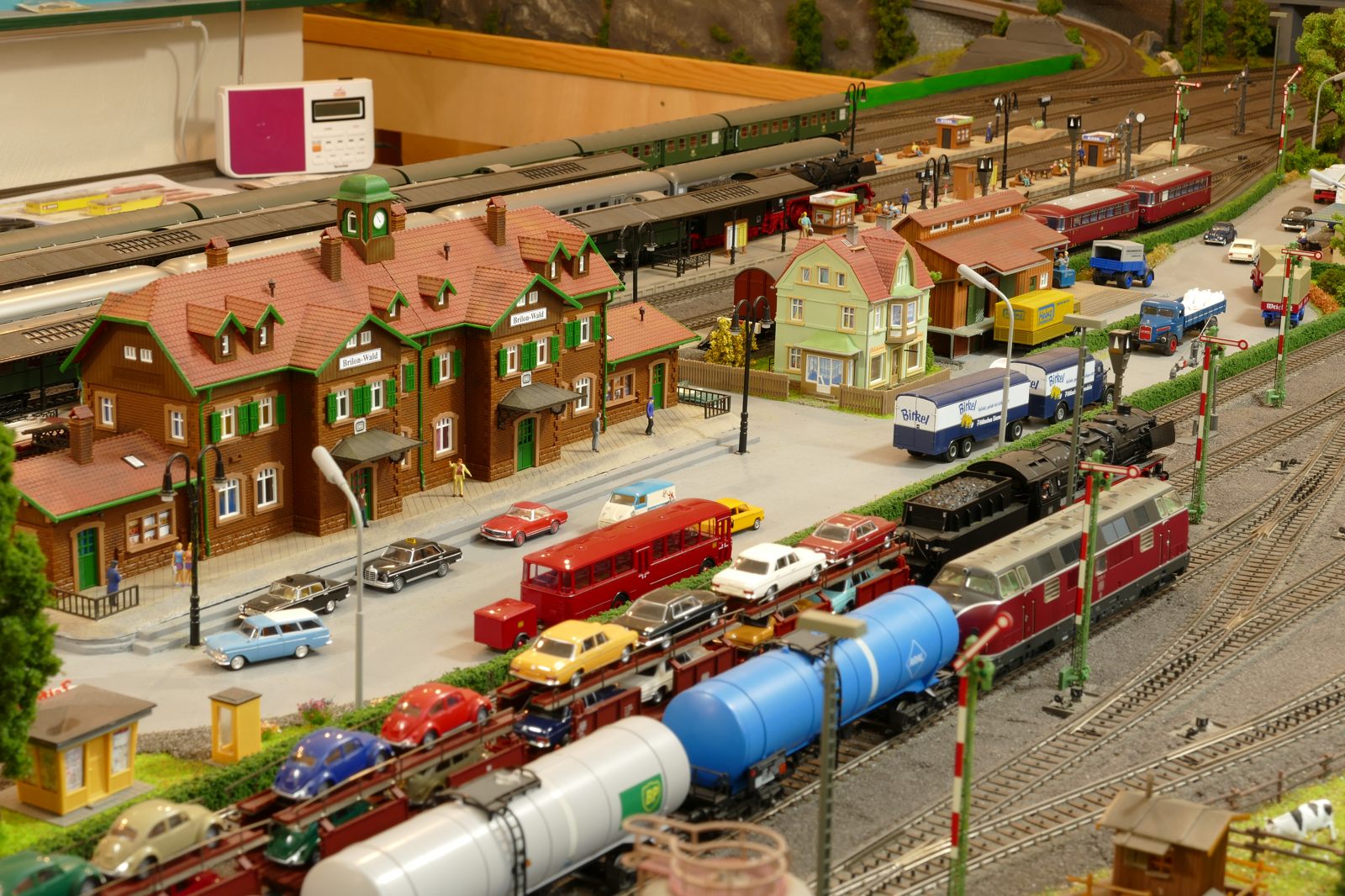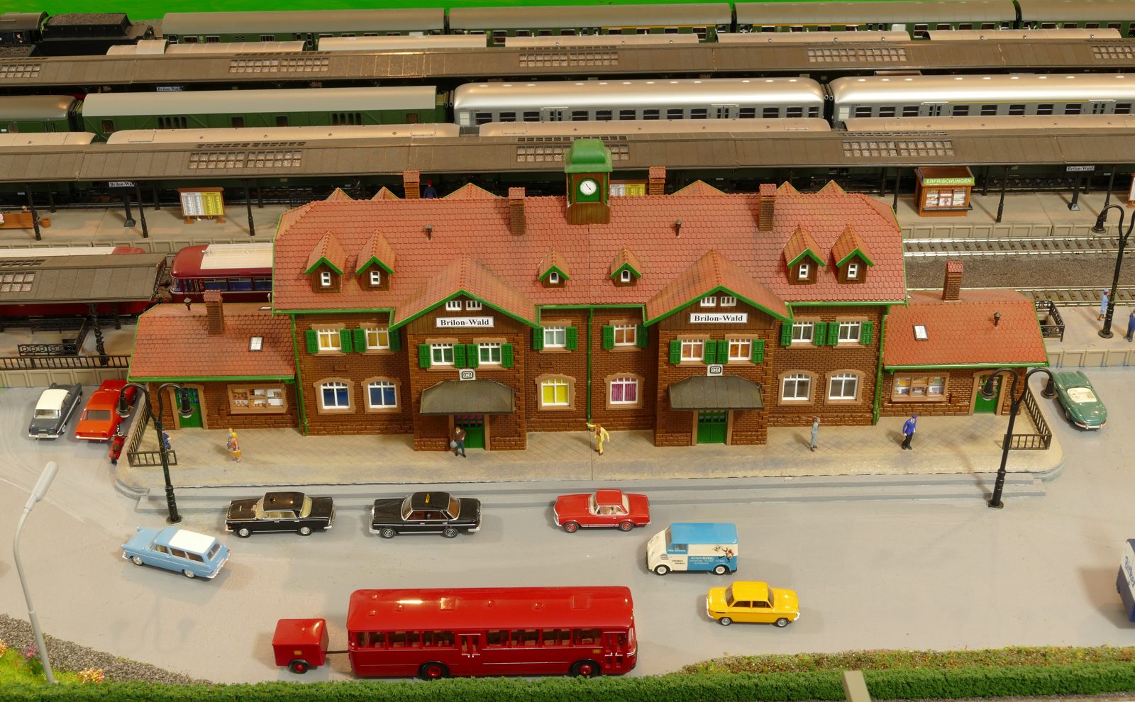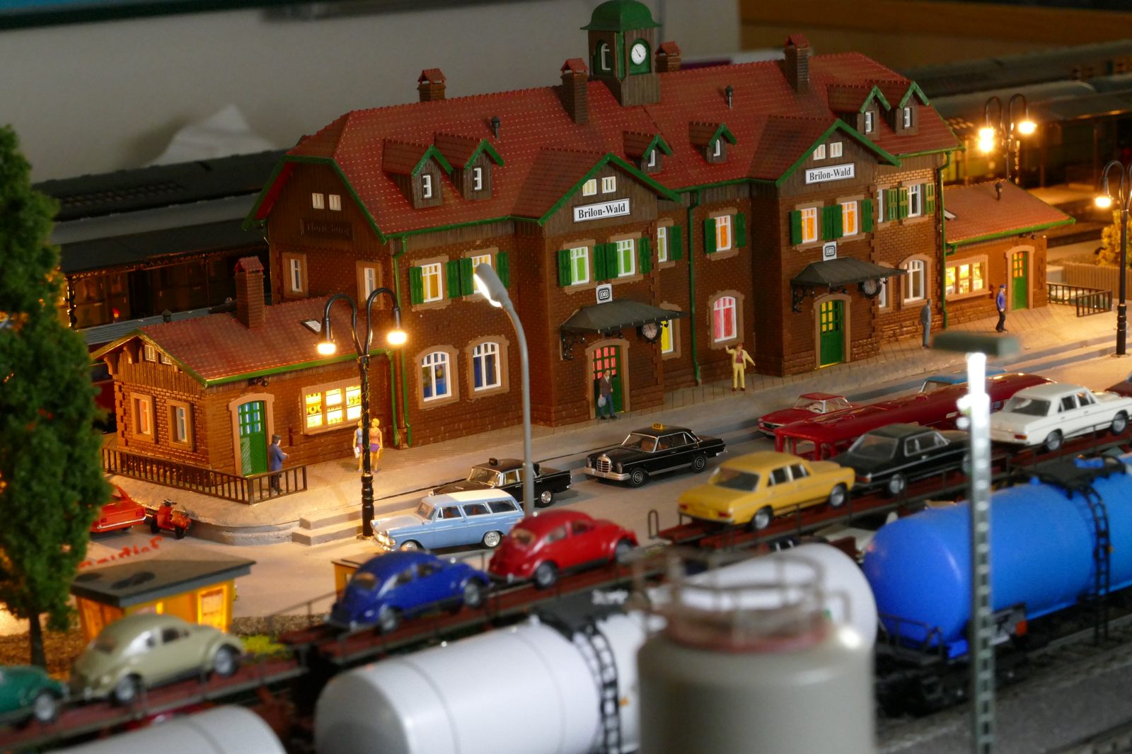 Die Stadt Brilon-Wald ist der Mittelpunkt meiner Modelleisenbahnanlage. Sie erstreckt sich hauptsächlich entlang der Bahnhofstraße, breitet sich aber auch weiter aus ins Bergland und besitzt ein außerhalb gelegenes größeres Gewerbegebiet, das ich separat vorstelle. Brilon-Wald bietet also für seine Bewohner zahlreiche Arbeitsplätze, einen großen Bahnhof mit Gepäckabfertigung und Güterbahnhof sowie Betriebswerk. Weiterhin gibt es eine Polizeistation, die rund um die Uhr besetzt ist. Stadtverwaltung, Schule, Post, Werkstätten, Tankstelle, Einkaufmöglichkeiten, alles ist noch per Fuß zu erreichen.