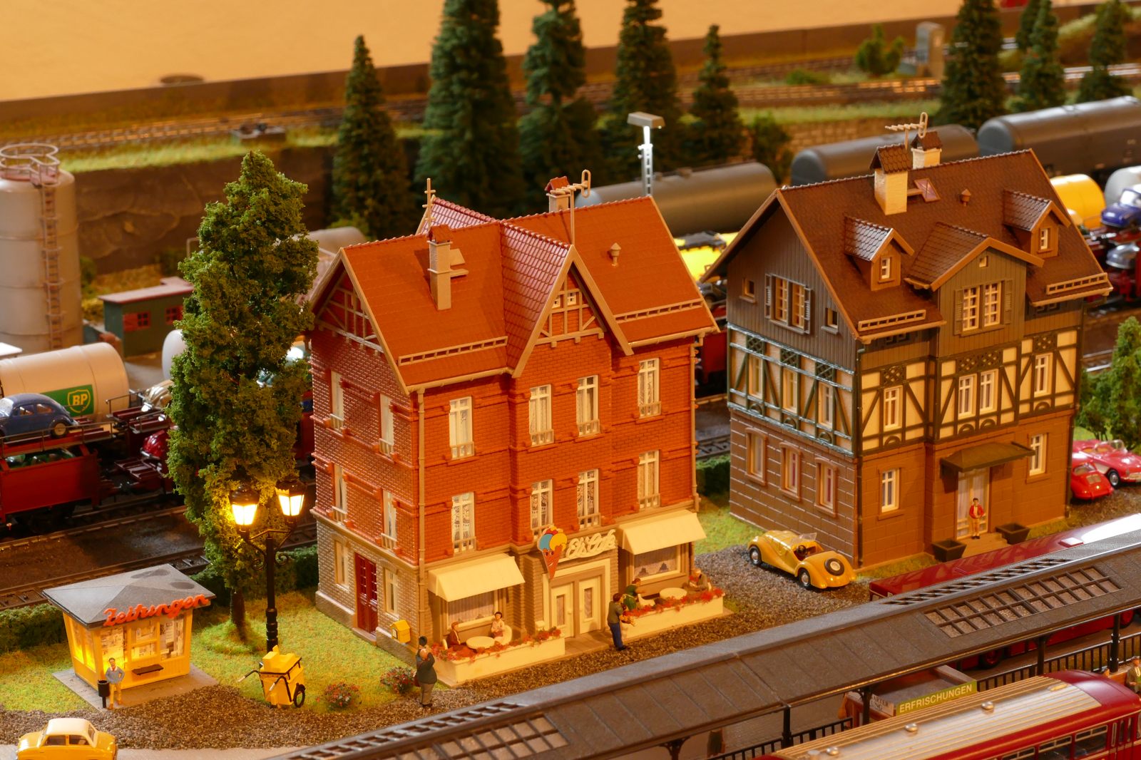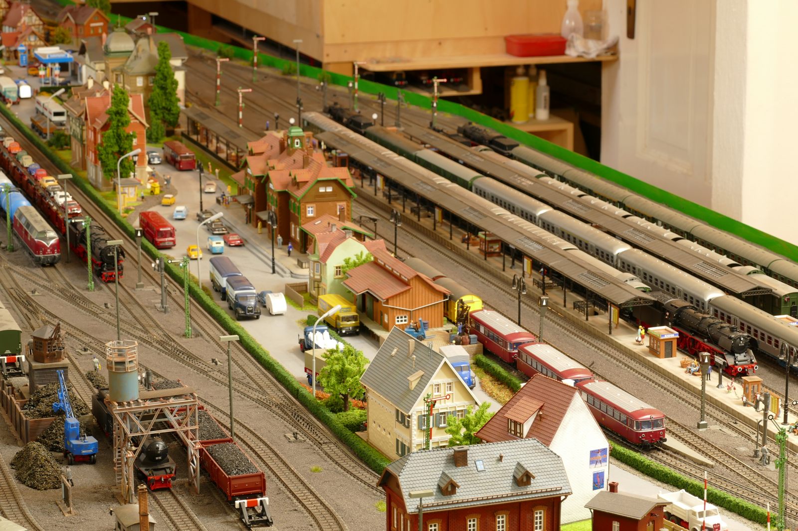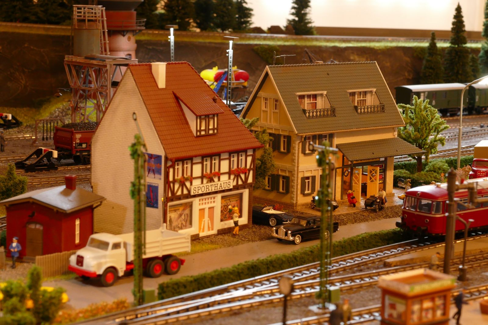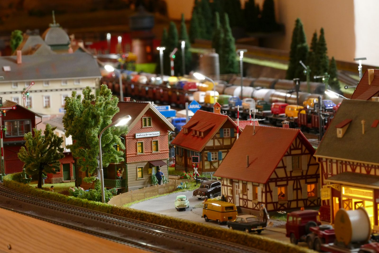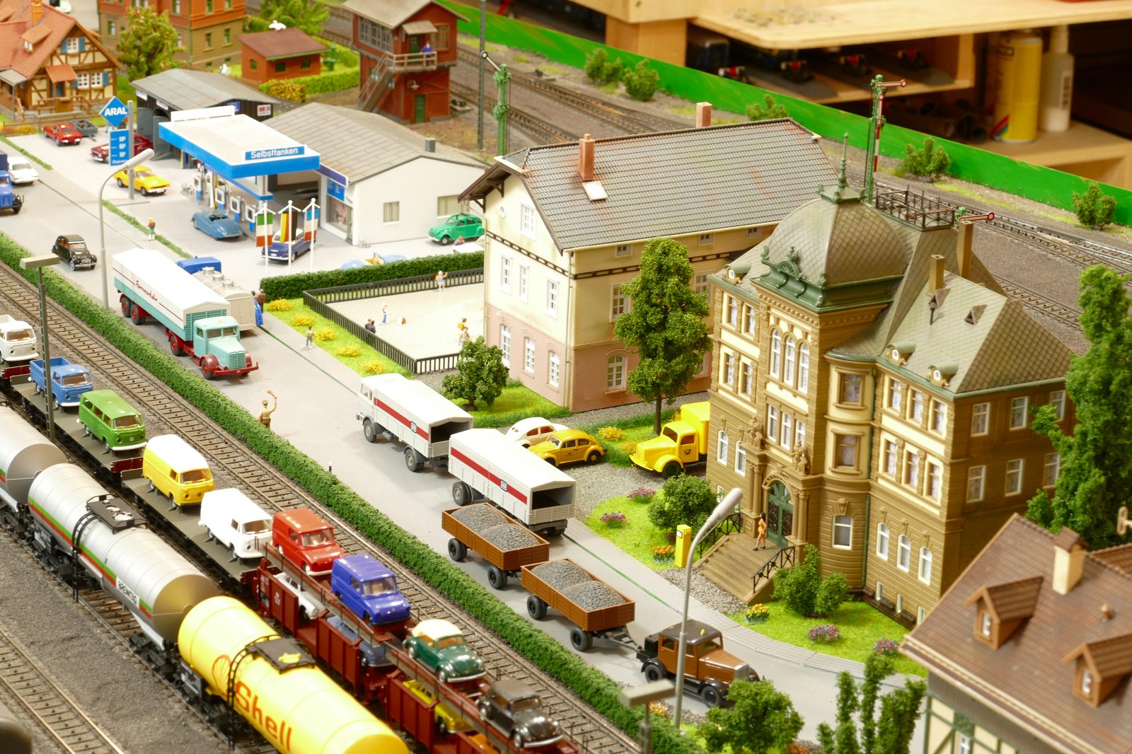 Die Stadt Brilon-Wald ist der Mittelpunkt meiner Modelleisenbahnanlage. Sie erstreckt sich hauptsächlich entlang der Bahnhofstraße, breitet sich aber auch weiter aus ins Bergland und besitzt ein außerhalb gelegenes größeres Gewerbegebiet, das ich separat vorstelle. Brilon-Wald bietet also für seine Bewohner zahlreiche Arbeitsplätze, einen großen Bahnhof mit Gepäckabfertigung und Güterbahnhof sowie Betriebswerk. Weiterhin gibt es eine Polizeistation, die rund um die Uhr besetzt ist. Stadtverwaltung, Schule, Post, Werkstätten, Tankstelle, Einkaufmöglichkeiten, alles ist noch per Fuß zu erreichen.