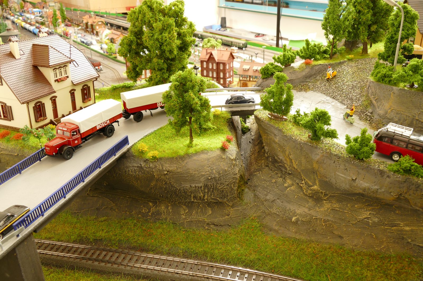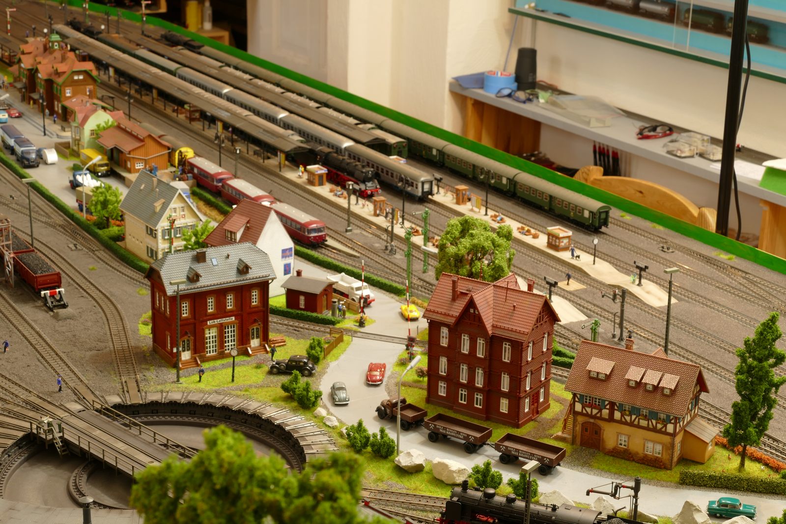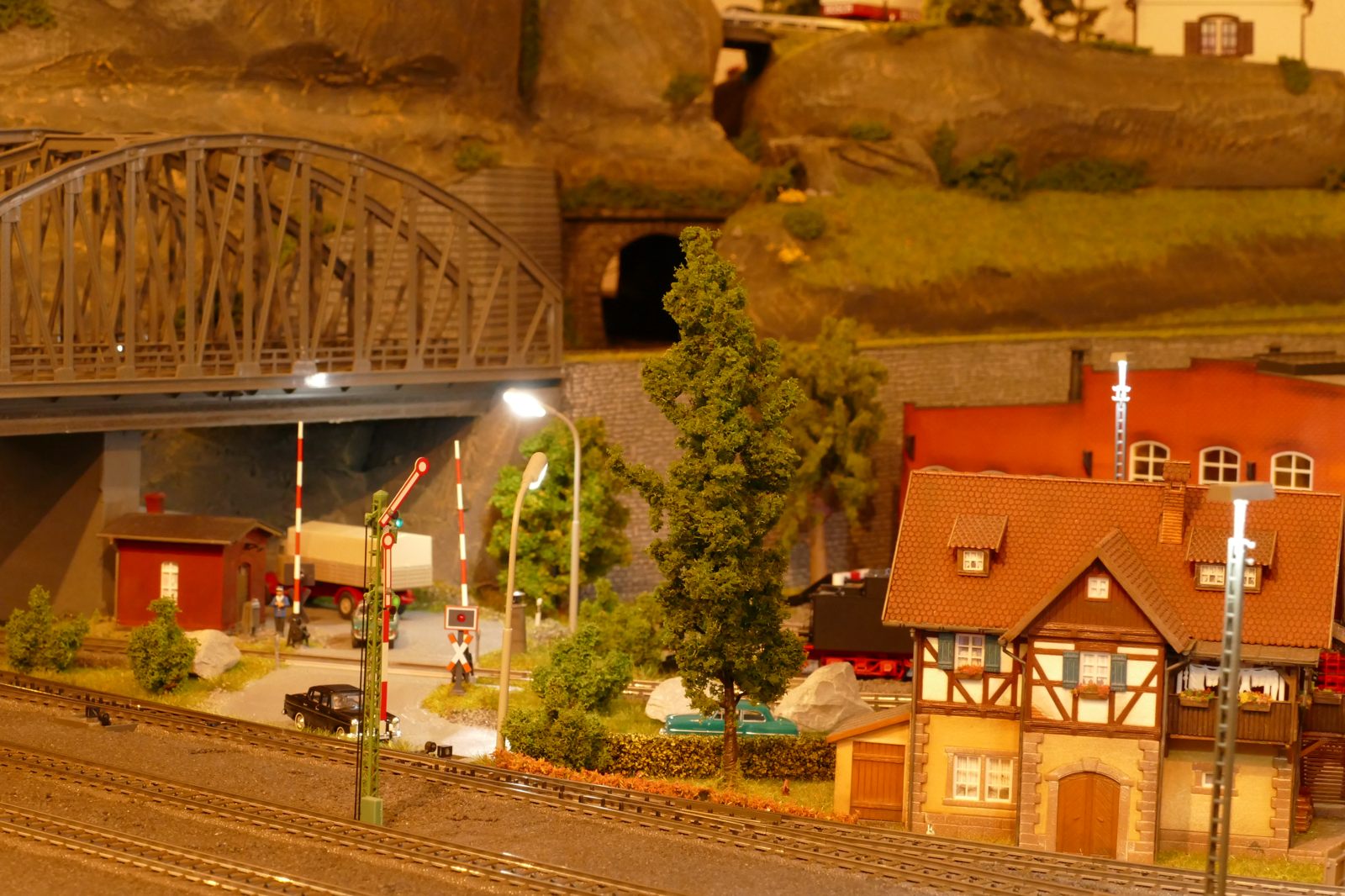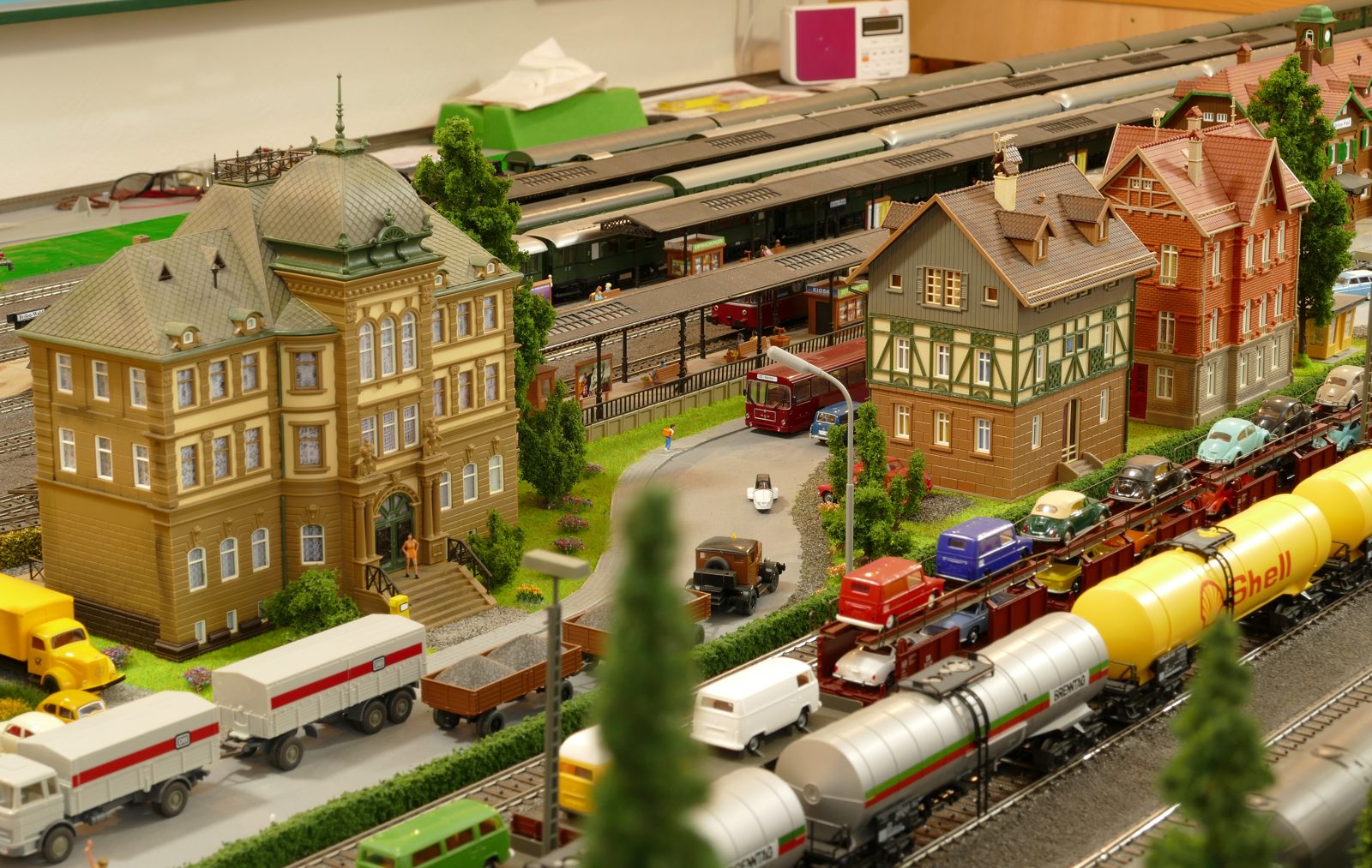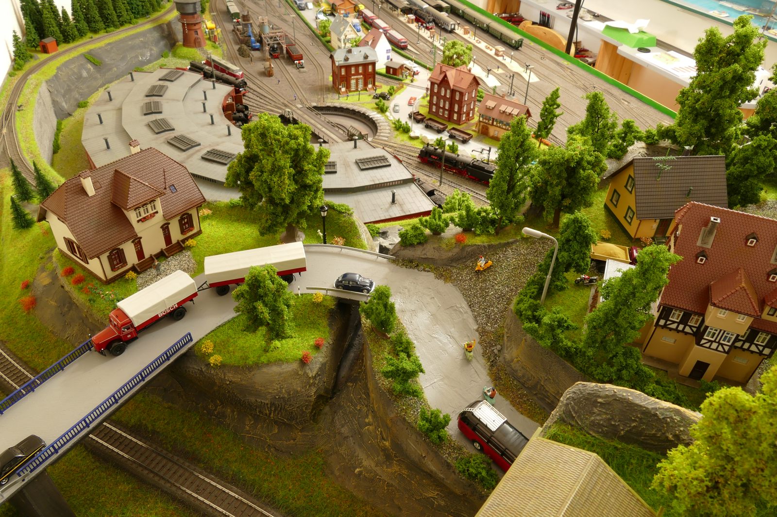 Die Stadt Brilon-Wald ist der Mittelpunkt meiner Modelleisenbahnanlage. Sie erstreckt sich hauptsächlich entlang der Bahnhofstraße, breitet sich aber auch weiter aus ins Bergland und besitzt ein außerhalb gelegenes größeres Gewerbegebiet, das ich separat vorstelle. Brilon-Wald bietet also für seine Bewohner zahlreiche Arbeitsplätze, einen großen Bahnhof mit Gepäckabfertigung und Güterbahnhof sowie Betriebswerk. Weiterhin gibt es eine Polizeistation, die rund um die Uhr besetzt ist. Stadtverwaltung, Schule, Post, Werkstätten, Tankstelle, Einkaufmöglichkeiten, alles ist noch per Fuß zu erreichen.