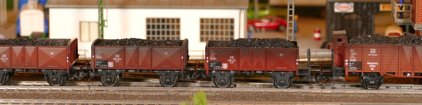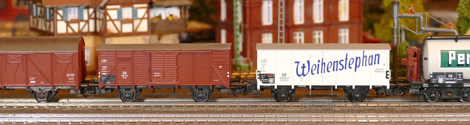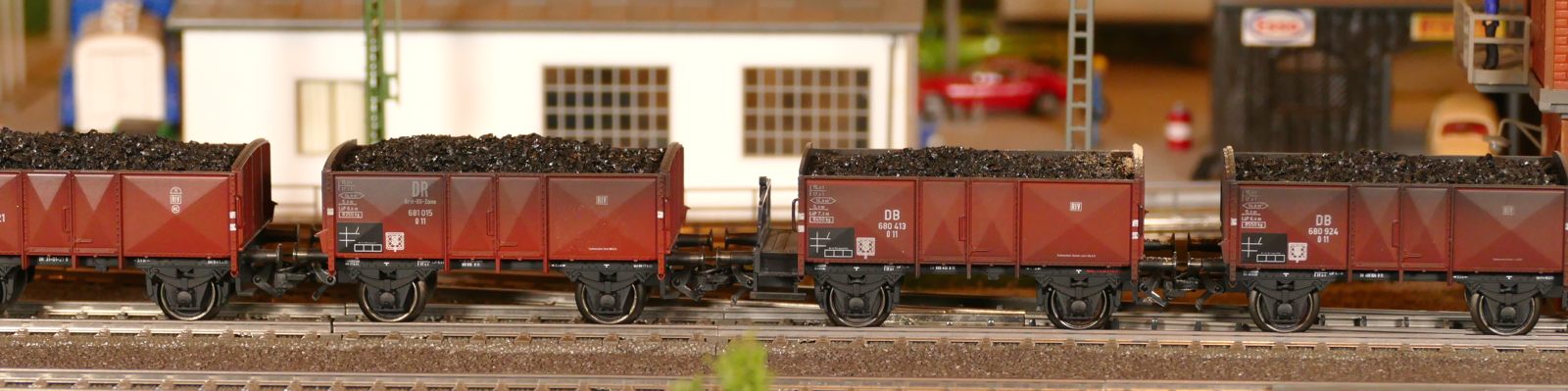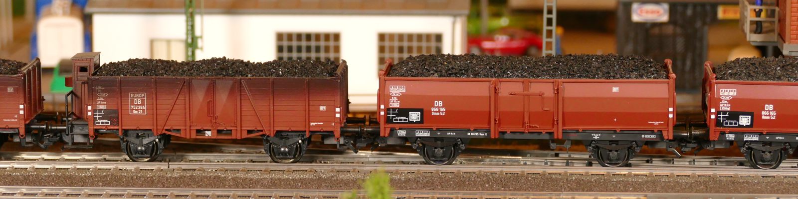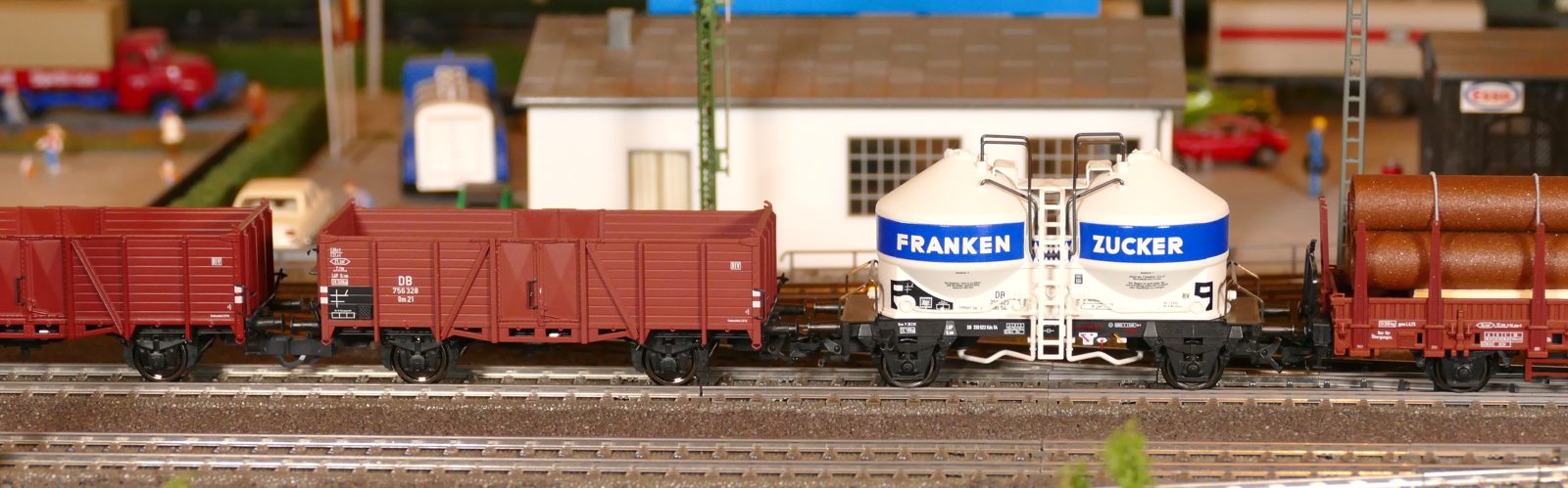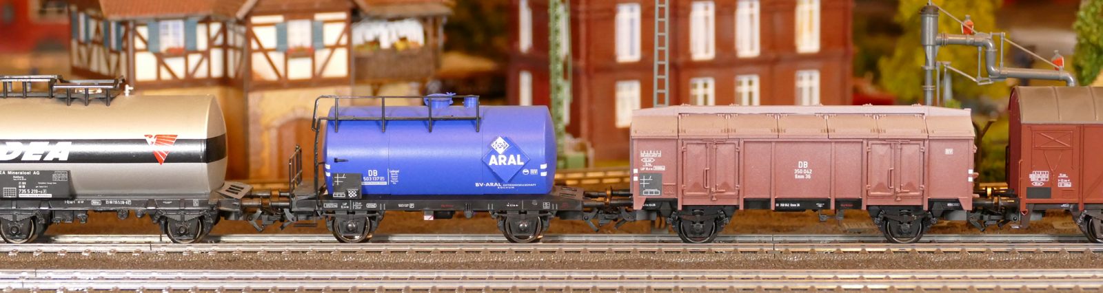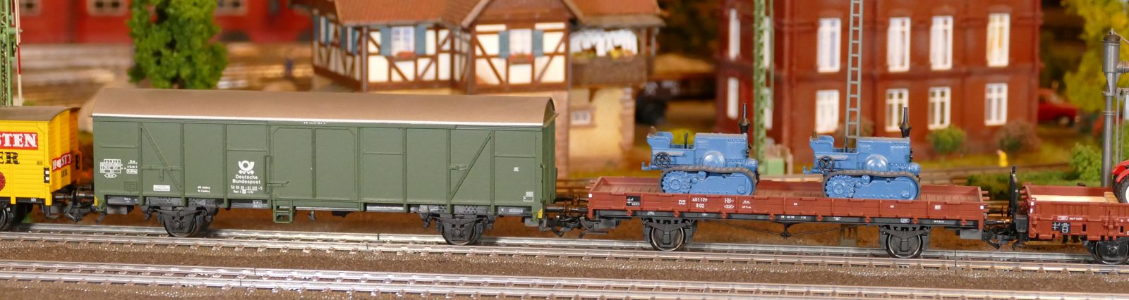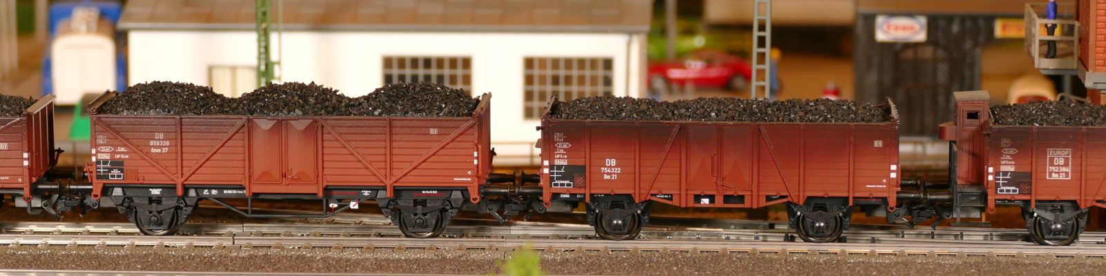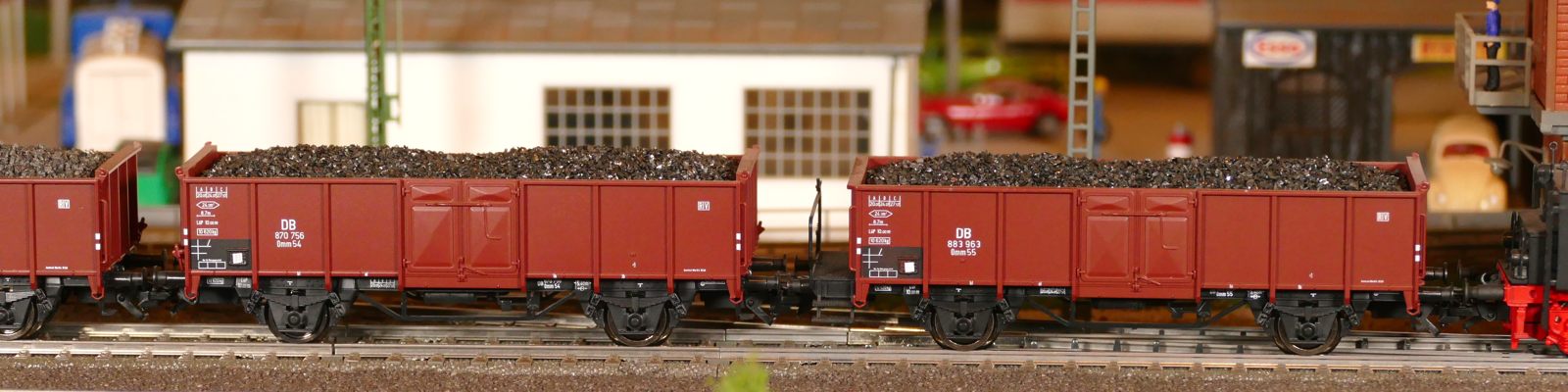 In den Jahren nach dem 2. Weltkrieg oblag es unseren Güterzügen, die durch den Krieg am Boden liegende deutsche Wirtschaft wieder flott zu machen. Sie bildeten das Rückgrat der deutschen Wirtschaft. Landauf, landab mussten Güter von A nach B usw. transportiert werden. Der Lkw-Verkehr spielte noch nicht die Rolle, die er heute hat. Dennoch hatte die Deutsche Bundesbahn ihre liebe Not, dem immer größer werdenden Transportvolumen per Lkw-Verkehr Paroli zu bieten. Bis weit in die 1970er Jahre transportierten Dampfgüterzüge Kohle, Erz und Stahl zwischen den Nordseehäfen und den Industriezentren an Rhein-Ruhr und Saar. Doch auch dieses Seqment machten ihnen in den 1970ern die Elektro- und Diesellokomotiven streitig. Auf einer Modellbahn kann ich alle drei Traktionsarten nach Lust und Laune einsetzen, sollte aber dennoch die Dominanz der Dampflokomotiven in der Epoche III im Güterverkehr nicht außer acht lassen. Freut euch auf lange oder kurze, in jedem Fall abwechslungsreiche Güterzüge oder auch Ganzzüge. Um etwas Platz auf dieser Site zu sparen, habe ich die kürzeren Güterwagen immer im Zweier-Set – also hintereinander bzw. im Foto nebeneinander – im Zug fotografiert. Es ist selbstverständlich, dass die hier und bei den Schnellzügen und Personenzügen gezeigte Lok-Zug-Kombination auf allen Seiten meiner Website nur eine Möglichkeit von vielen ist, die ich regelmäßig ändere. Viel Freude!