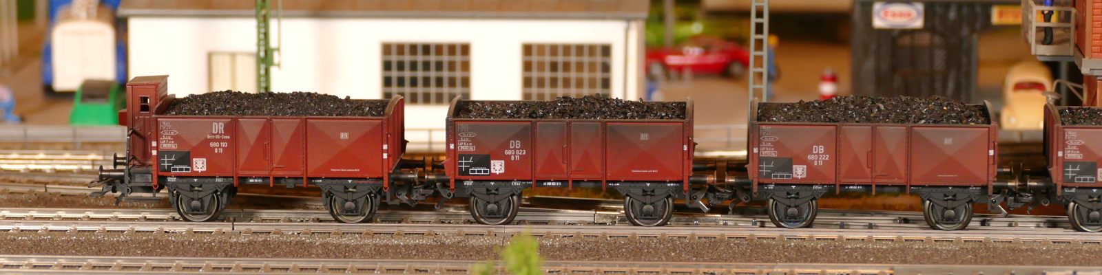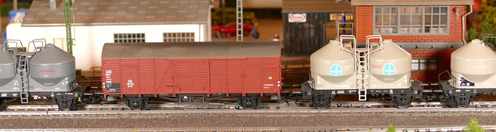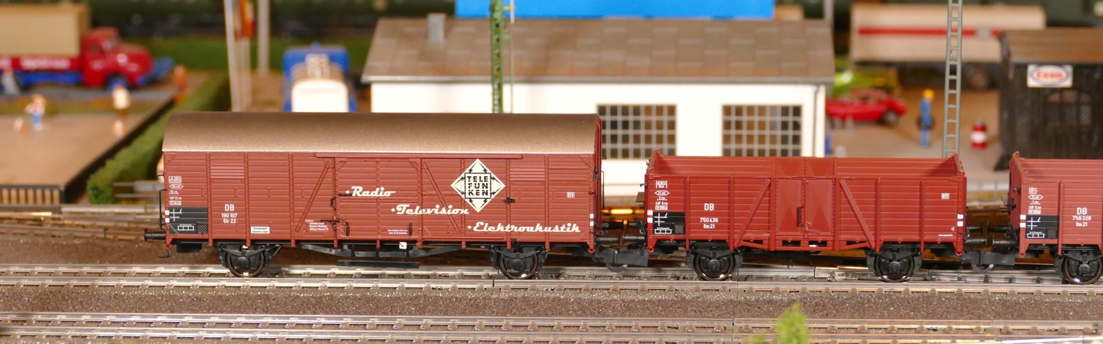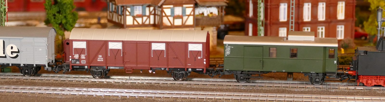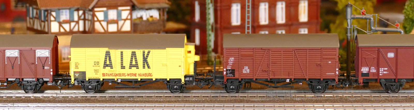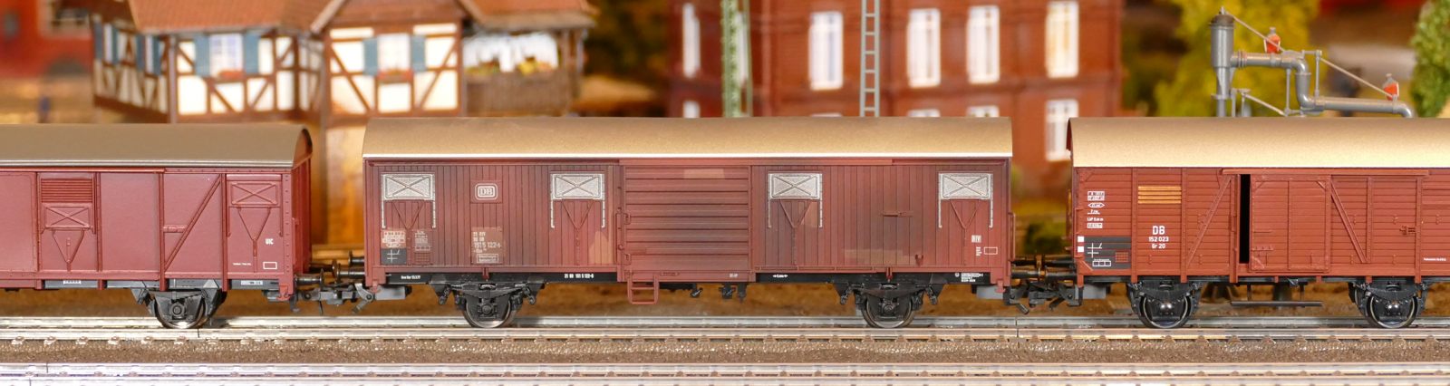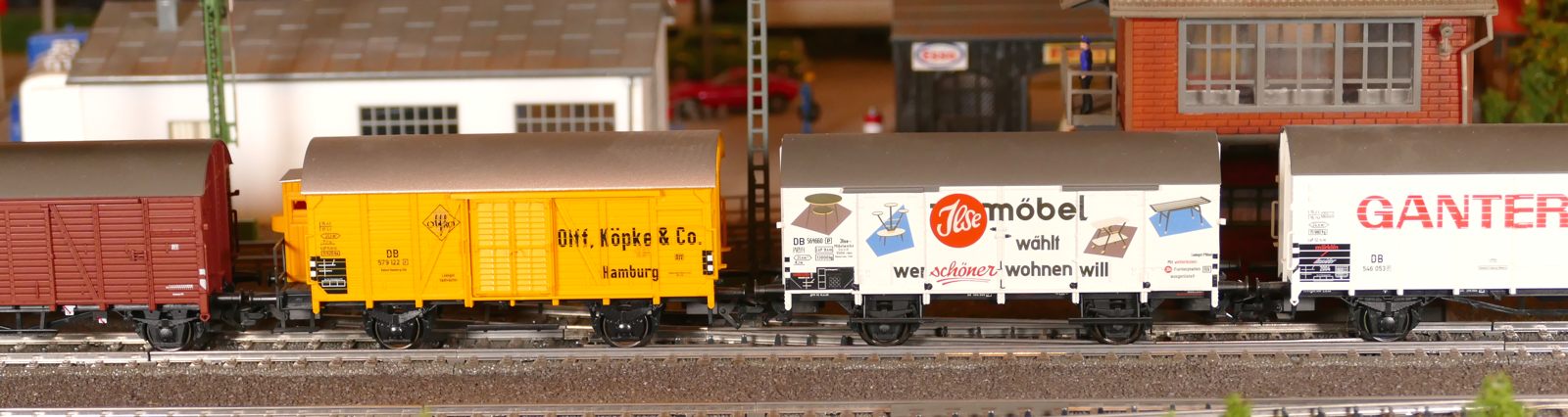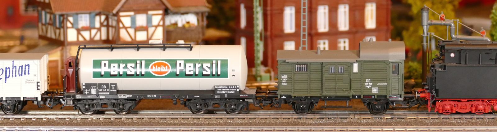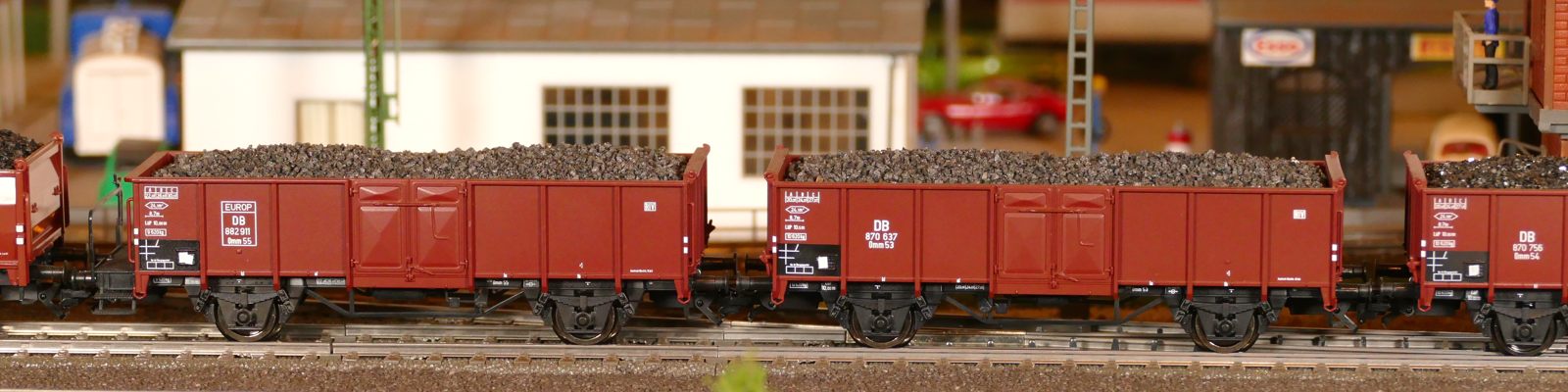 In den Jahren nach dem 2. Weltkrieg oblag es unseren Güterzügen, die durch den Krieg am Boden liegende deutsche Wirtschaft wieder flott zu machen. Sie bildeten das Rückgrat der deutschen Wirtschaft. Landauf, landab mussten Güter von A nach B usw. transportiert werden. Der Lkw-Verkehr spielte noch nicht die Rolle, die er heute hat. Dennoch hatte die Deutsche Bundesbahn ihre liebe Not, dem immer größer werdenden Transportvolumen per Lkw-Verkehr Paroli zu bieten. Bis weit in die 1970er Jahre transportierten Dampfgüterzüge Kohle, Erz und Stahl zwischen den Nordseehäfen und den Industriezentren an Rhein-Ruhr und Saar. Doch auch dieses Seqment machten ihnen in den 1970ern die Elektro- und Diesellokomotiven streitig. Auf einer Modellbahn kann ich alle drei Traktionsarten nach Lust und Laune einsetzen, sollte aber dennoch die Dominanz der Dampflokomotiven in der Epoche III im Güterverkehr nicht außer acht lassen. Freut euch auf lange oder kurze, in jedem Fall abwechslungsreiche Güterzüge oder auch Ganzzüge. Um etwas Platz auf dieser Site zu sparen, habe ich die kürzeren Güterwagen immer im Zweier-Set – also hintereinander bzw. im Foto nebeneinander – im Zug fotografiert. Es ist selbstverständlich, dass die hier und bei den Schnellzügen und Personenzügen gezeigte Lok-Zug-Kombination auf allen Seiten meiner Website nur eine Möglichkeit von vielen ist, die ich regelmäßig ändere. Viel Freude!