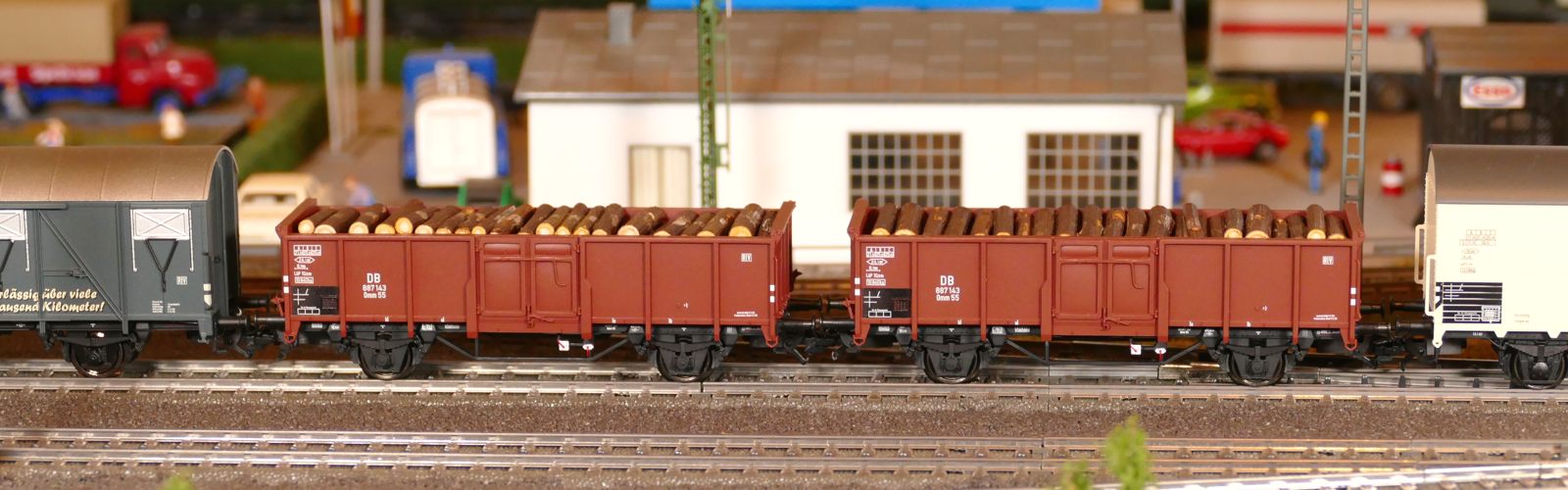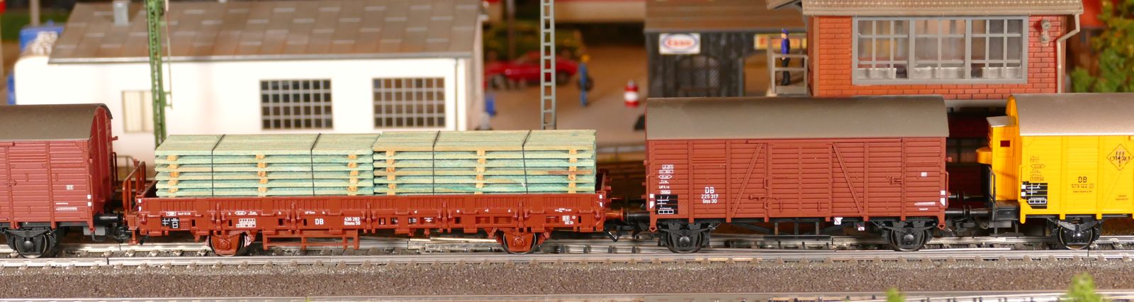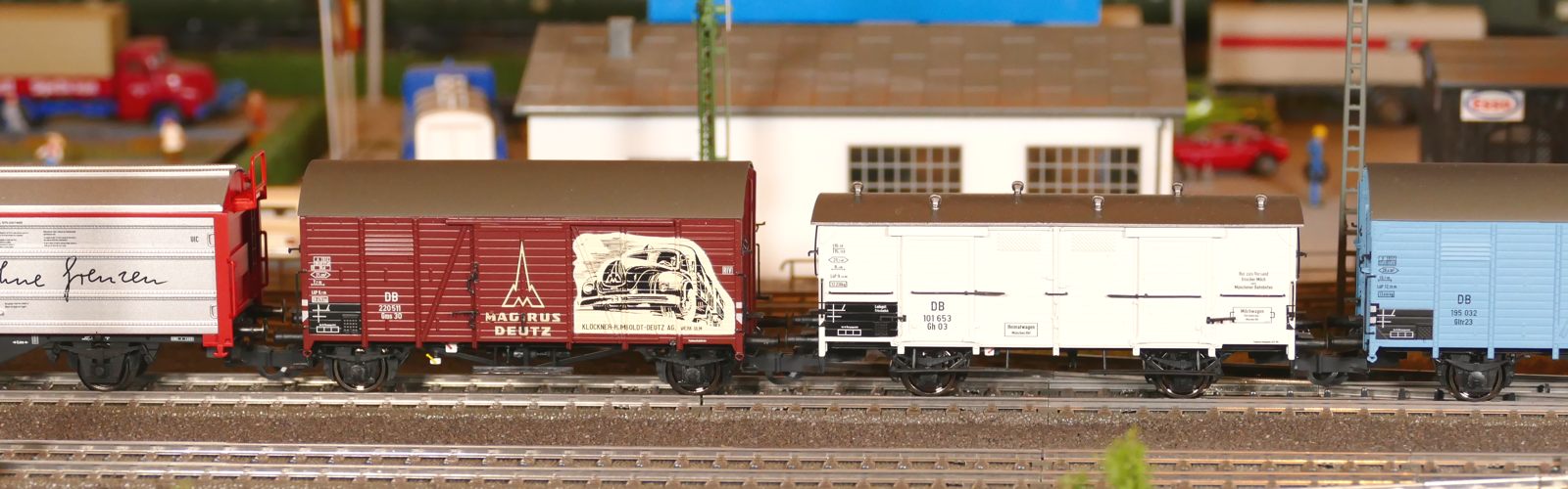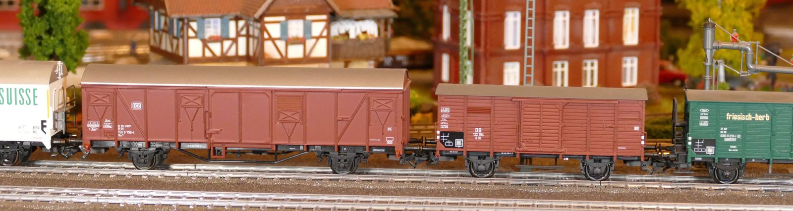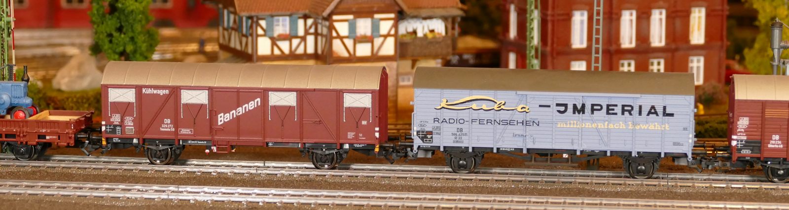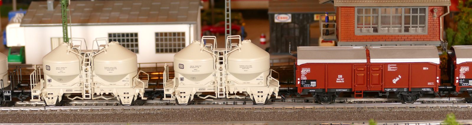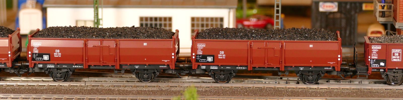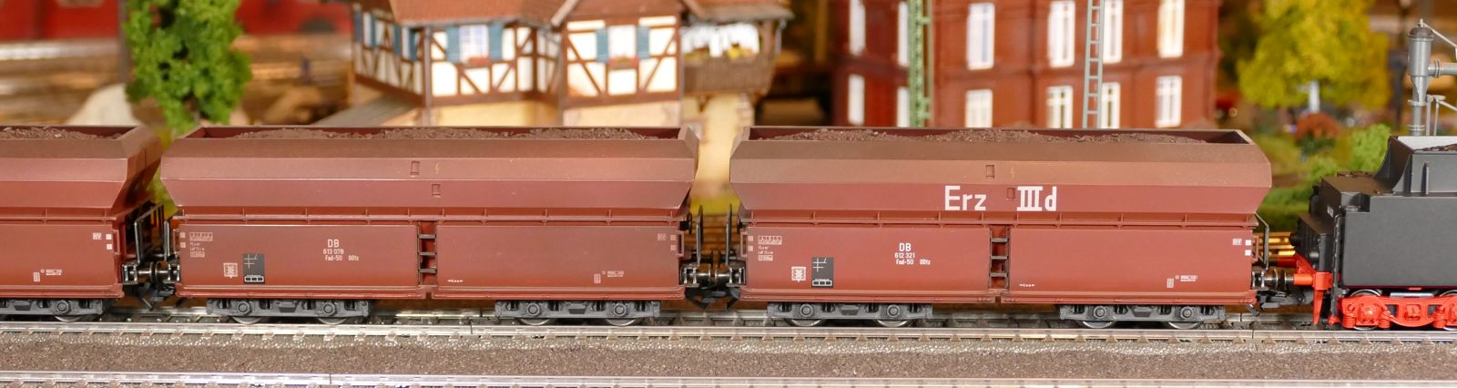 In den Jahren nach dem 2. Weltkrieg oblag es unseren Güterzügen, die durch den Krieg am Boden liegende deutsche Wirtschaft wieder flott zu machen. Sie bildeten das Rückgrat der deutschen Wirtschaft. Landauf, landab mussten Güter von A nach B usw. transportiert werden. Der Lkw-Verkehr spielte noch nicht die Rolle, die er heute hat. Dennoch hatte die Deutsche Bundesbahn ihre liebe Not, dem immer größer werdenden Transportvolumen per Lkw-Verkehr Paroli zu bieten. Bis weit in die 1970er Jahre transportierten Dampfgüterzüge Kohle, Erz und Stahl zwischen den Nordseehäfen und den Industriezentren an Rhein-Ruhr und Saar. Doch auch dieses Seqment machten ihnen in den 1970ern die Elektro- und Diesellokomotiven streitig. Auf einer Modellbahn kann ich alle drei Traktionsarten nach Lust und Laune einsetzen, sollte aber dennoch die Dominanz der Dampflokomotiven in der Epoche III im Güterverkehr nicht außer acht lassen. Freut euch auf lange oder kurze, in jedem Fall abwechslungsreiche Güterzüge oder auch Ganzzüge. Um etwas Platz auf dieser Site zu sparen, habe ich die kürzeren Güterwagen immer im Zweier-Set – also hintereinander bzw. im Foto nebeneinander – im Zug fotografiert. Es ist selbstverständlich, dass die hier und bei den Schnellzügen und Personenzügen gezeigte Lok-Zug-Kombination auf allen Seiten meiner Website nur eine Möglichkeit von vielen ist, die ich regelmäßig ändere. Viel Freude!