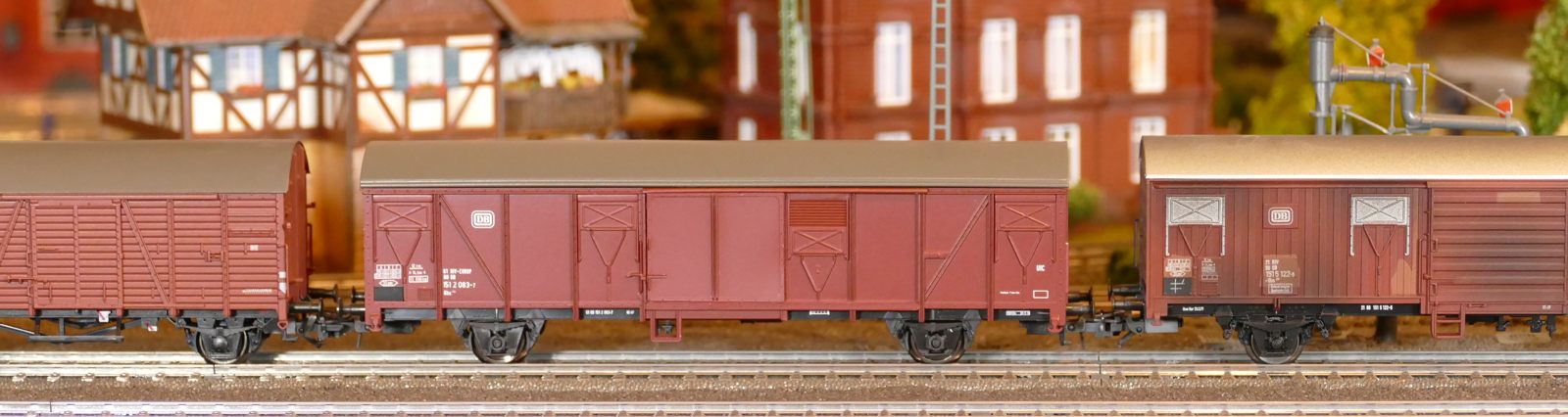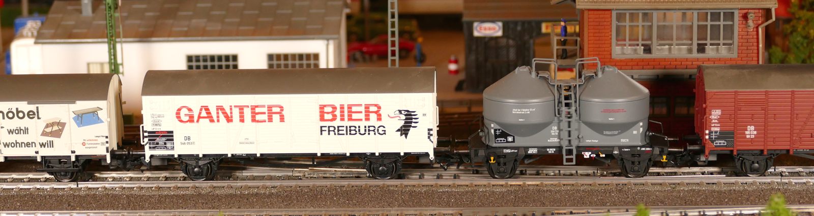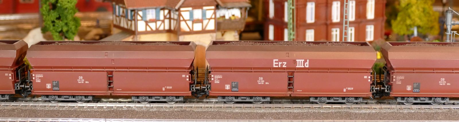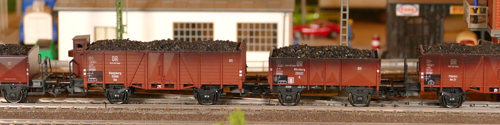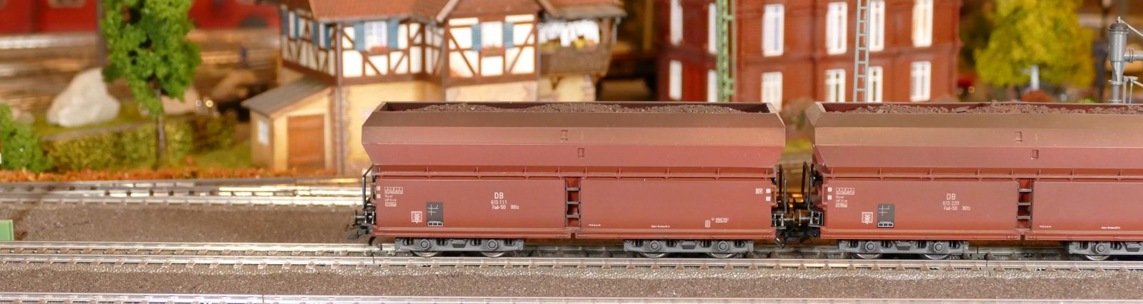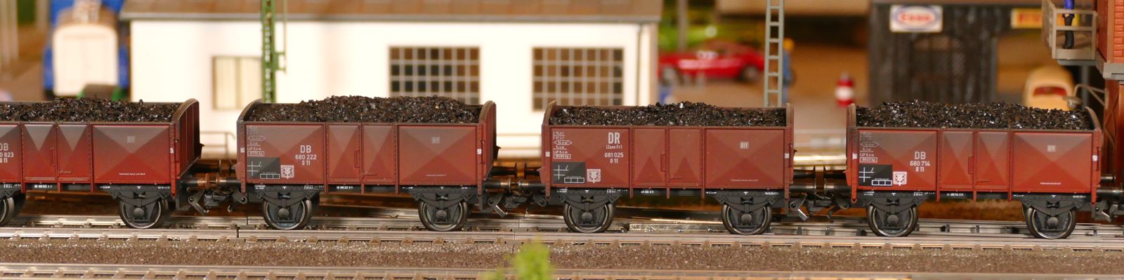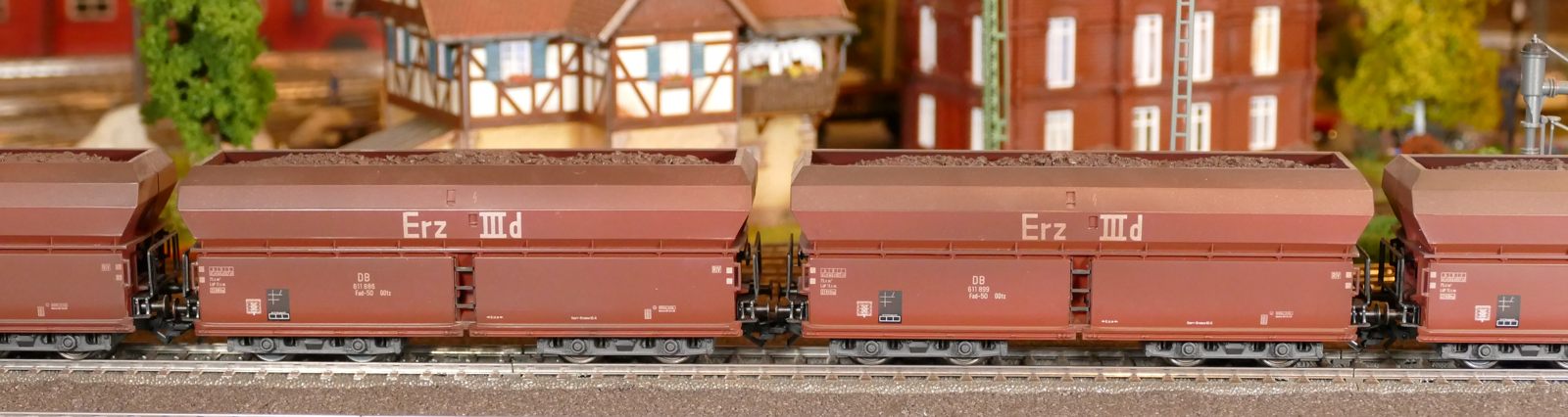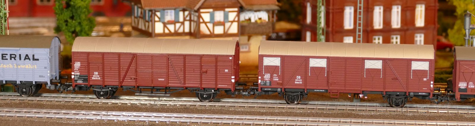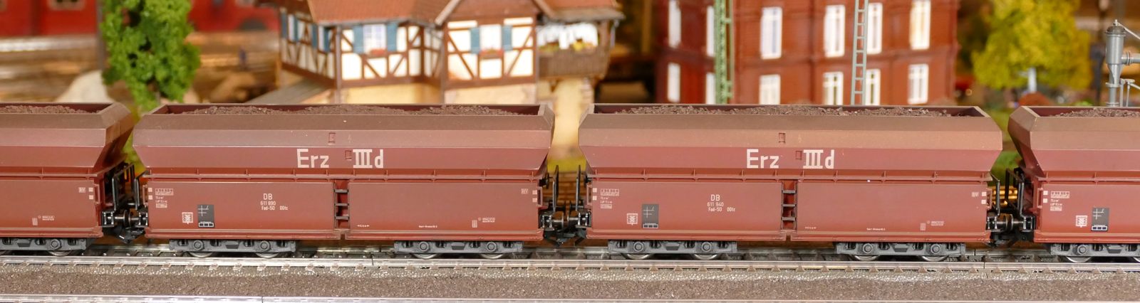 In den Jahren nach dem 2. Weltkrieg oblag es unseren Güterzügen, die durch den Krieg am Boden liegende deutsche Wirtschaft wieder flott zu machen. Sie bildeten das Rückgrat der deutschen Wirtschaft. Landauf, landab mussten Güter von A nach B usw. transportiert werden. Der Lkw-Verkehr spielte noch nicht die Rolle, die er heute hat. Dennoch hatte die Deutsche Bundesbahn ihre liebe Not, dem immer größer werdenden Transportvolumen per Lkw-Verkehr Paroli zu bieten. Bis weit in die 1970er Jahre transportierten Dampfgüterzüge Kohle, Erz und Stahl zwischen den Nordseehäfen und den Industriezentren an Rhein-Ruhr und Saar. Doch auch dieses Seqment machten ihnen in den 1970ern die Elektro- und Diesellokomotiven streitig. Auf einer Modellbahn kann ich alle drei Traktionsarten nach Lust und Laune einsetzen, sollte aber dennoch die Dominanz der Dampflokomotiven in der Epoche III im Güterverkehr nicht außer acht lassen. Freut euch auf lange oder kurze, in jedem Fall abwechslungsreiche Güterzüge oder auch Ganzzüge. Um etwas Platz auf dieser Site zu sparen, habe ich die kürzeren Güterwagen immer im Zweier-Set – also hintereinander bzw. im Foto nebeneinander – im Zug fotografiert. Es ist selbstverständlich, dass die hier und bei den Schnellzügen und Personenzügen gezeigte Lok-Zug-Kombination auf allen Seiten meiner Website nur eine Möglichkeit von vielen ist, die ich regelmäßig ändere. Viel Freude!
