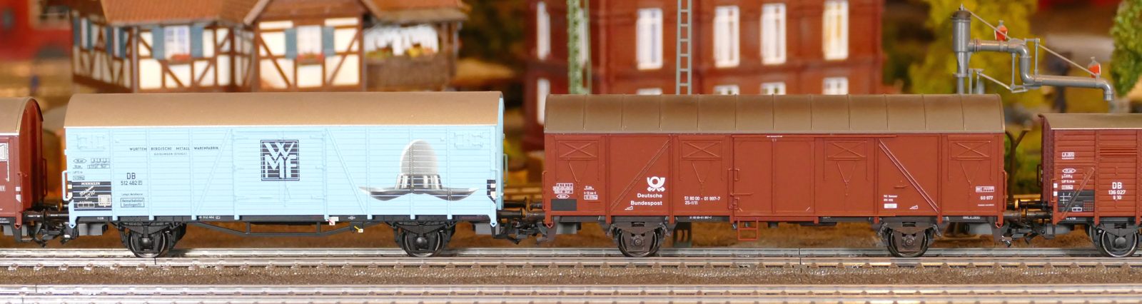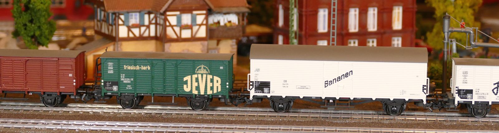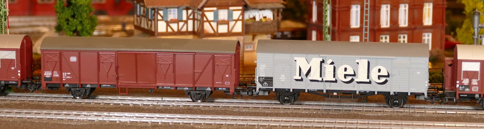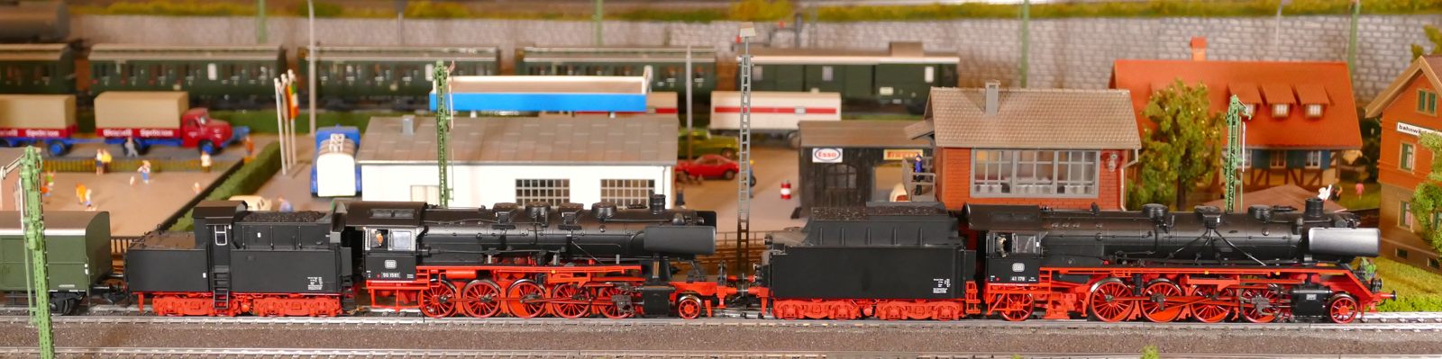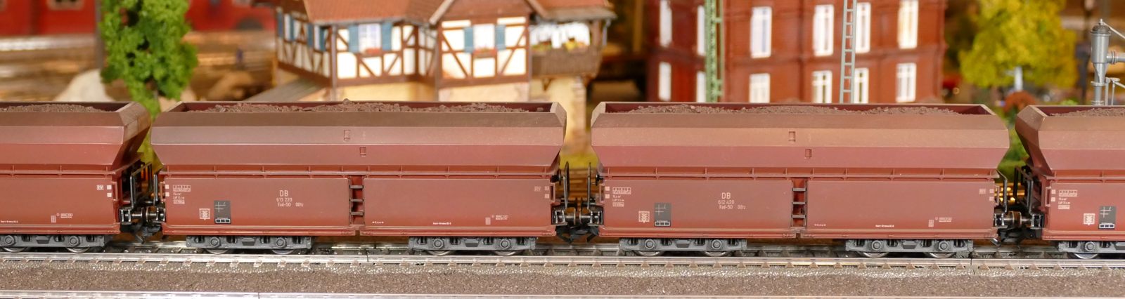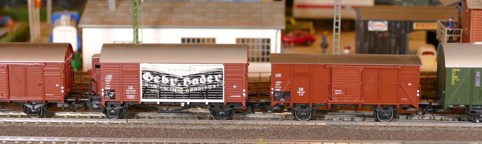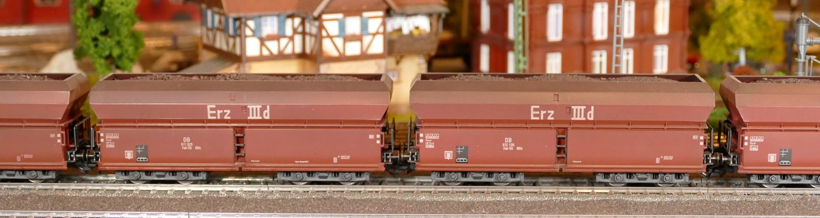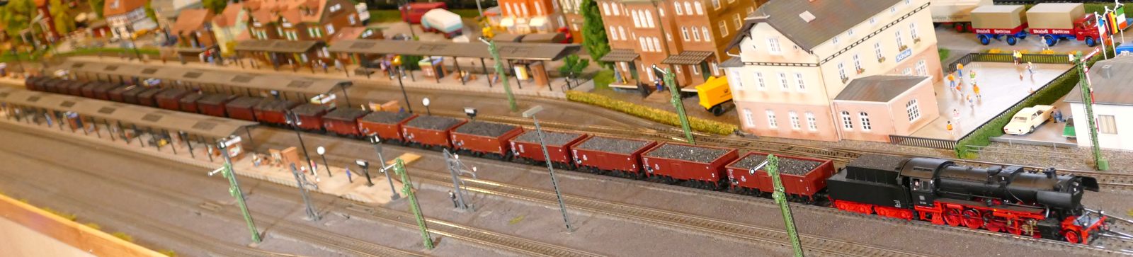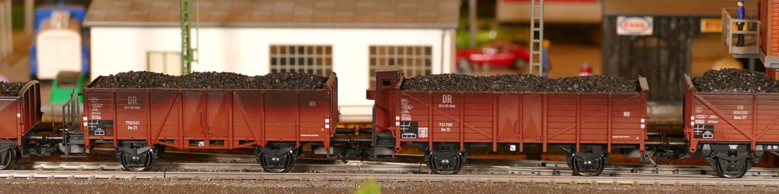 In den Jahren nach dem 2. Weltkrieg oblag es unseren Güterzügen, die durch den Krieg am Boden liegende deutsche Wirtschaft wieder flott zu machen. Sie bildeten das Rückgrat der deutschen Wirtschaft. Landauf, landab mussten Güter von A nach B usw. transportiert werden. Der Lkw-Verkehr spielte noch nicht die Rolle, die er heute hat. Dennoch hatte die Deutsche Bundesbahn ihre liebe Not, dem immer größer werdenden Transportvolumen per Lkw-Verkehr Paroli zu bieten. Bis weit in die 1970er Jahre transportierten Dampfgüterzüge Kohle, Erz und Stahl zwischen den Nordseehäfen und den Industriezentren an Rhein-Ruhr und Saar. Doch auch dieses Seqment machten ihnen in den 1970ern die Elektro- und Diesellokomotiven streitig. Auf einer Modellbahn kann ich alle drei Traktionsarten nach Lust und Laune einsetzen, sollte aber dennoch die Dominanz der Dampflokomotiven in der Epoche III im Güterverkehr nicht außer acht lassen. Freut euch auf lange oder kurze, in jedem Fall abwechslungsreiche Güterzüge oder auch Ganzzüge. Um etwas Platz auf dieser Site zu sparen, habe ich die kürzeren Güterwagen immer im Zweier-Set – also hintereinander bzw. im Foto nebeneinander – im Zug fotografiert. Es ist selbstverständlich, dass die hier und bei den Schnellzügen und Personenzügen gezeigte Lok-Zug-Kombination auf allen Seiten meiner Website nur eine Möglichkeit von vielen ist, die ich regelmäßig ändere. Viel Freude!