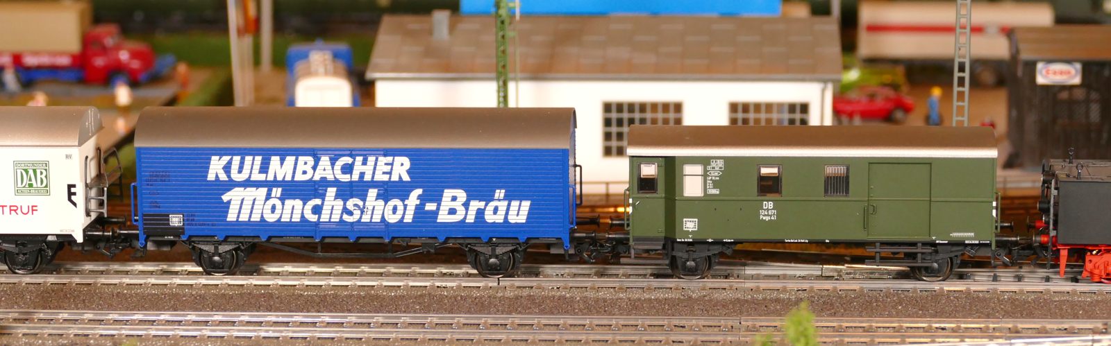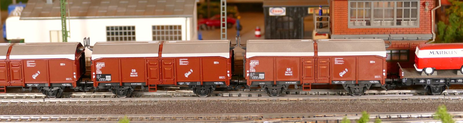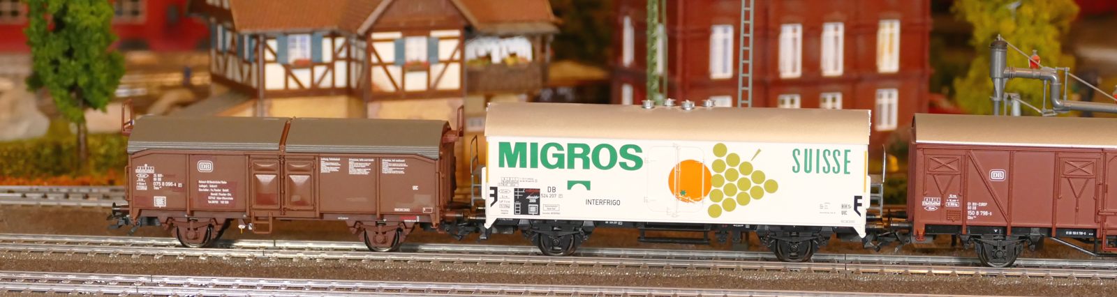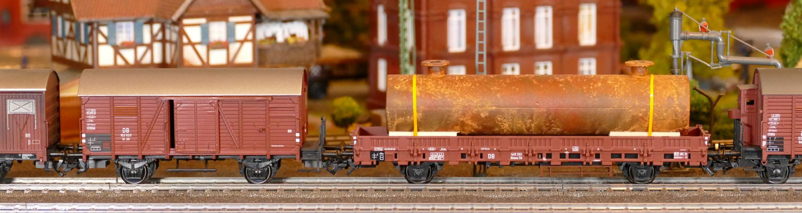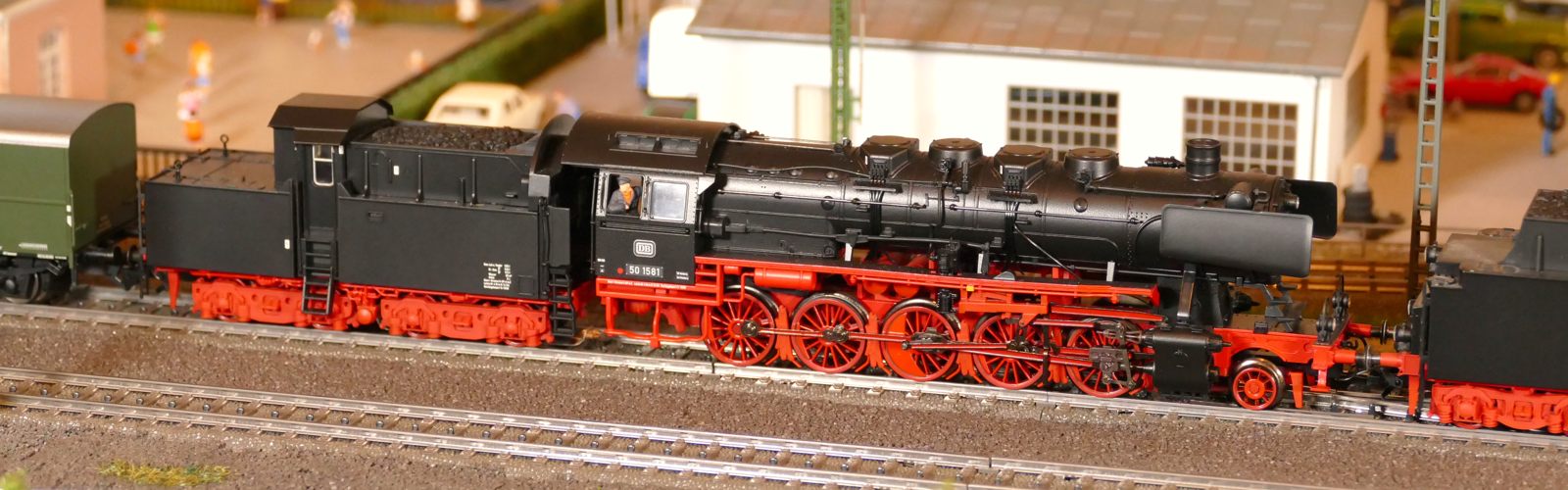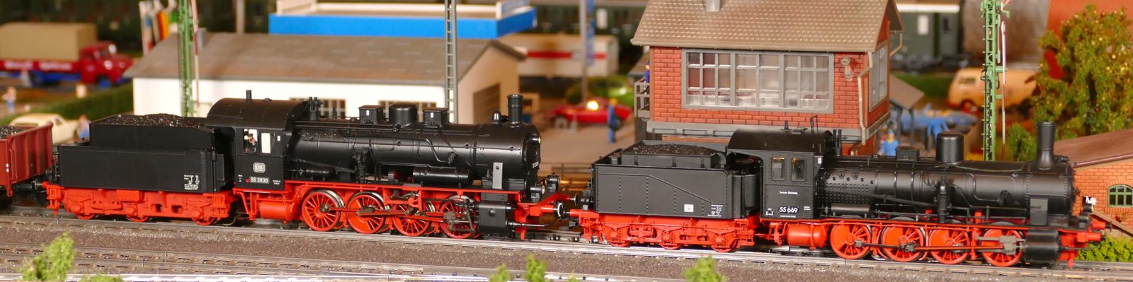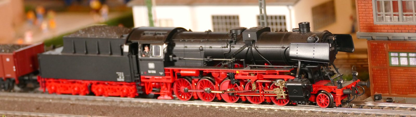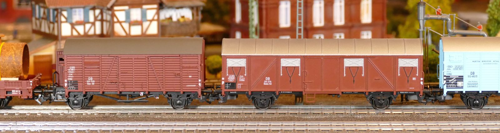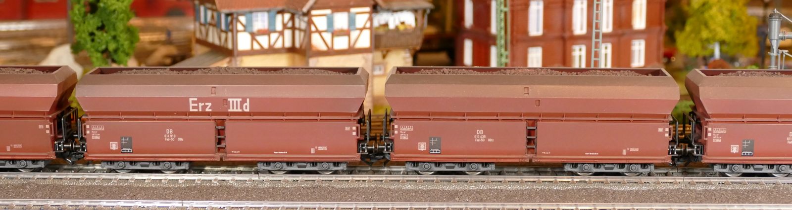 In den Jahren nach dem 2. Weltkrieg oblag es unseren Güterzügen, die durch den Krieg am Boden liegende deutsche Wirtschaft wieder flott zu machen. Sie bildeten das Rückgrat der deutschen Wirtschaft. Landauf, landab mussten Güter von A nach B usw. transportiert werden. Der Lkw-Verkehr spielte noch nicht die Rolle, die er heute hat. Dennoch hatte die Deutsche Bundesbahn ihre liebe Not, dem immer größer werdenden Transportvolumen per Lkw-Verkehr Paroli zu bieten. Bis weit in die 1970er Jahre transportierten Dampfgüterzüge Kohle, Erz und Stahl zwischen den Nordseehäfen und den Industriezentren an Rhein-Ruhr und Saar. Doch auch dieses Seqment machten ihnen in den 1970ern die Elektro- und Diesellokomotiven streitig. Auf einer Modellbahn kann ich alle drei Traktionsarten nach Lust und Laune einsetzen, sollte aber dennoch die Dominanz der Dampflokomotiven in der Epoche III im Güterverkehr nicht außer acht lassen. Freut euch auf lange oder kurze, in jedem Fall abwechslungsreiche Güterzüge oder auch Ganzzüge. Um etwas Platz auf dieser Site zu sparen, habe ich die kürzeren Güterwagen immer im Zweier-Set – also hintereinander bzw. im Foto nebeneinander – im Zug fotografiert. Es ist selbstverständlich, dass die hier und bei den Schnellzügen und Personenzügen gezeigte Lok-Zug-Kombination auf allen Seiten meiner Website nur eine Möglichkeit von vielen ist, die ich regelmäßig ändere. Viel Freude!