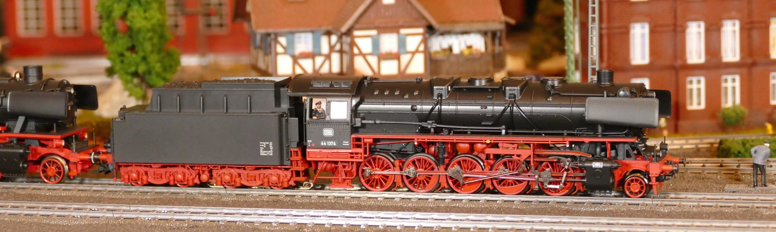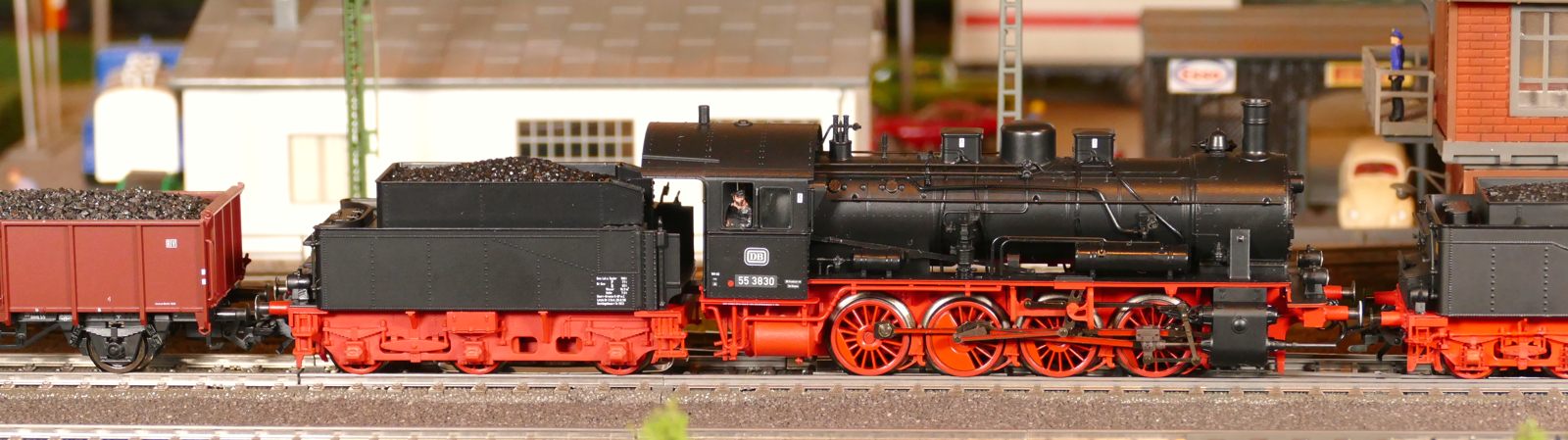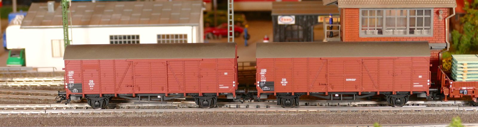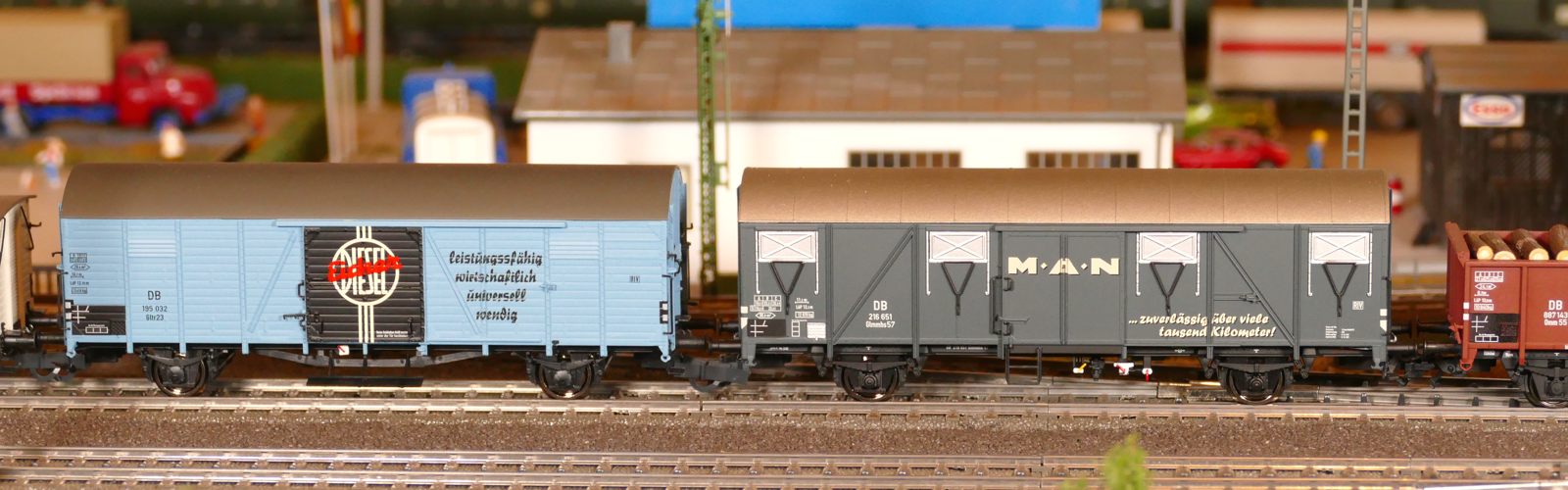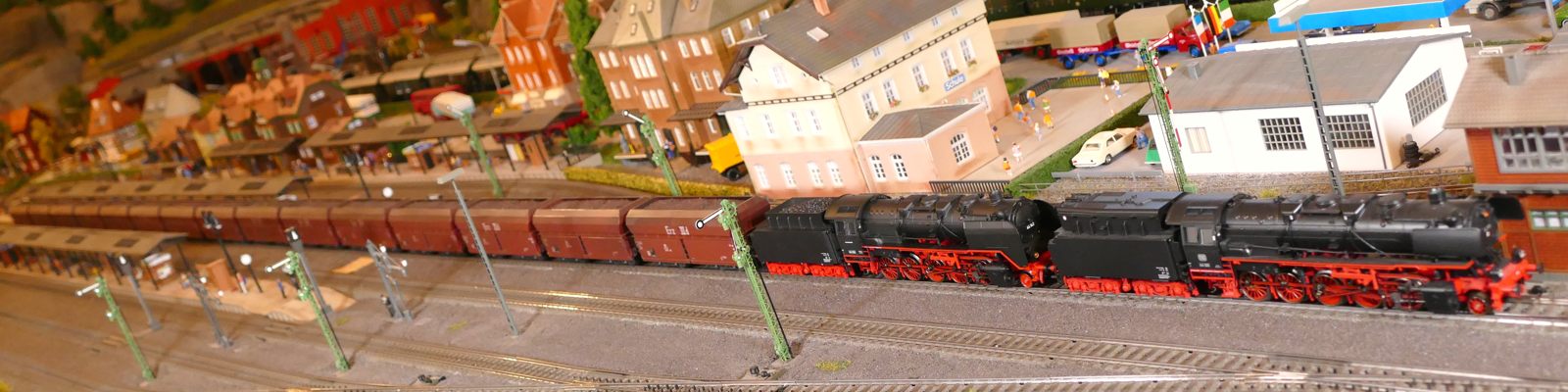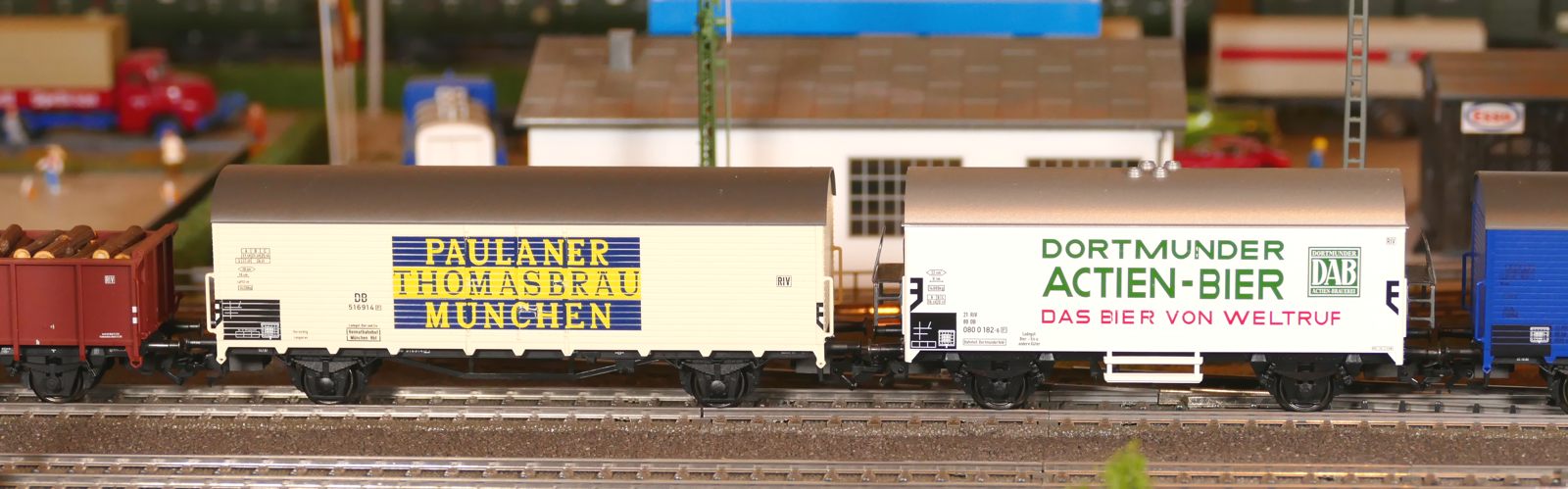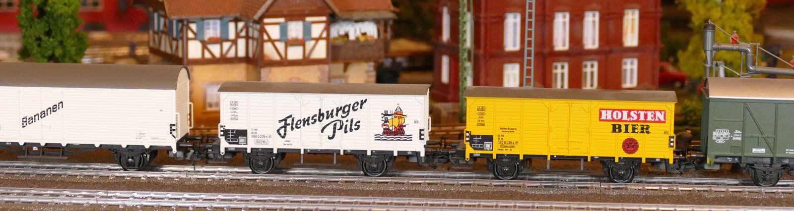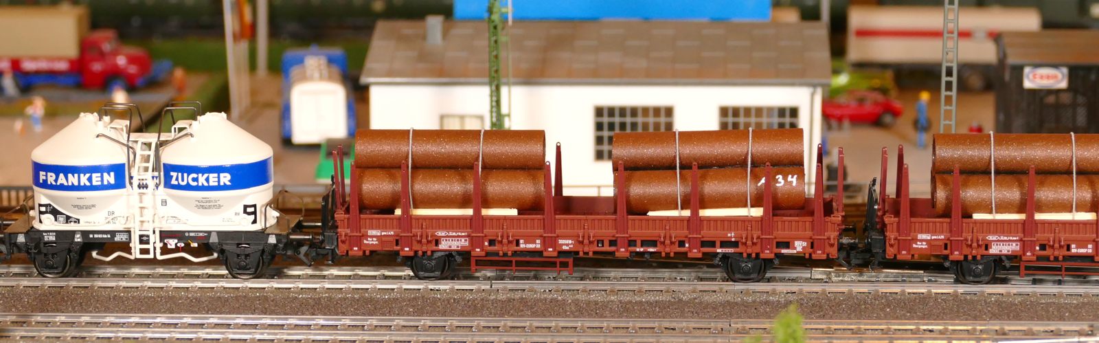 In den Jahren nach dem 2. Weltkrieg oblag es unseren Güterzügen, die durch den Krieg am Boden liegende deutsche Wirtschaft wieder flott zu machen. Sie bildeten das Rückgrat der deutschen Wirtschaft. Landauf, landab mussten Güter von A nach B usw. transportiert werden. Der Lkw-Verkehr spielte noch nicht die Rolle, die er heute hat. Dennoch hatte die Deutsche Bundesbahn ihre liebe Not, dem immer größer werdenden Transportvolumen per Lkw-Verkehr Paroli zu bieten. Bis weit in die 1970er Jahre transportierten Dampfgüterzüge Kohle, Erz und Stahl zwischen den Nordseehäfen und den Industriezentren an Rhein-Ruhr und Saar. Doch auch dieses Seqment machten ihnen in den 1970ern die Elektro- und Diesellokomotiven streitig. Auf einer Modellbahn kann ich alle drei Traktionsarten nach Lust und Laune einsetzen, sollte aber dennoch die Dominanz der Dampflokomotiven in der Epoche III im Güterverkehr nicht außer acht lassen. Freut euch auf lange oder kurze, in jedem Fall abwechslungsreiche Güterzüge oder auch Ganzzüge. Um etwas Platz auf dieser Site zu sparen, habe ich die kürzeren Güterwagen immer im Zweier-Set – also hintereinander bzw. im Foto nebeneinander – im Zug fotografiert. Es ist selbstverständlich, dass die hier und bei den Schnellzügen und Personenzügen gezeigte Lok-Zug-Kombination auf allen Seiten meiner Website nur eine Möglichkeit von vielen ist, die ich regelmäßig ändere. Viel Freude!