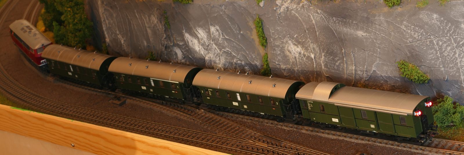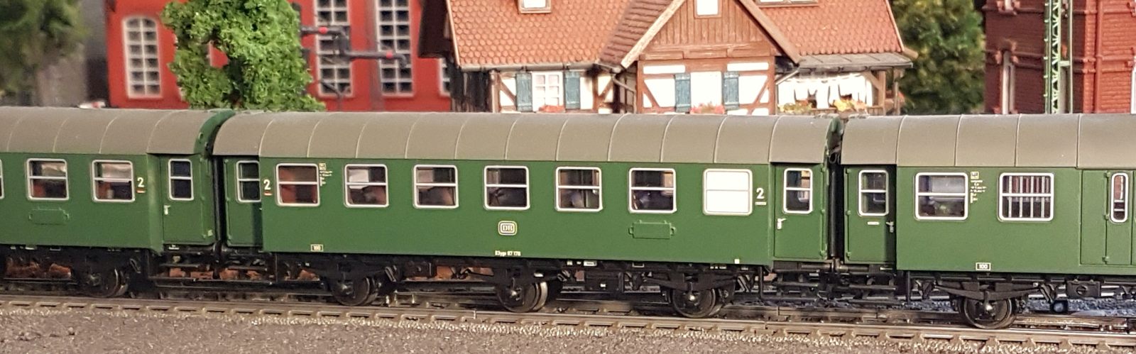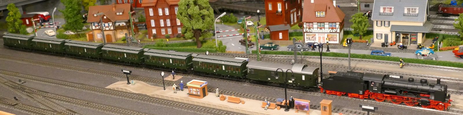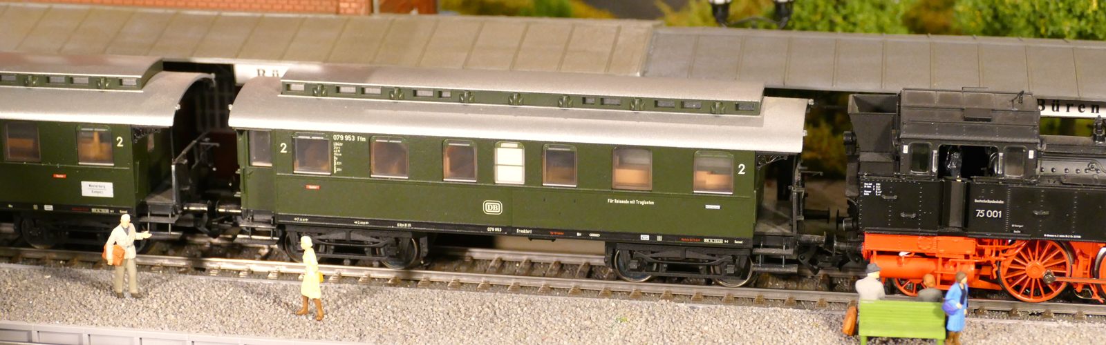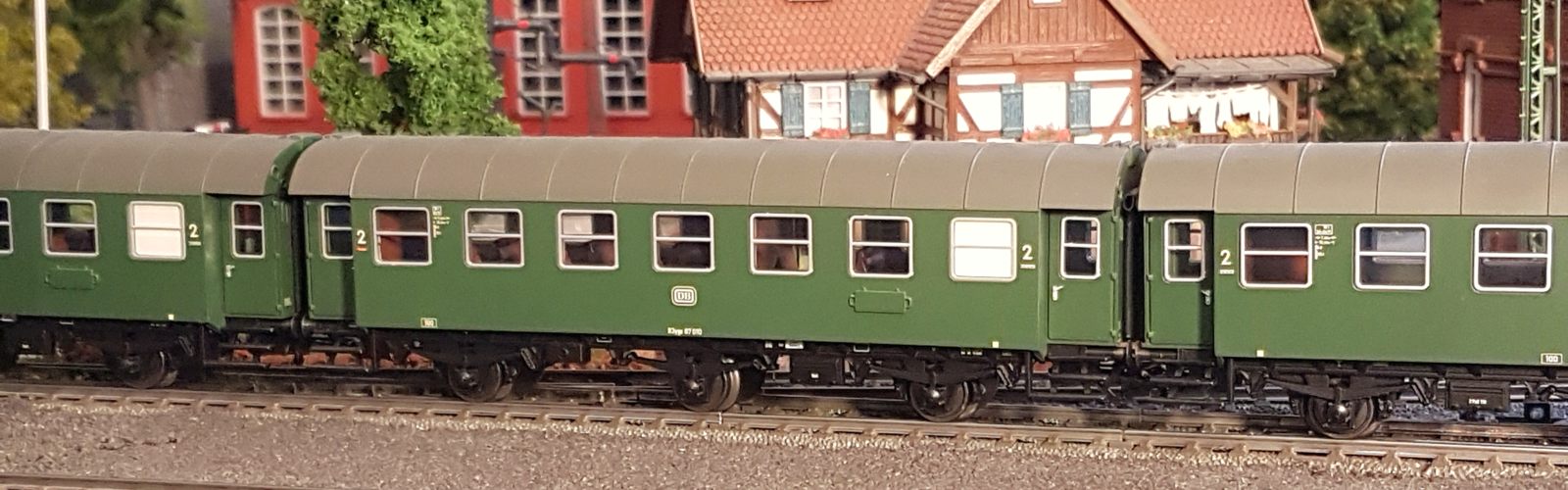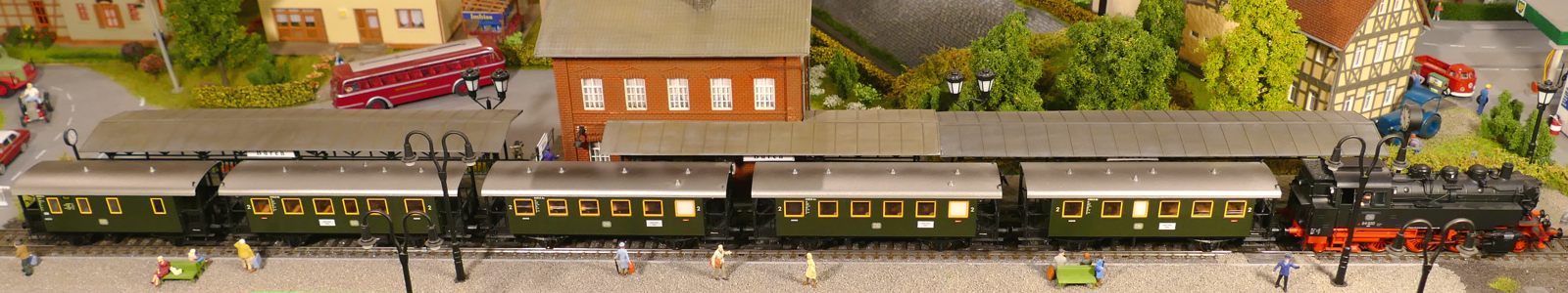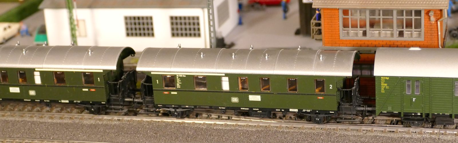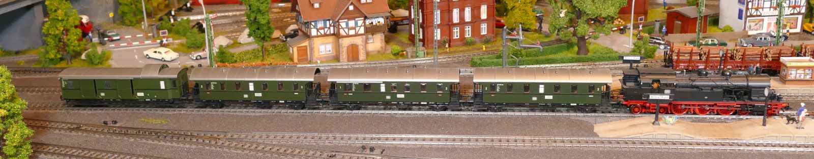 Damals, in den 1950er bis 1970er Jahren gab es geradezu unzählige unterschiedliche Personenwagentypen für den Nahverkehr. Zweiachser, Dreiachser und Vierachser waren im Einsatz, fast immer in der Farbe grün. Bis auf die Triebwagen (Diesel, Elektro, auch Akku) wurden alle Züge von Lokomotiven gezogen oder geschoben. Bahninteressierte Personen erfreuten sich an Dampf-, Diesel- und Elektrolokomotiven verschiedenster Baureihen. 1951 betrug der Anteil der Dampflokomotiven bei der DB ca. 95%; hinzu kamen ca. 1% Dieselloks und 4% E-Loks. 1960 hatte sich das Verhältnis zischen den Loktypen schon erheblich zu Ungunsten der Dampftraktionn geändert. Von den ca. 10.300 Lokomotiven und Triebwagen wurden nur noch etwa 75% von Dampf angetrieben. Die Elektrofraktion inkl. Akkutriebwagen erreichte gut 13%, den Rest teilten sich Dieselloks und Dieseltriebwagen. Im Jahre 1970 sah das Verhältnis wie folgt aus: Bei nur noch rund 7.400 Zugfahrzeugen lag Dampf bei ca. 23%, Diesel bei knapp 37% und Elektro bei etwa 40%. Das Ende der Dampflokomotiven war in der Bundesrepublik Deutschland in Sicht. Nicht so bei mir. Ich bespanne meine Züge vorwiegend mit Dampfloks und bilde damit ungefähr die 1950er und frühen 1960er Jahre ab. Wenn meine Züge hauptsächlich von Dampflokomotiven gezogen werden, liegt es an der Situation bei der Deutschen Bundesbahn in der Epoche III (1945 bis rund 1970) und an meiner Vorliebe für die imposanten, lauten, stampfenden schwarzen Lokomotiven und damit einhergehend an der dominierenden Zahl dieses Loktyps in meinen Vitrinen. Mir macht es auch gar nichts aus, eine BR103.1 in dieses Gemenge aufzunehmen und mitfahren zu lassen, wenngleich sie erst zwischen 1970 und 1974 in Dienst gestellt wurden. Sie passt also noch so gerade in die Epoche und ist eine zeitlos schöne Maschine mit gewaltiger Kraft. Aber die läuft ja unter der Rubrik Schnellzüge. Jetzt aber freut euch auf eine ganze Reihe schöner Personenzüge.