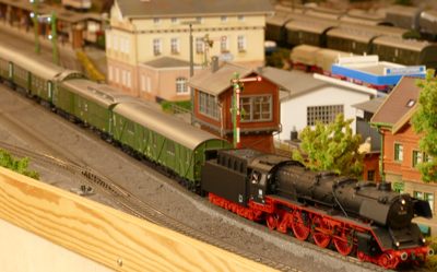 Weil die Anzahl der verschiedenen Züge so immens groß ist, differenziere ich die Site Modellbahn: Züge noch einmal in Schnell- und Eilzüge, Personenzüge, Güterzüge Teil 1 und Teil 2 sowie Triebzüge. Somit lässt sich die Datenmenge am PC besser handhaben. Viel Freude, schöne Erkenntnisse und vielleicht die eine oder andere Anregung beim Betrachten der vielen Fotos wünsche ich Euch. Es versteht sich von selbst, dass ich hier nur Modellbahnzüge meiner Anlage zeige und keine realen Züge der DB. Lasst uns den Geruch von Dampf, Öl, Kohle, Diesel aufsaugen und im Geiste von niedrigen Bahnsteigen mehrere Treppenstufen in die Wagen hinauf klettern, die Koffer mit großer Anstrengung durch schmale Türen hochhieven und uns beeilen beim Einstieg. Der Zug fährt pünktlich ab. Am Sitzplatz erstmal das Fenster öffnen und auf den Bahnsteig schauen. Es gibt immer was zu sehen: andere Loks und Züge, unterschiedlichste Reisende, Kioske, Verkäufer, Bahnhofsgebäude. Erst recht auf der gemütlichen Reise!