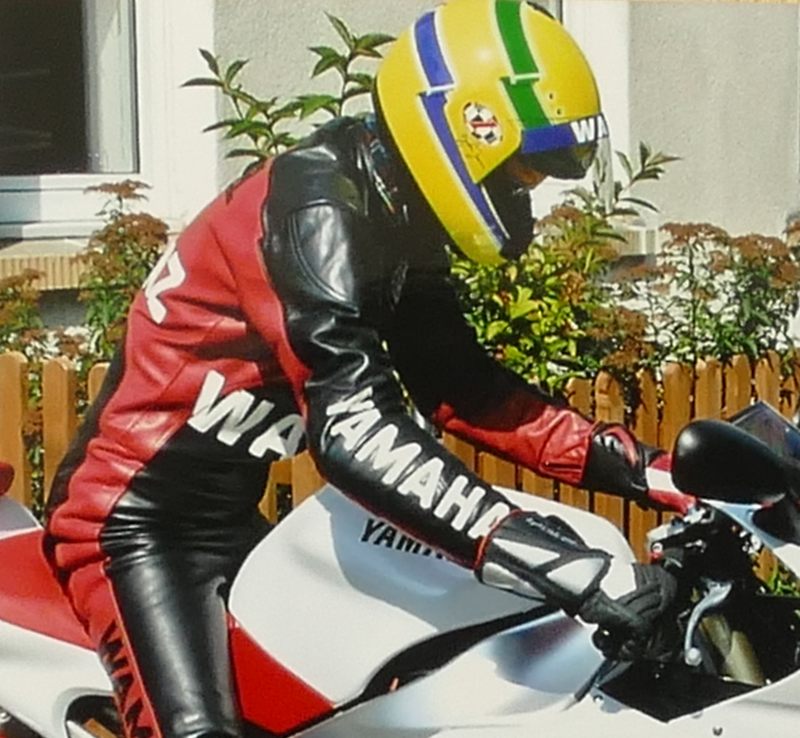 Neben seinen großen Erfolgen auf der Rennstrecke hat Barry Sheene durch seinen etwas anderen Fahrstil eine neue Ära eingeleitet. Paul Smart fing damit an und Sheene adaptierte es: das sogenannte Hanging Off, das Sich-in-die-Kurve-lehnen, dazu noch das ausgestellte Knie zur Innenseite einer Kurve. Ich weiß noch genau, wie ich beim Versuch es zu trainieren, ein Loch in das linke Knie meiner ersten Lederkombi gefahren habe. Das Foto dazu nahm mein Bruder Raimund auf. Schauplatz: der Dixie-Parkplatz in Büren.