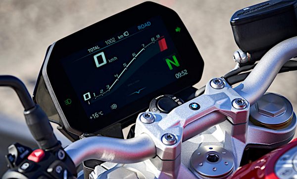Bemerkung: Motor der neuen S1000RR, hier mit deutlich weniger Leistung, aber mehr Drehmoment in unteren Drehzahlregionen. Ohne Shift-Cam-Technologie. Serienmäßig mit: Kurven-ABS, dyn. TCS mit Wheelie-Control, Berganfahrhilfe, LED-Licht, 6,5″ TFT.